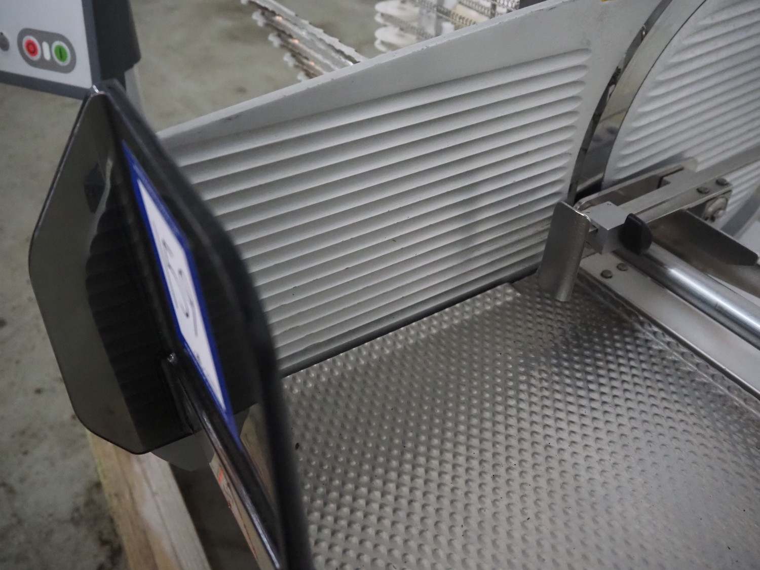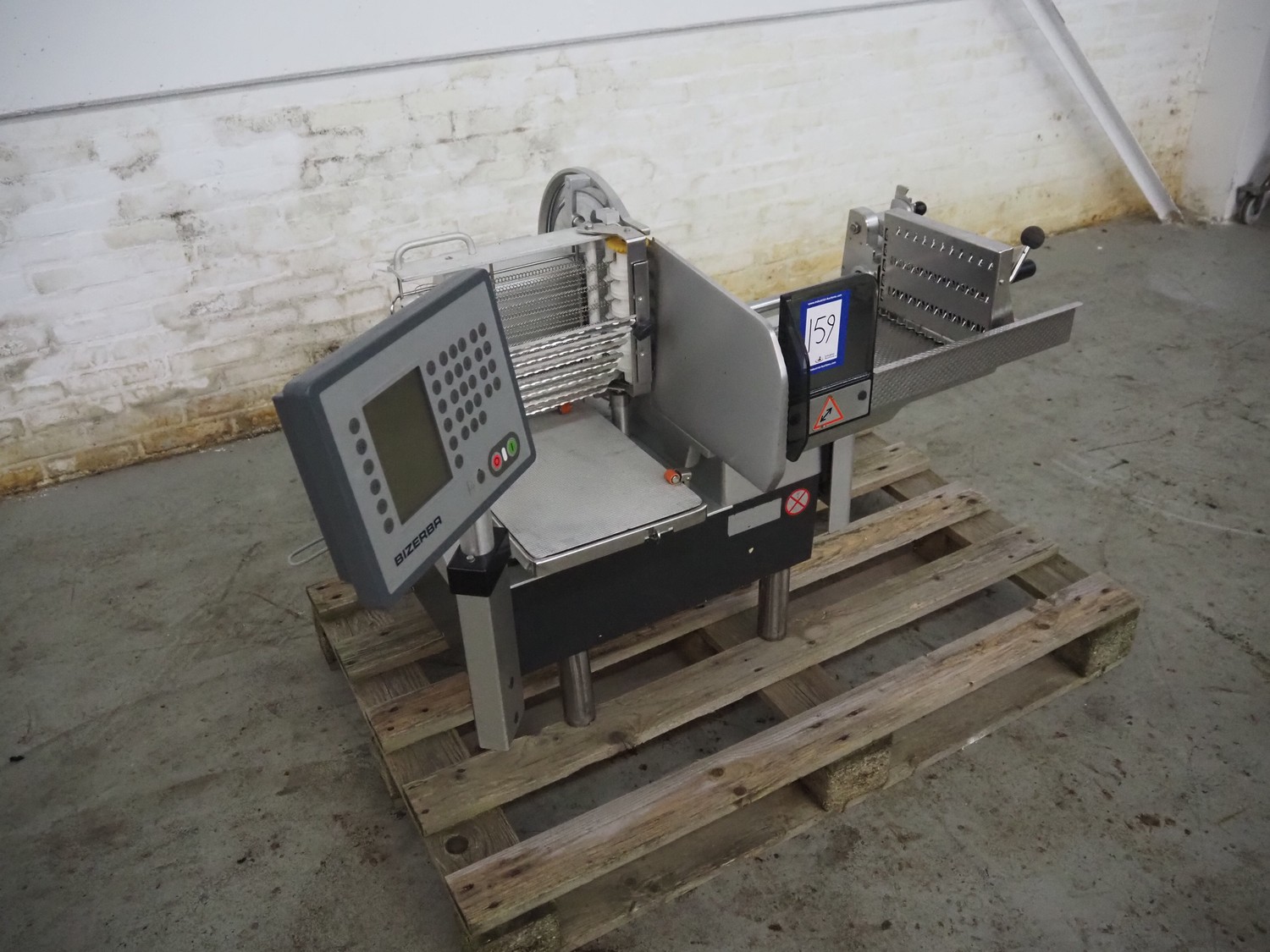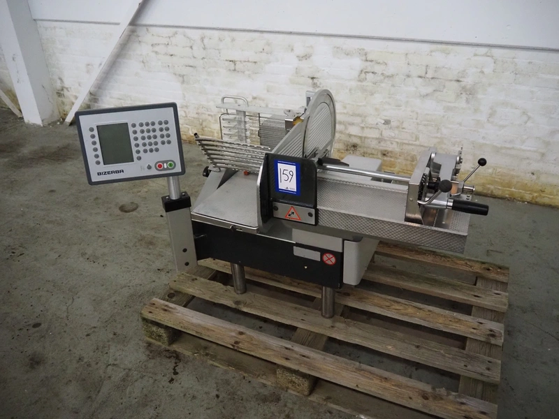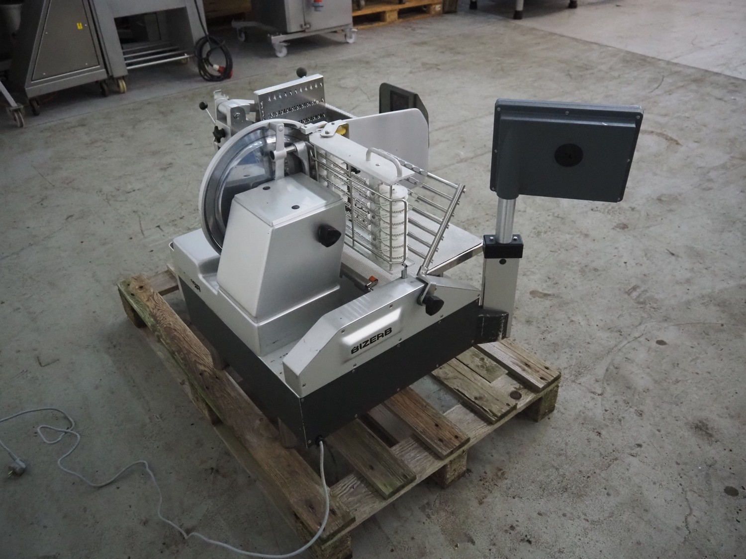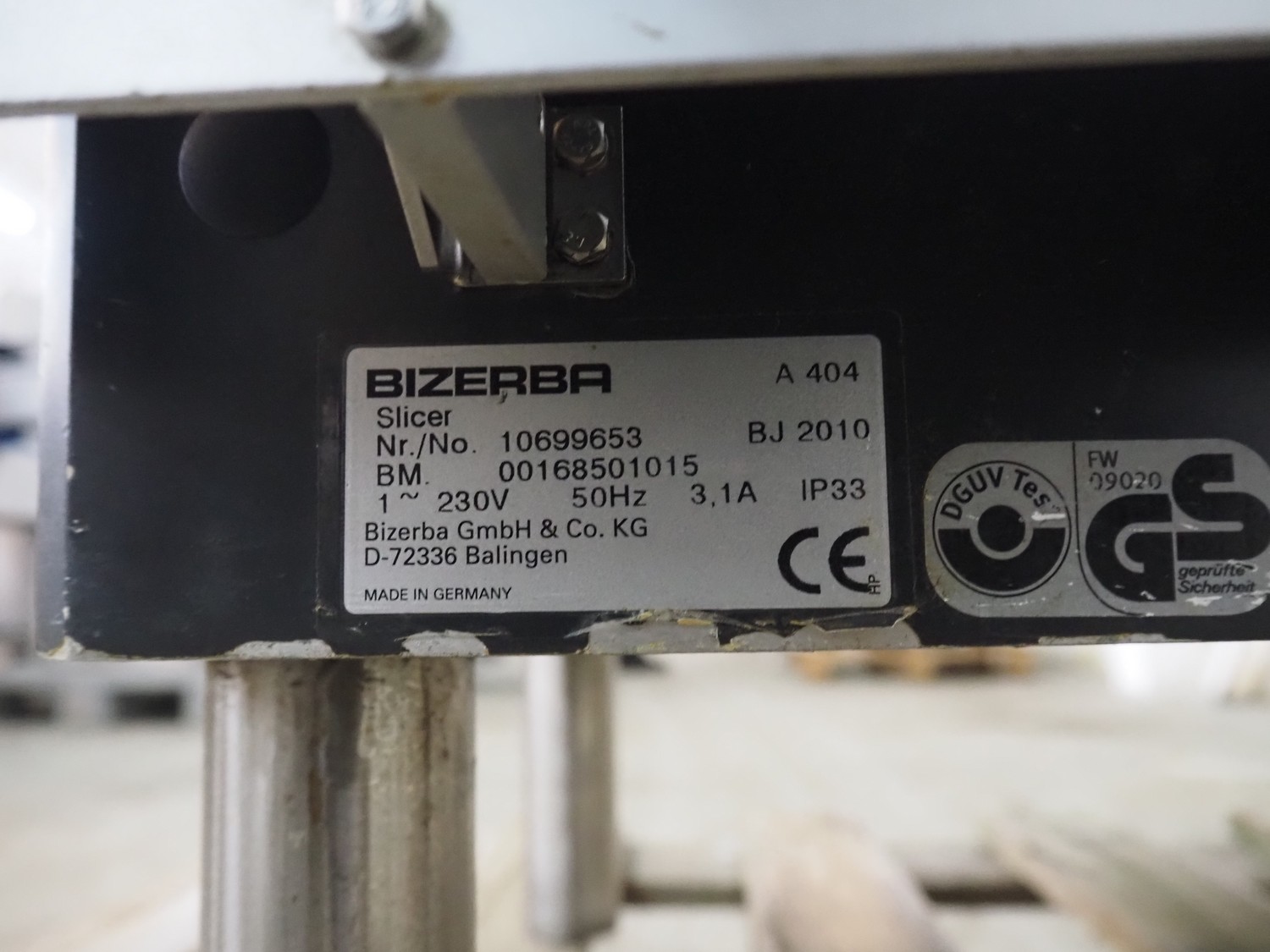 Bizerba automatic slicer, type: A 404, number: 10699653, year of construction: 2010, 230 V, 1 Ph, 50 Hz, 3.1 A, dimensions: 1160 mm x 850 mm x 760 mm.