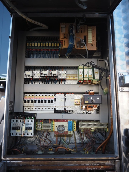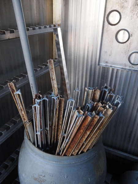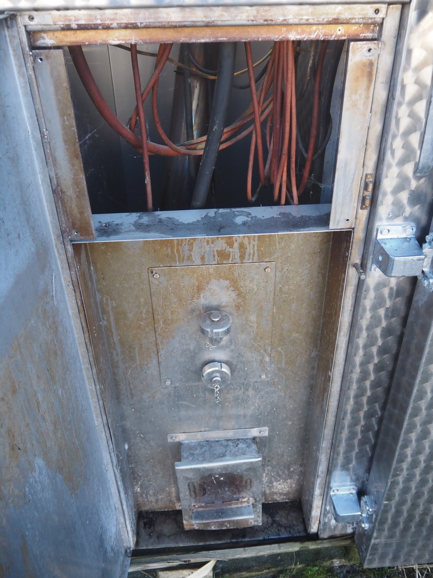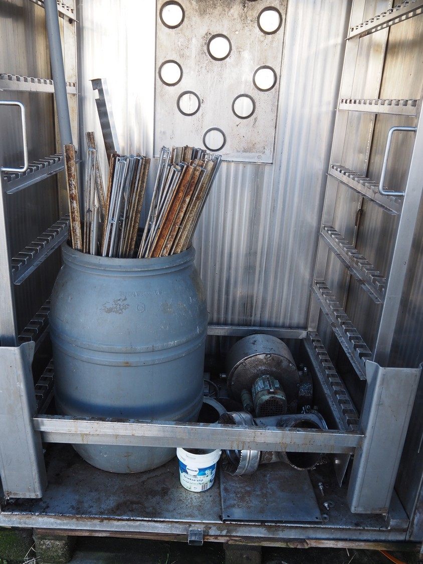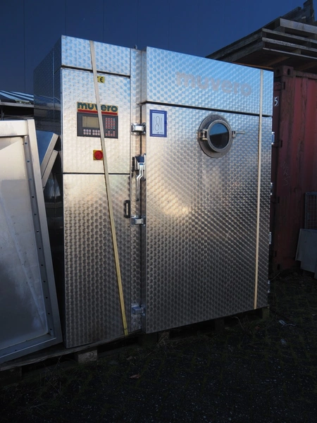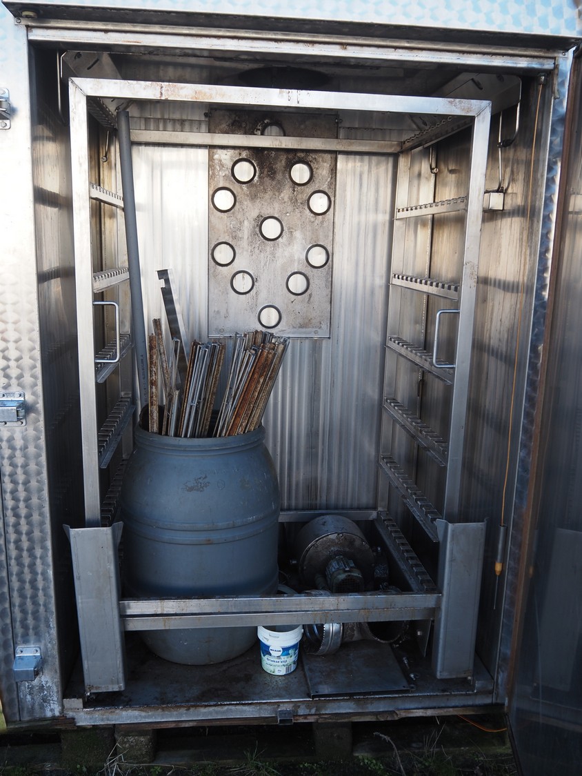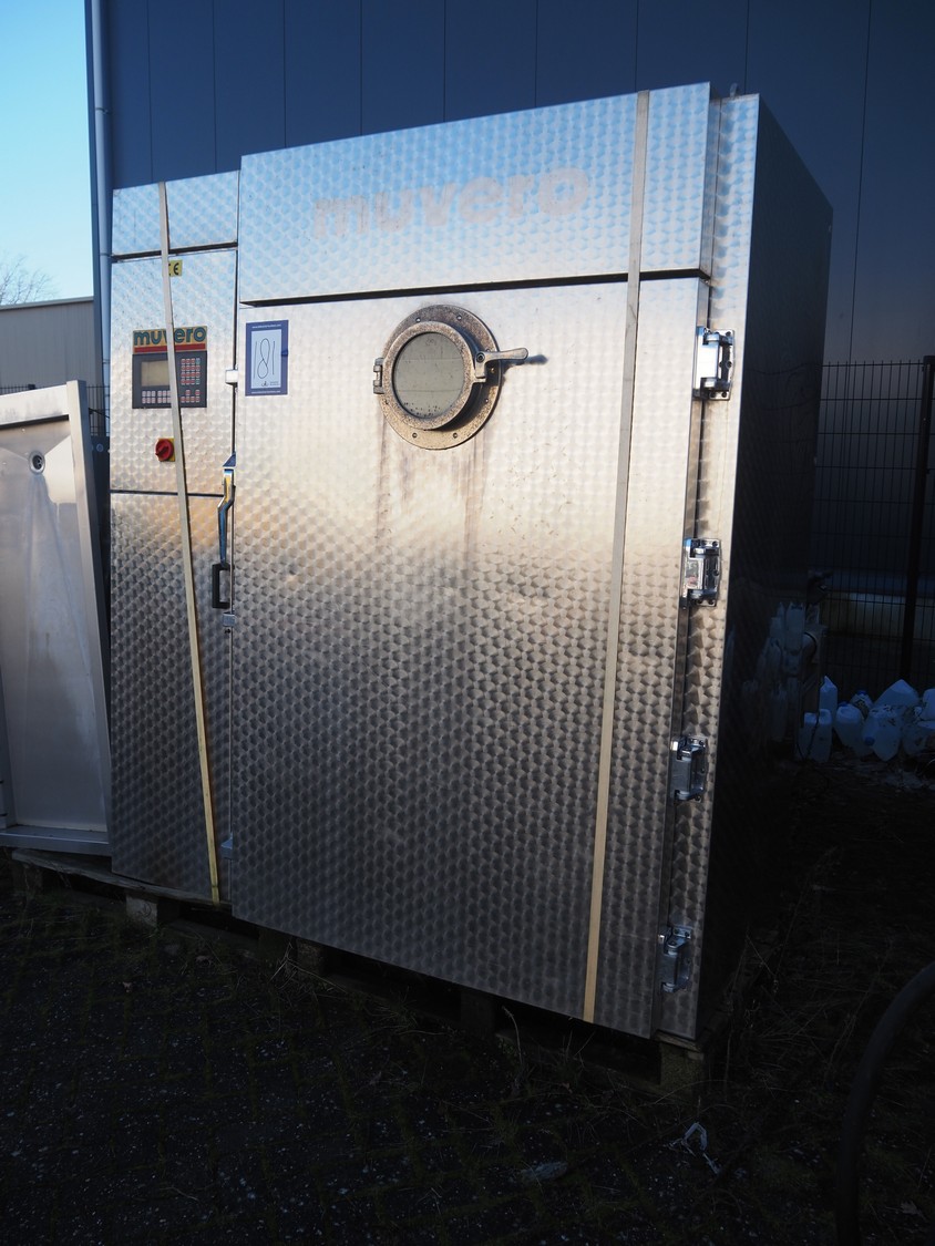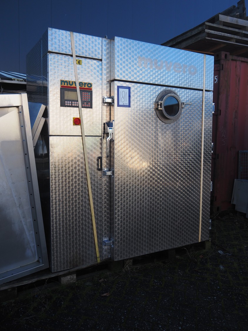 Muvero smoking chamber for 1 trolley with smoke generator, type: 1500 VN-81 ING, fabrication number: 950108, year of construction: 1995, 380 V, 50 Hz, volume: 1720 liter, dimensions 1940 mm x 1000 mm x 2250 mm. Including 1 trolley, 7 floors, floor dimensions: (7x) 940 mm x 700 mm, total dimensions: 1020 mm x 740 mm x 1590 mm and aluminium Y-shaped smoke sticks, smoke stick length: 1000 mm.