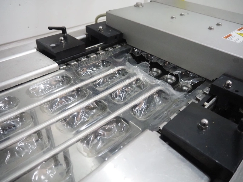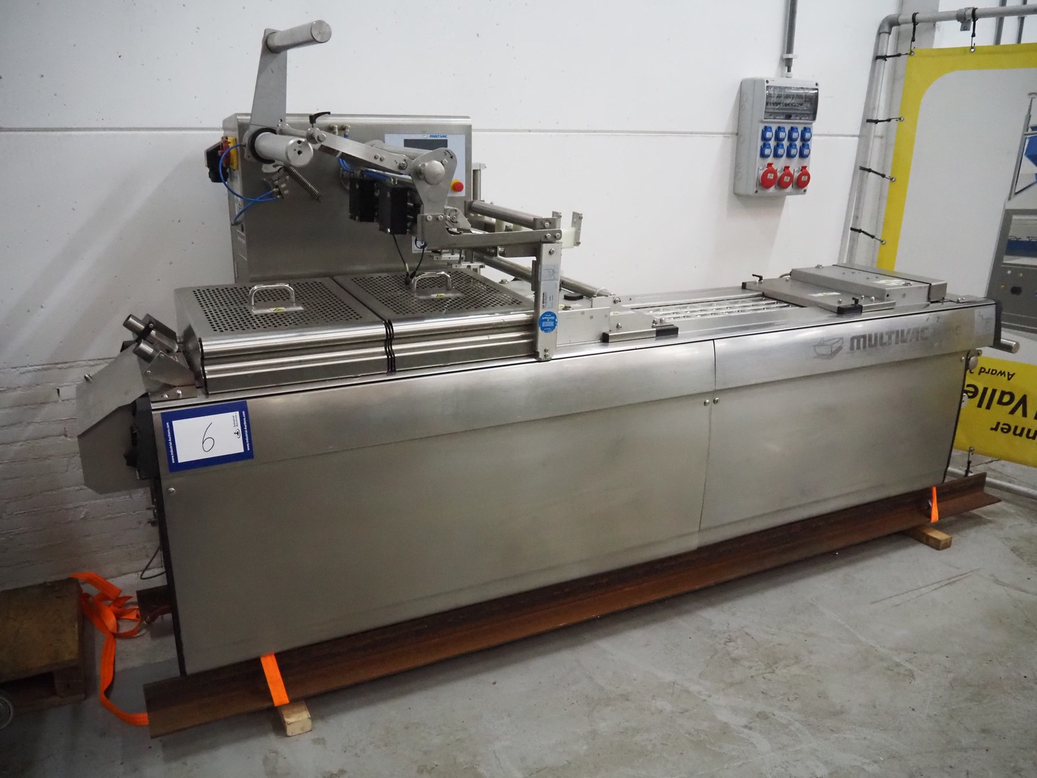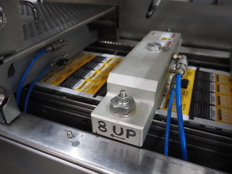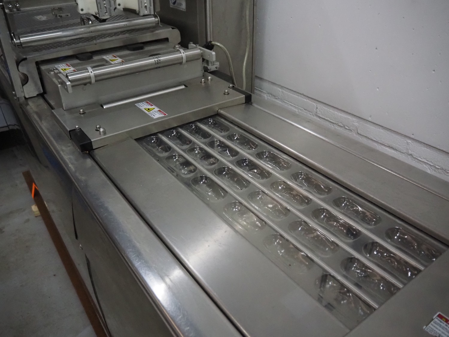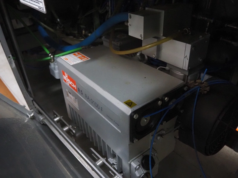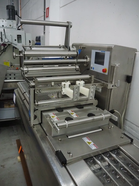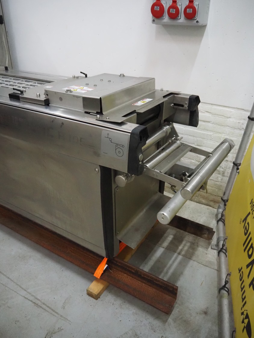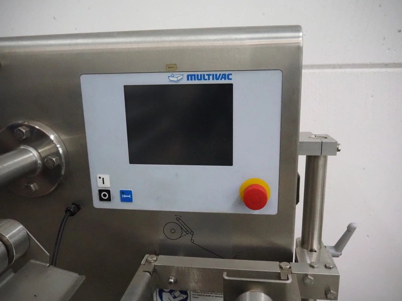 Multivac thermoformer, model: R105, serial number: 128952, year of construction: 04/2009, 220 V, 3 Ph, 60 Hz, 35 A, 6 kW, film width: 380 mm, dye dimensions: (8x) 100 mm x 47 mm x 30 mm, with Busch vacuum pump, type: RA 0100 F 503, capacity: 120 m³ per hour, total dimensions: 3250 mm x 1000 mm x 1880 mm.
