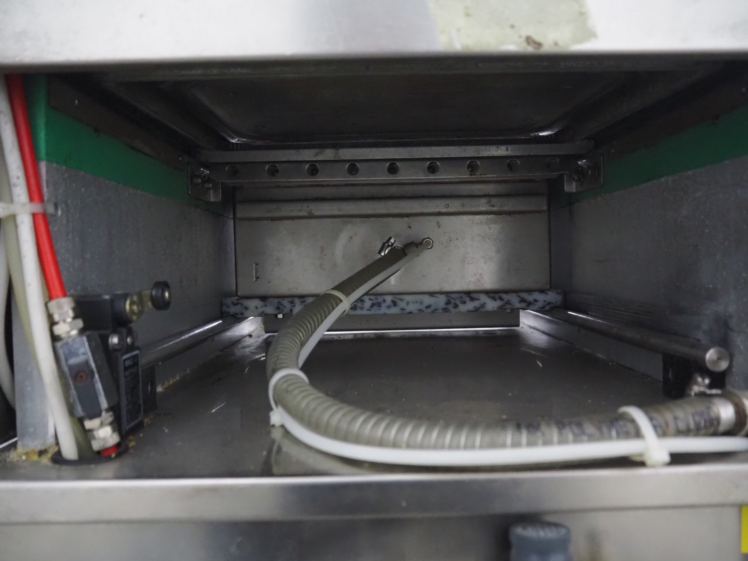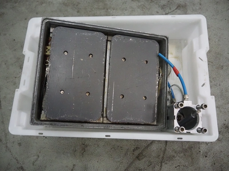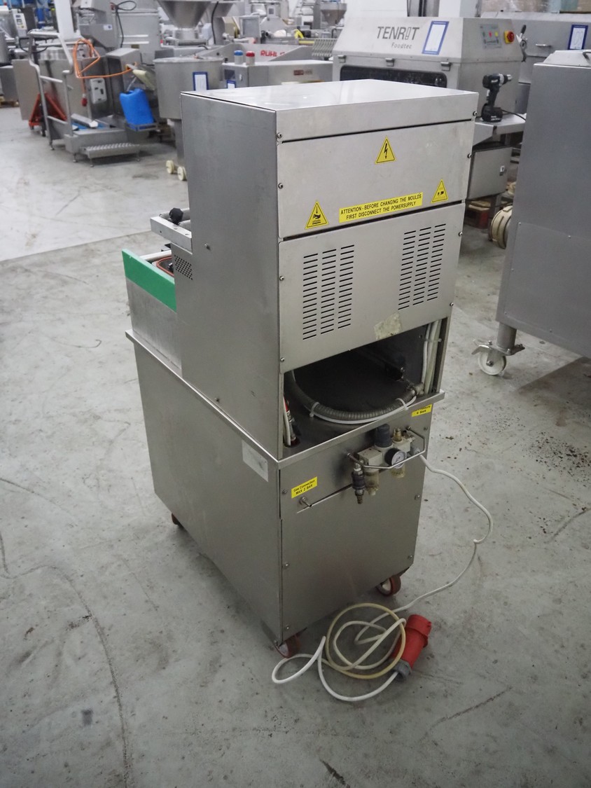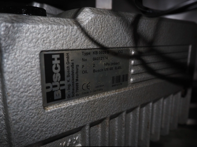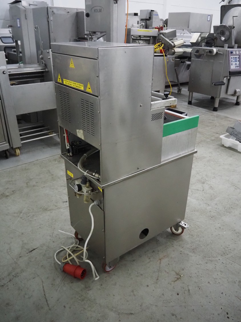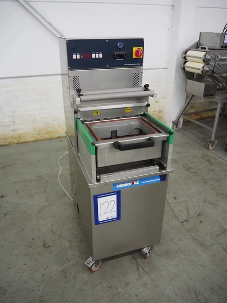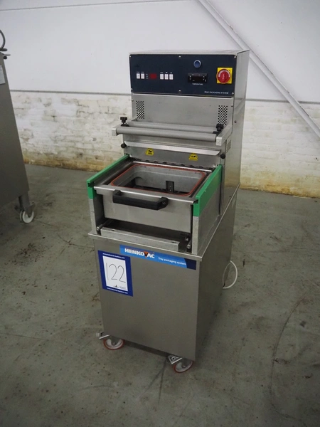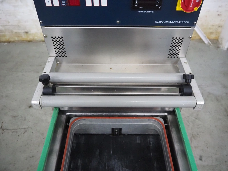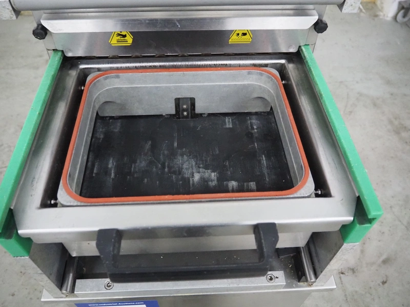 HFE vacuum systems BV mobile traysealer, maximum film width: 380 mm, dye: 305 mm x 250 mm, Busch vacuum pump, type: KB 0020 D, capacity: 20 m³ per hour, total dimensions: 800 mm x 980 mm x 1300 mm. Including extra dye set, dye: (2x) 235 mm x 145 mm.
