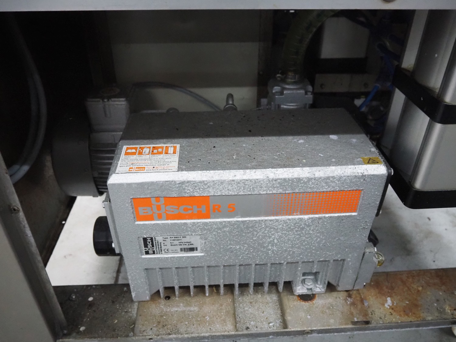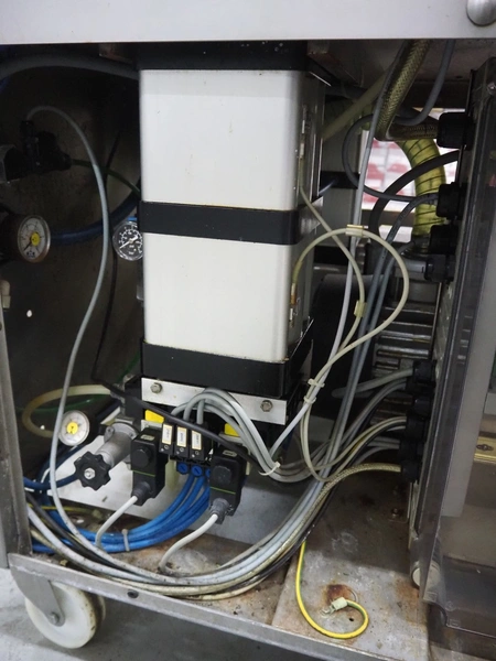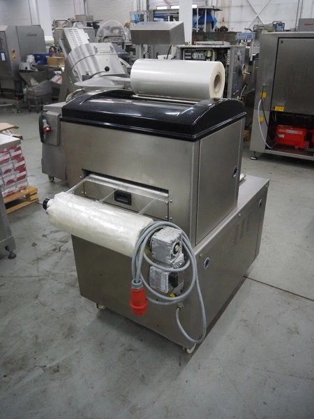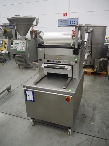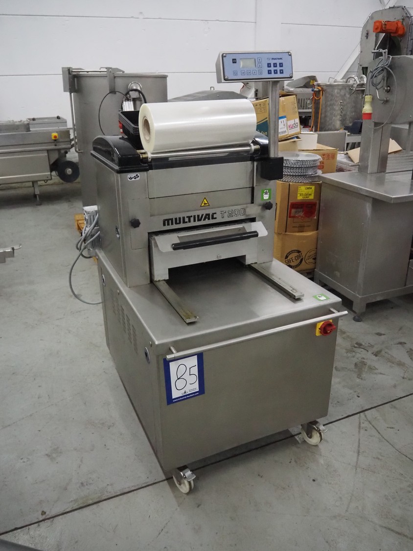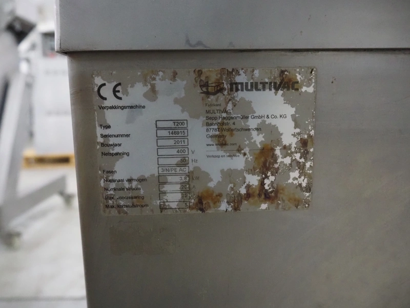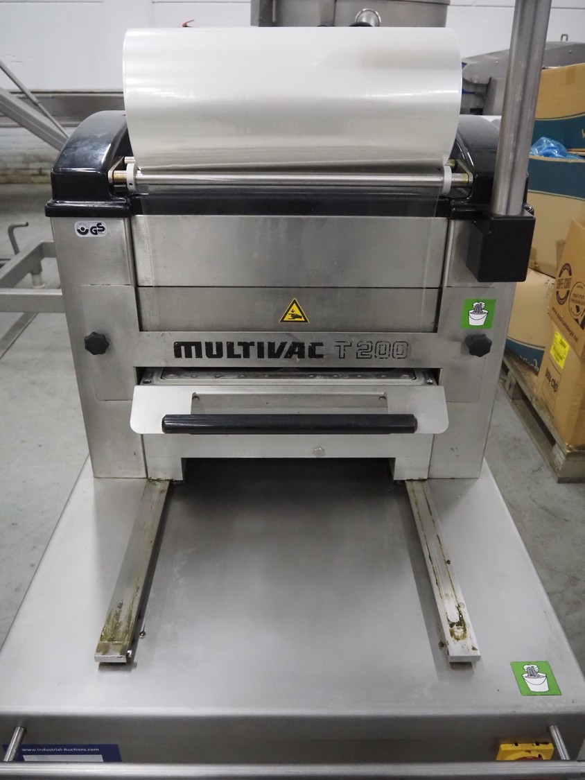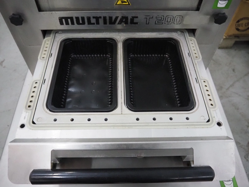 Multivac mobile traysealer, type: T200, serial number: 146915, year of construction: 2011, 400 V, 3 Ph, 50 Hz, 20 A, 3.8 kW, dye: (2x) 270 mm x 175 mm, Busch vacuum pump, type: RA 0063 F 503, number: 110014477, capacity: 63 m³ per hour, total dimensions: 1270 mm x 800 mm x 1610 mm. Including pallets with trays.