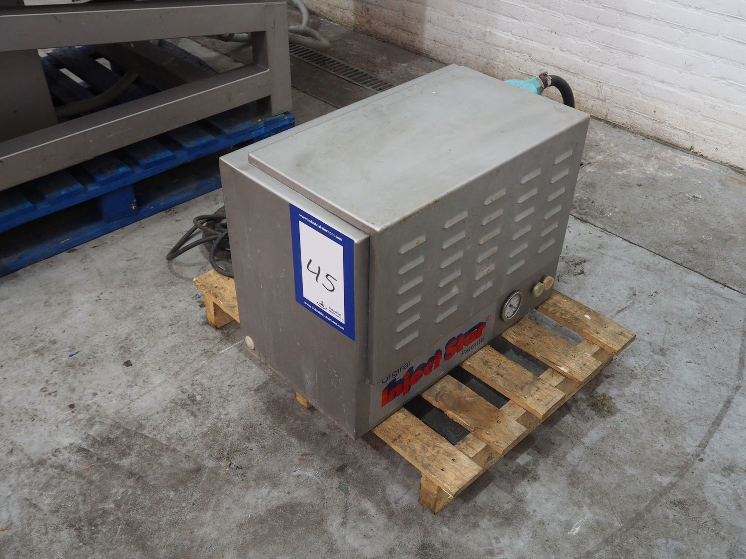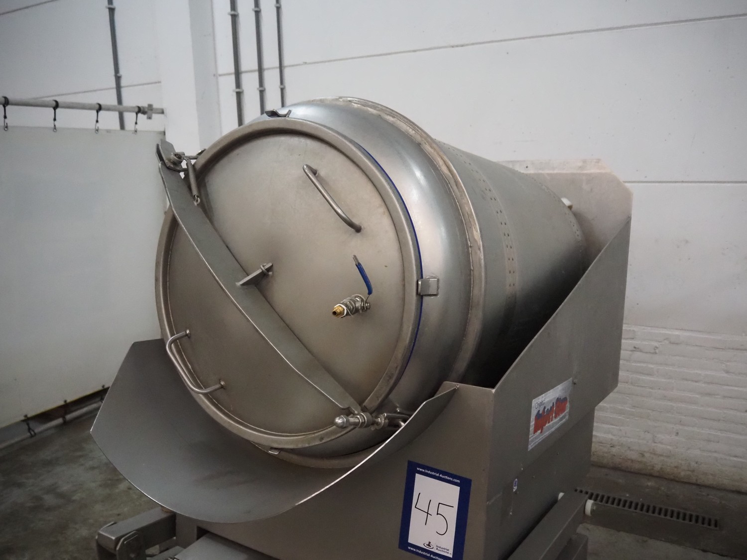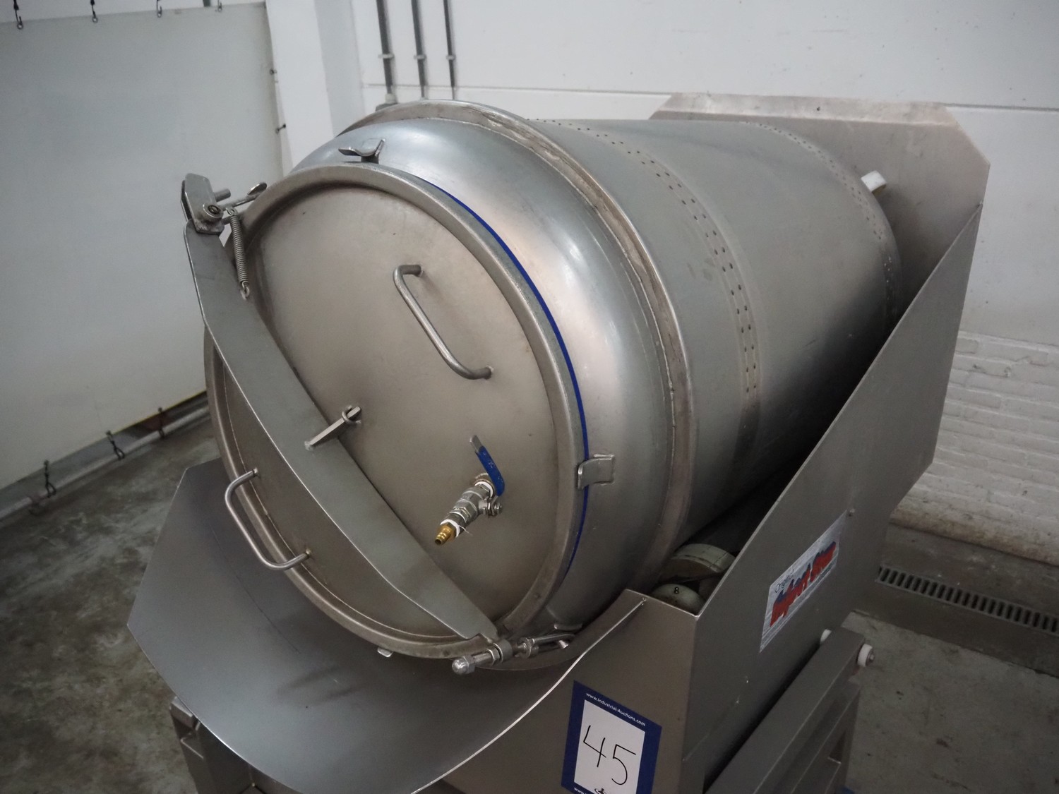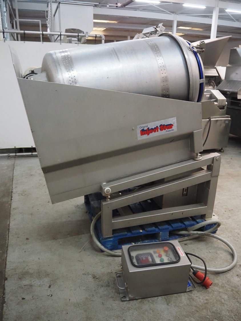 Inject Star vacuum tumbler, type: HSL-750-TC-10, number: 272, year of construction: 2000, 400 V, 3 Ph, 50 Hz, 3.8 kW, volume: 750 liter, weight: 760 kg, dimensions: 1800 mm x 1000 mm x 1780 mm. Inject star vacuum pump, type: TVAP, 380 V, 3 Ph, 50 Hz, 0.75 kW, dimensions: 710 mm x 360 mm x 460 mm.