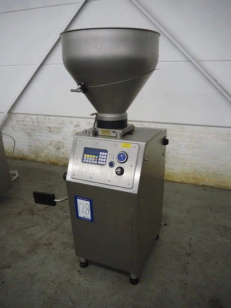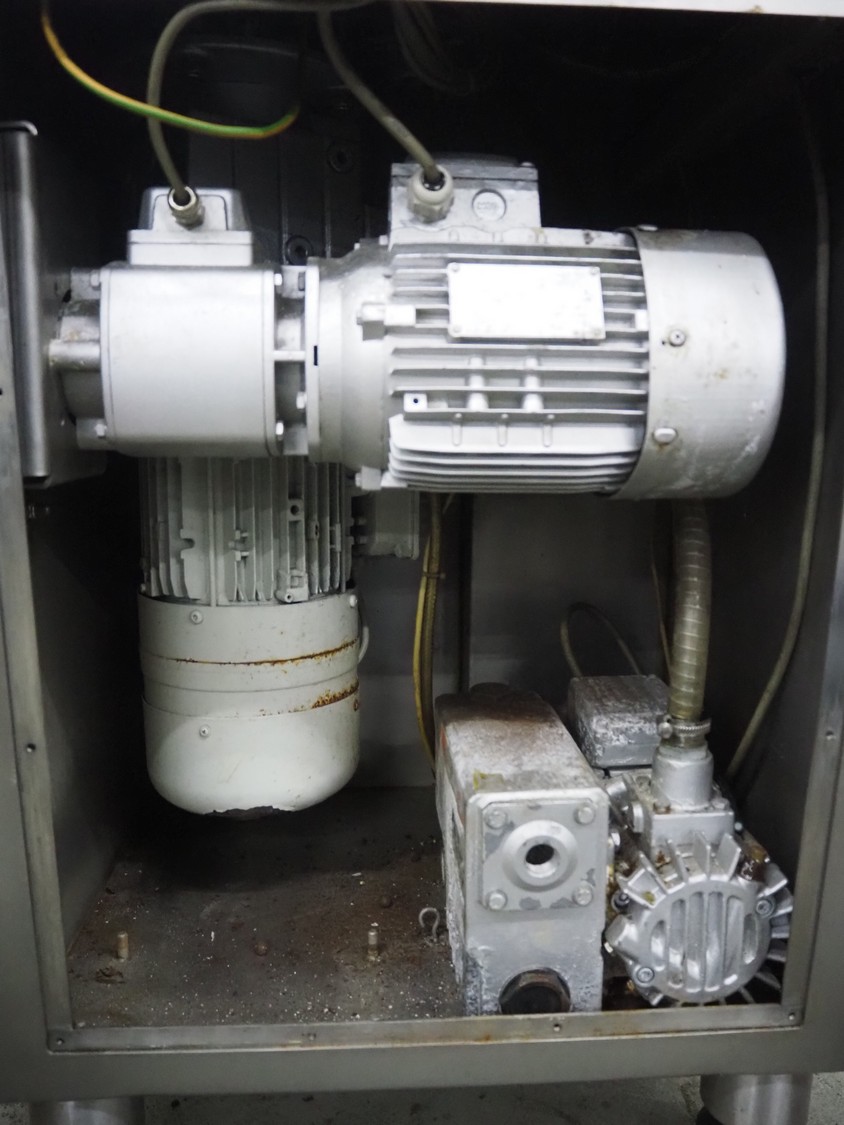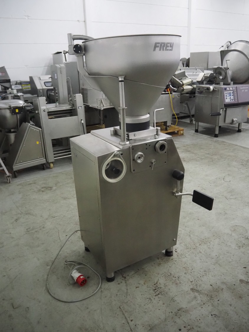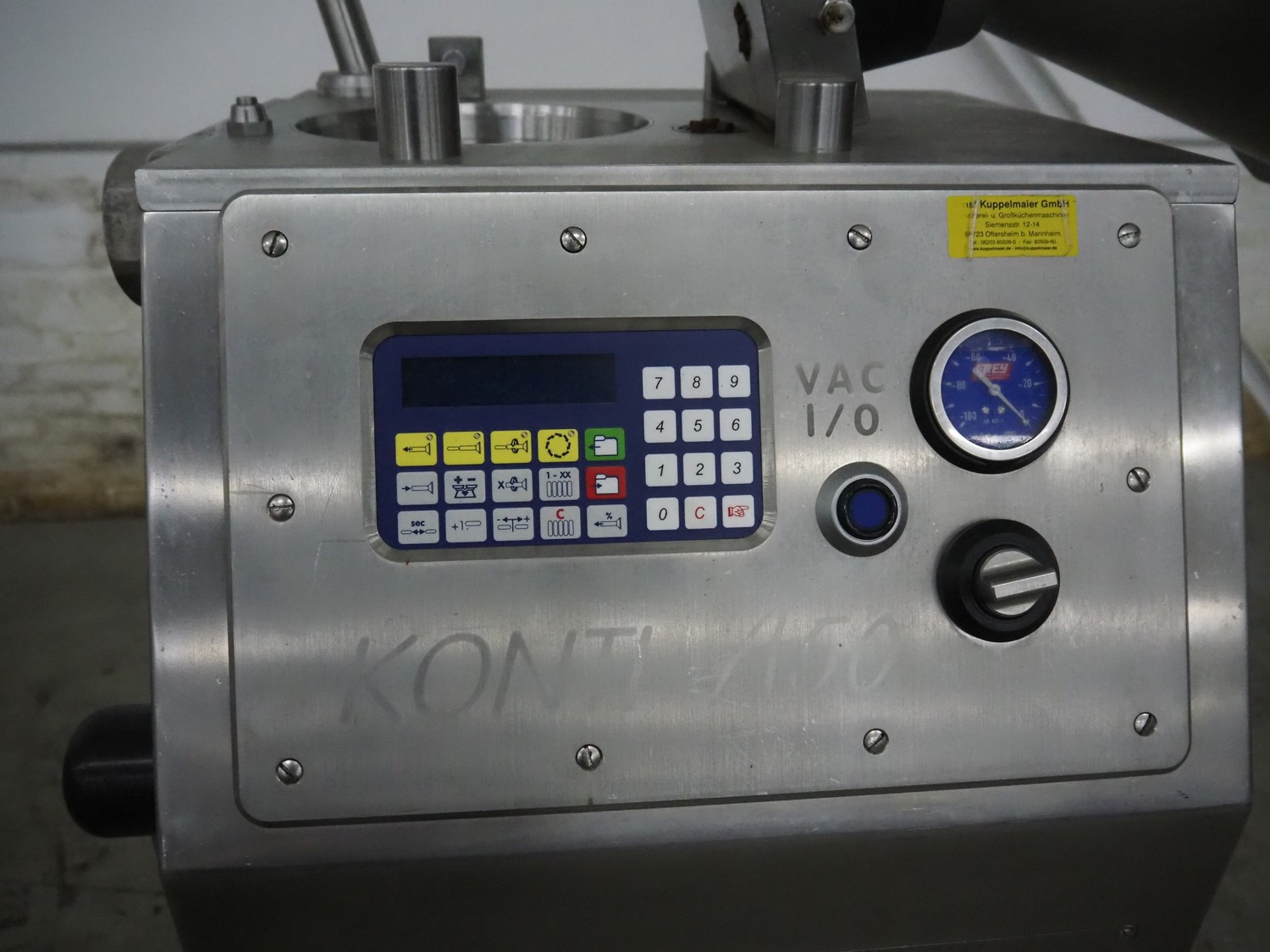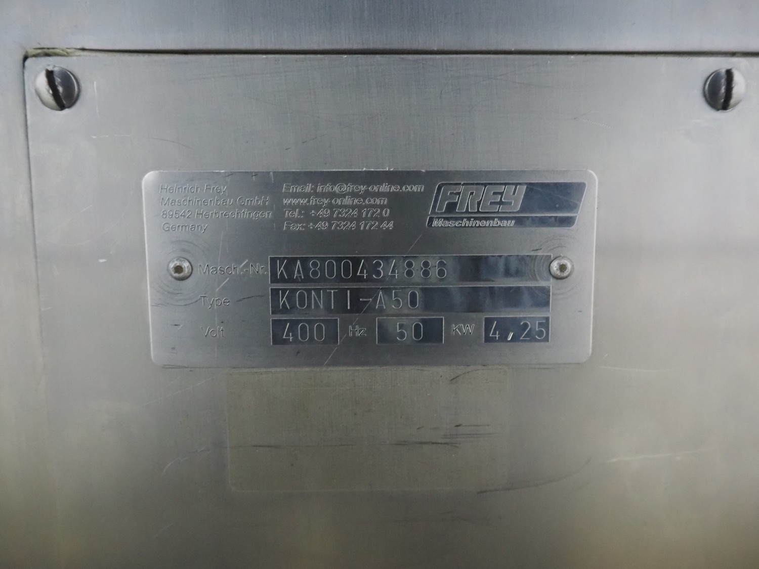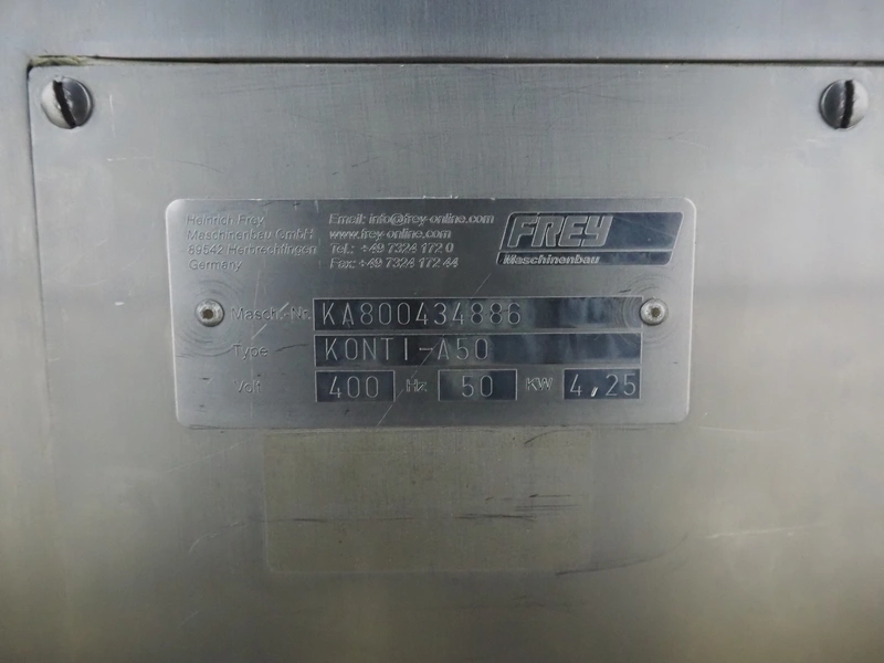 Frey Maschinenbau GmbH vacuum filling machine, type: Konti-A50, machine number: KA800434886, 400 V, 50 Hz, 4,25 kW, Busch vacuum pump, type: KC 0016 E 3Z0, capacity: 16 m³ per hour, total dimensions: 900 mm x 800 mm x 1800 mm.