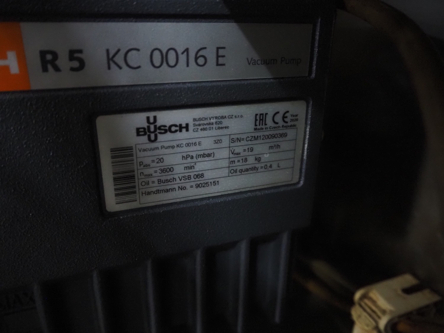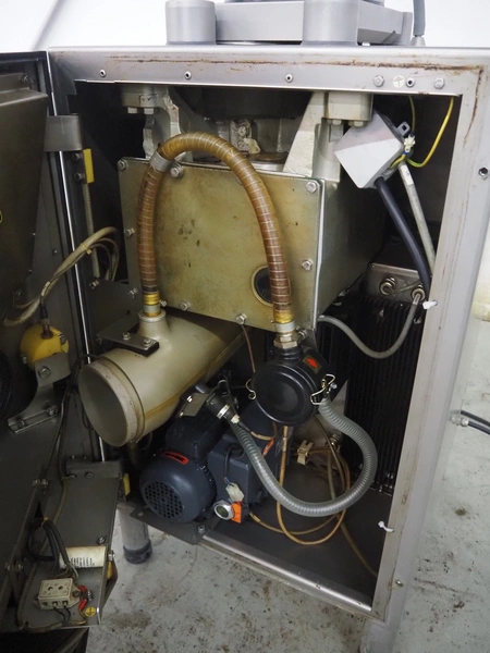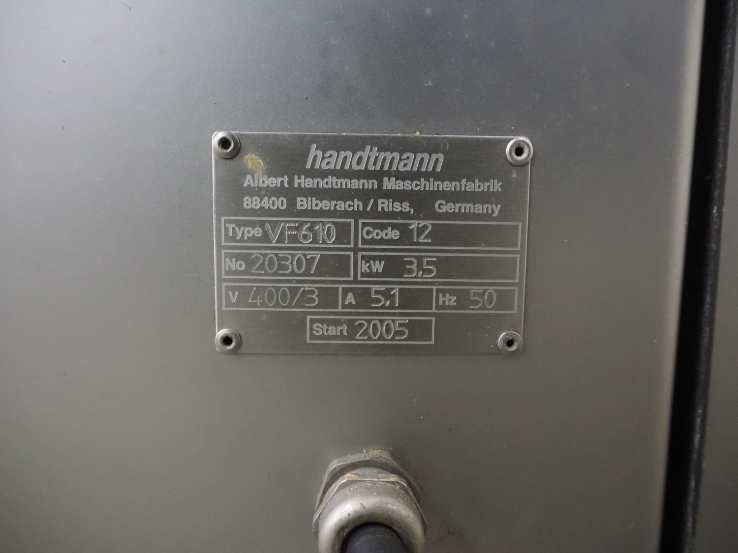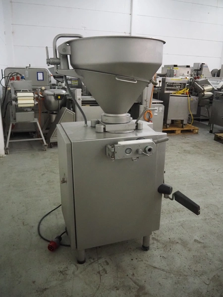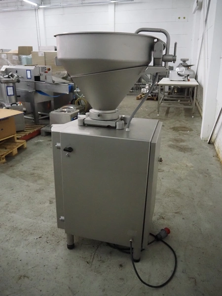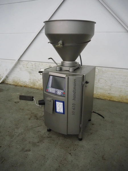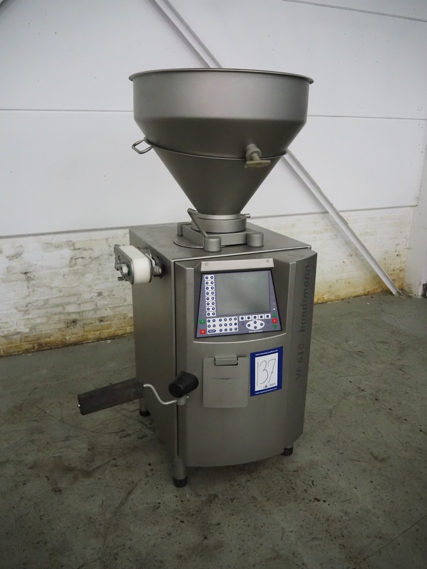 Handtmann vacuum filling machine with linking attachment, type: VF610, number: 20307, year of construction: 2005, 400 V, 3 Ph, 50 Hz, 3.5 kW, 5.1 A, linking attachment type: 34-5, number: 14137, Busch vacuum pump, model: KC 0016 E, capacity: 16 m³per hour, dimensions: 1150 mm x 950 mm x 1730 mm.