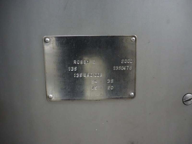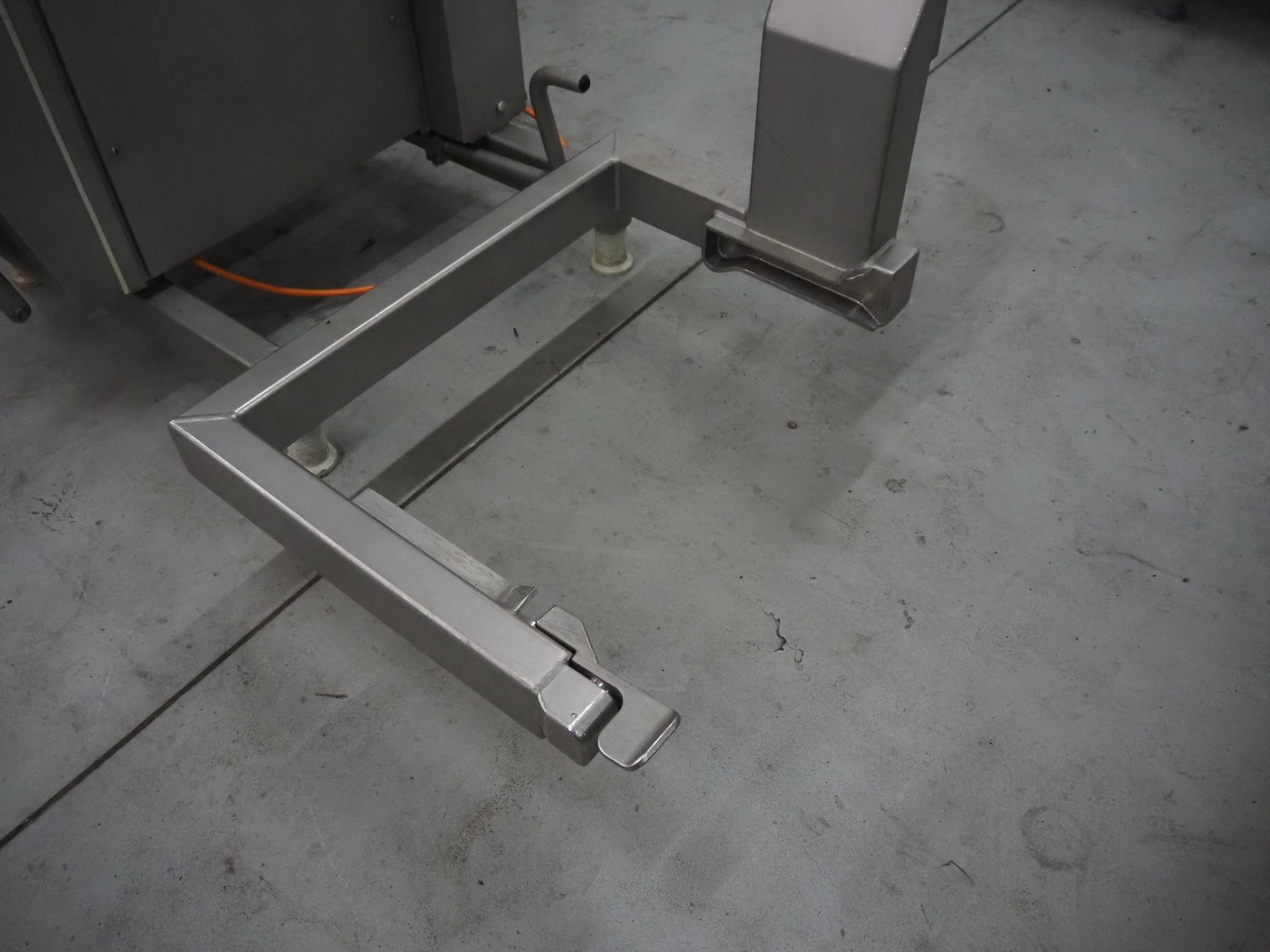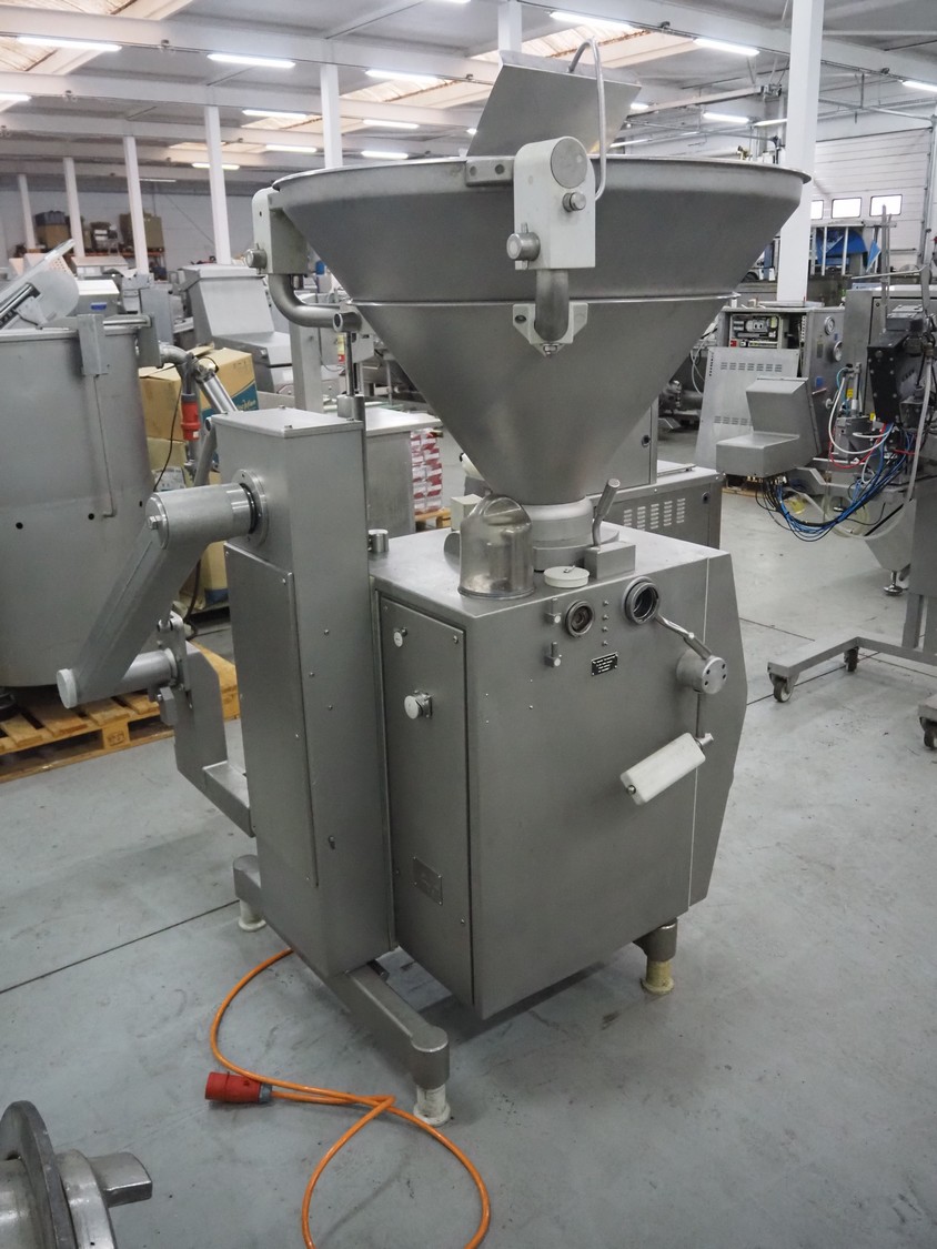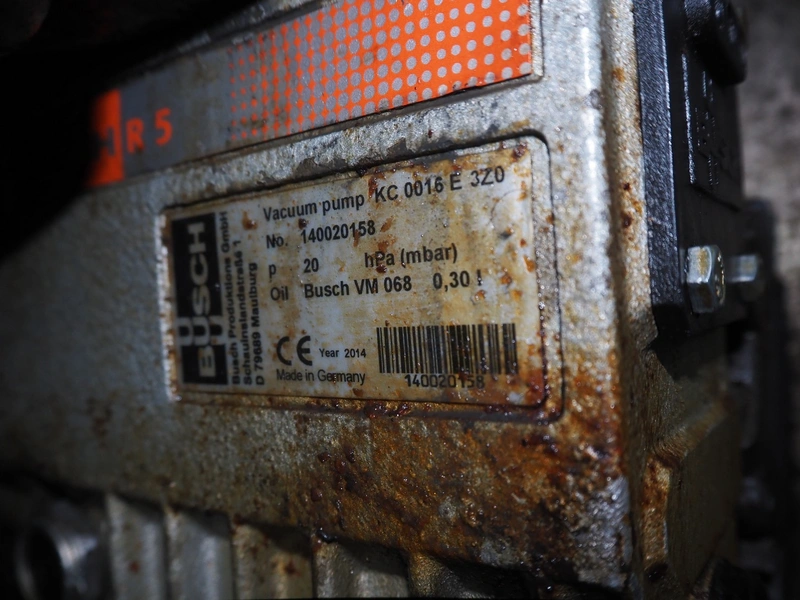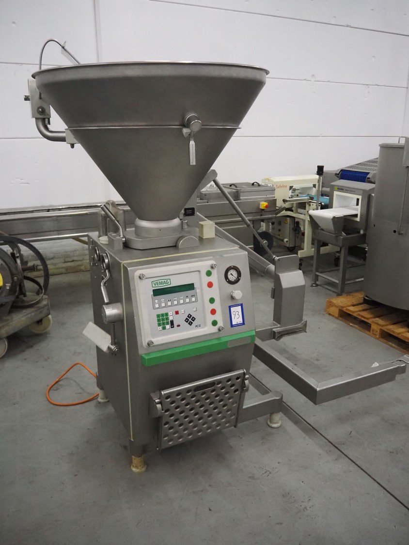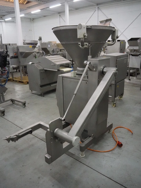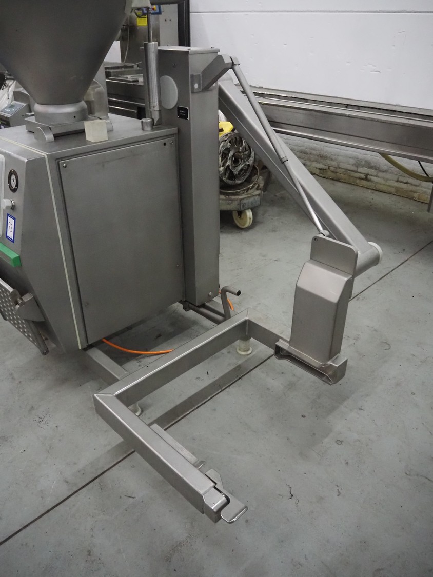 Vemag vacuum filling machine with lifter for 200 liter meat bins, model: Robby 2, type: 135, number: 1350478, year of construction: 2000, Busch vacuum pump, type: KC 0016 E 320, number: 140020158, year of construction: 2014, capacity: 16/19 m³ per hour, dimensions: 1800 mm x 1300 mm x 2000 mm.