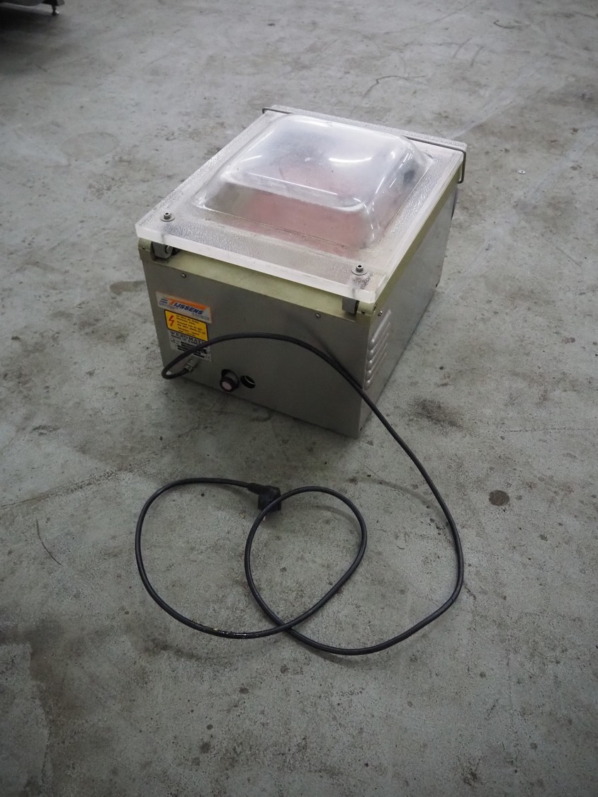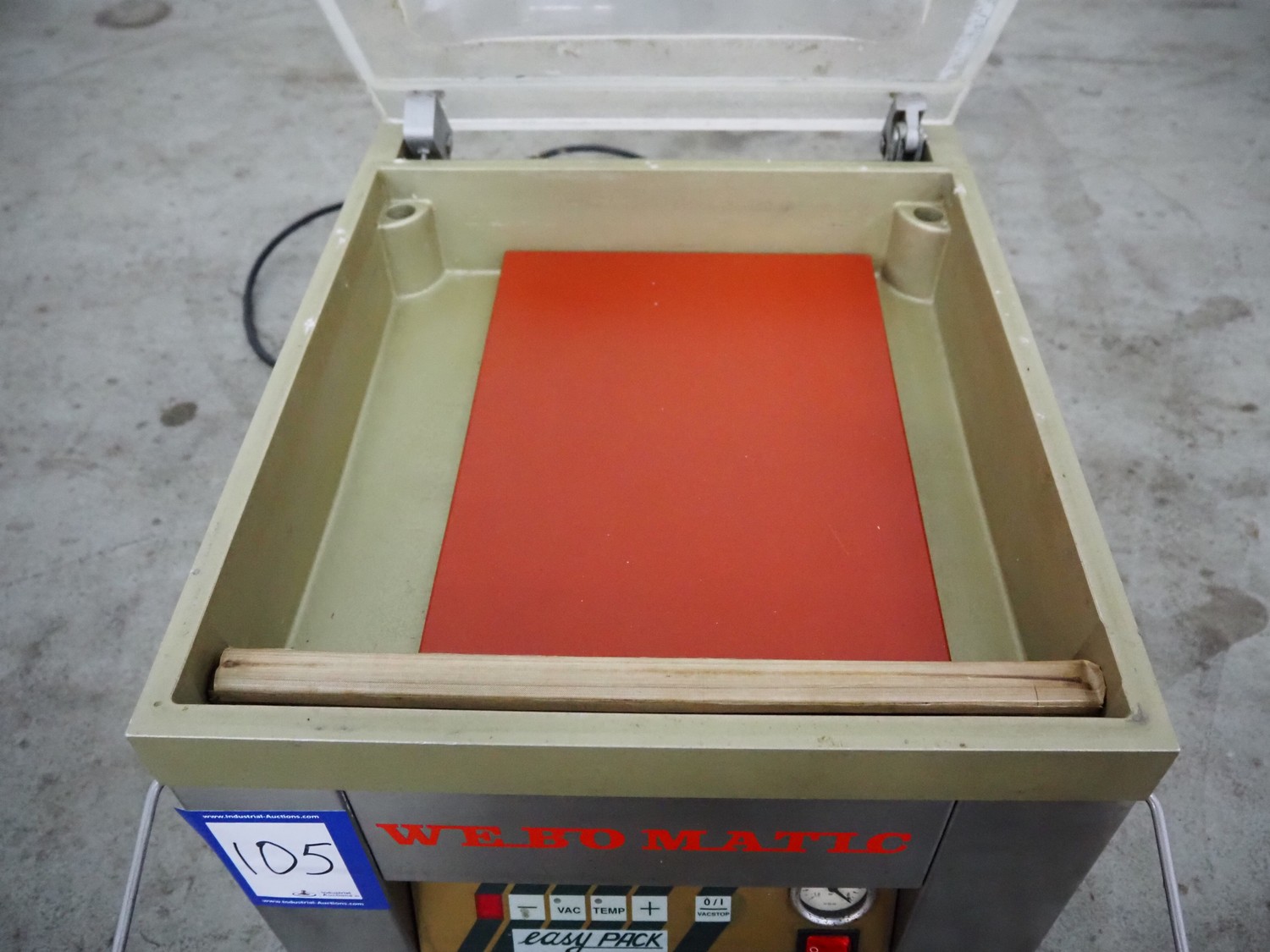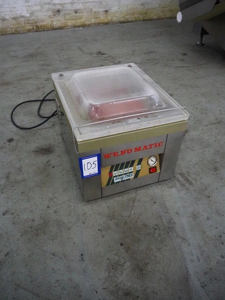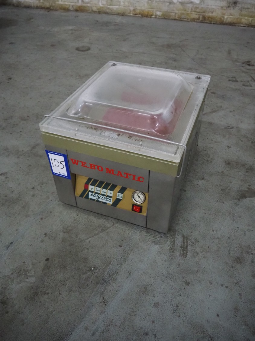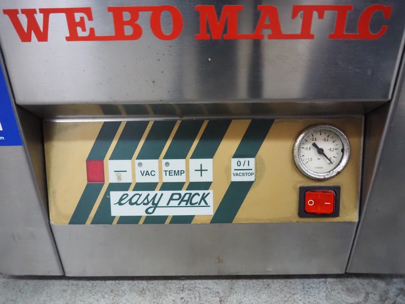 Webomatic vacuum machine, type: EASY-PACK, serial number: 05EA630, 230 V, 50 Hz, 4.1 A, 0.55 kW, 16 m³ per hour, seal length: 370 mm, chamber dimensions: 360 mm x 370 mm, total dimensions: 500 mm x 400 mm x 370 mm.