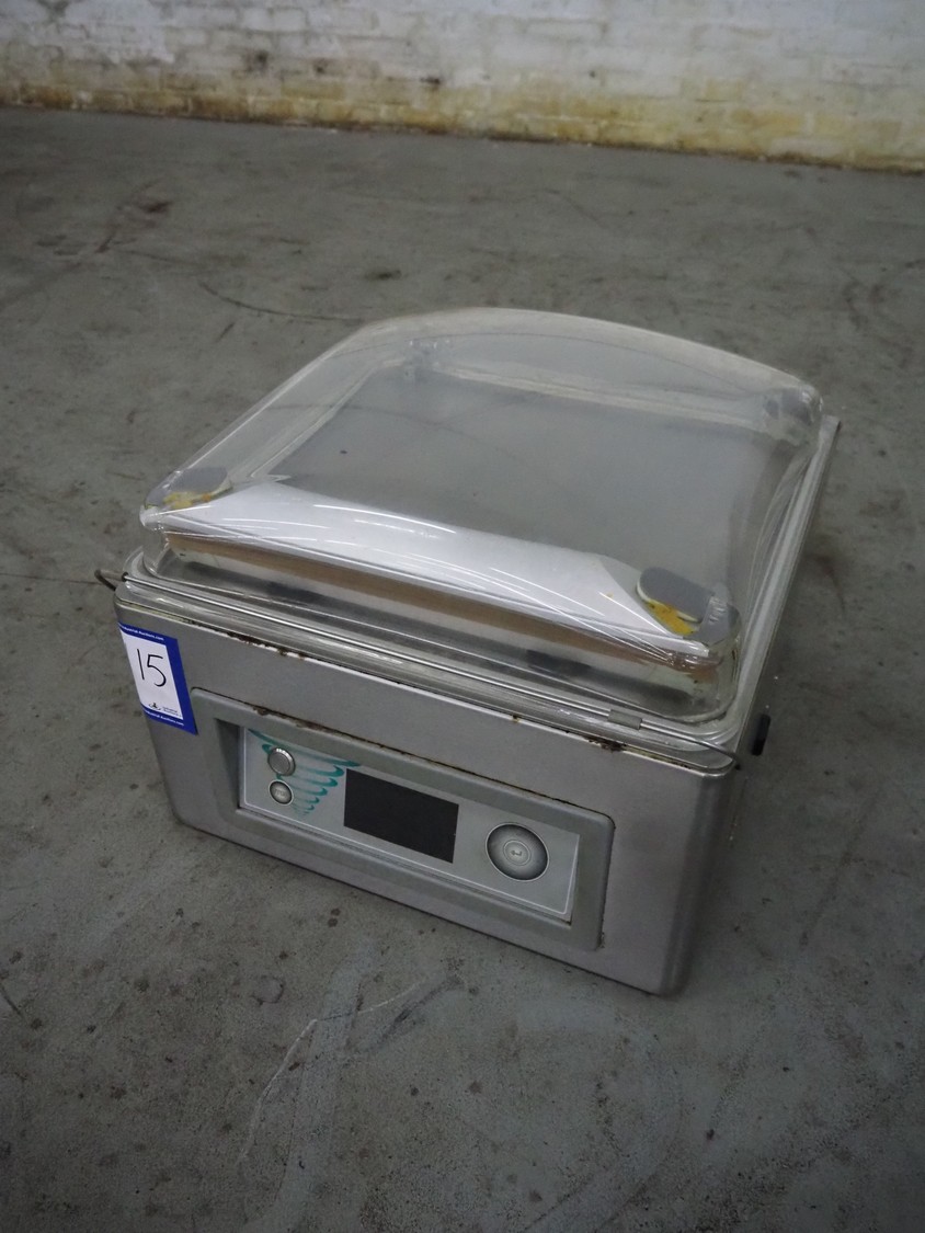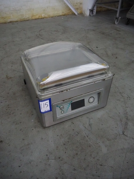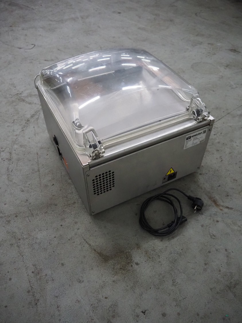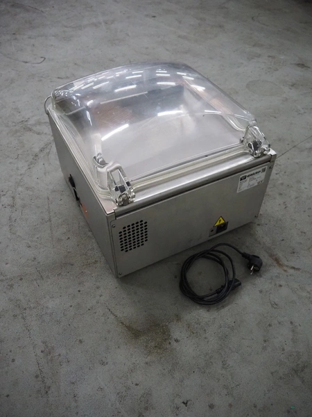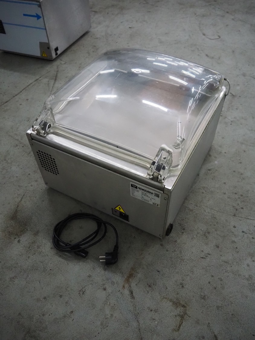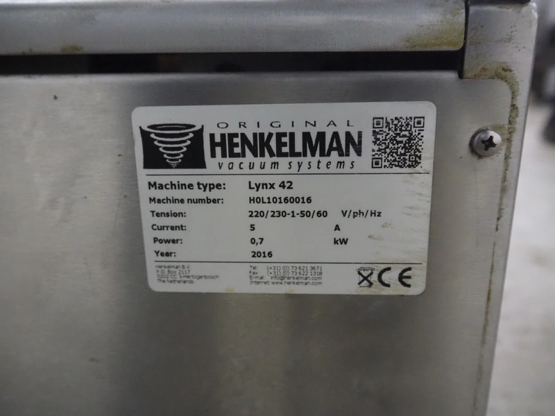 Henkelman vacuum machine, type: Lynx 42, machine number: H0L10160016, year of construction: 2016, 220/230 V, 1 Ph, 50/60 Hz, 5 A, 0.7 kW, seal length: 430 mm, chamber: 430 mm x 370 mm, total dimensions: 520 mm x 500 mm x 400 mm.