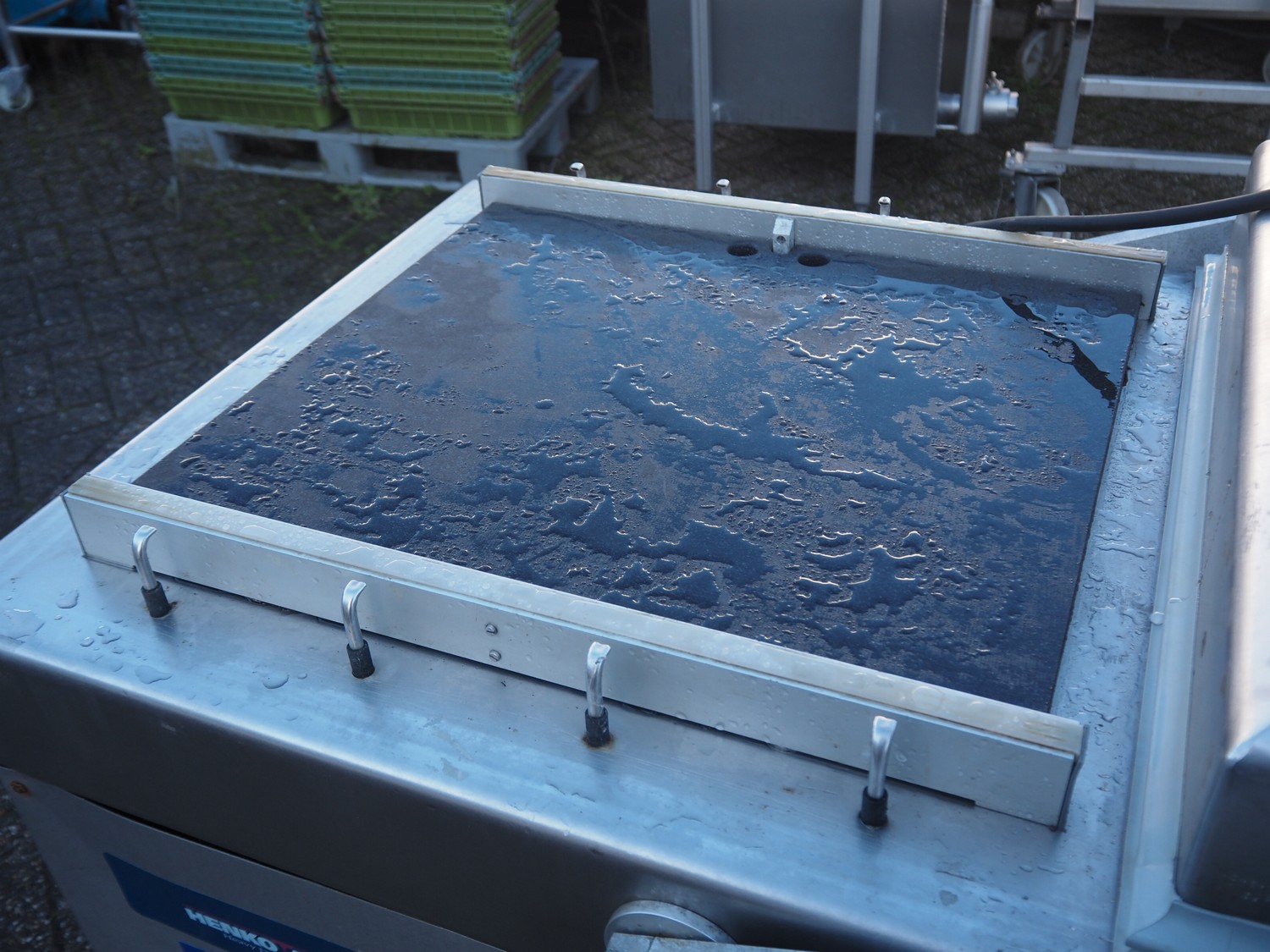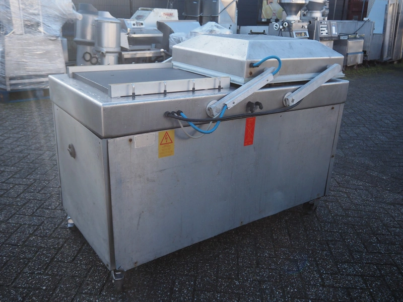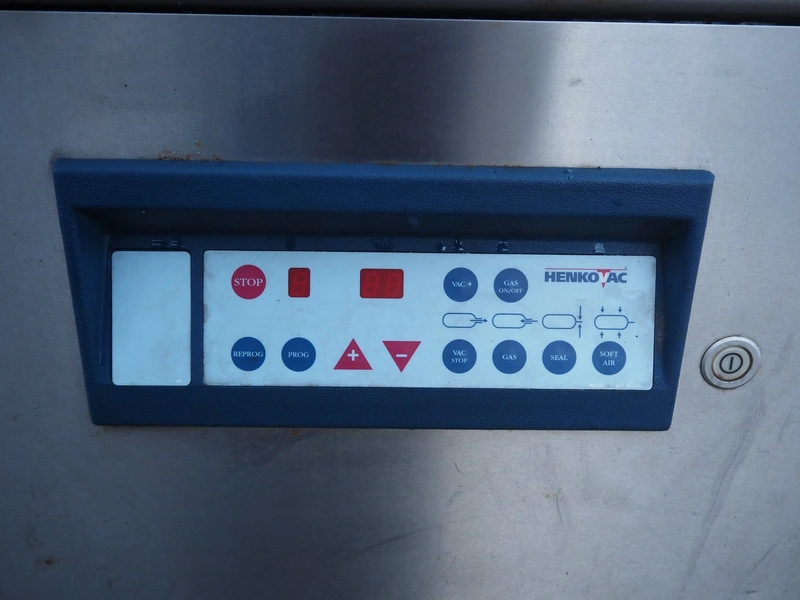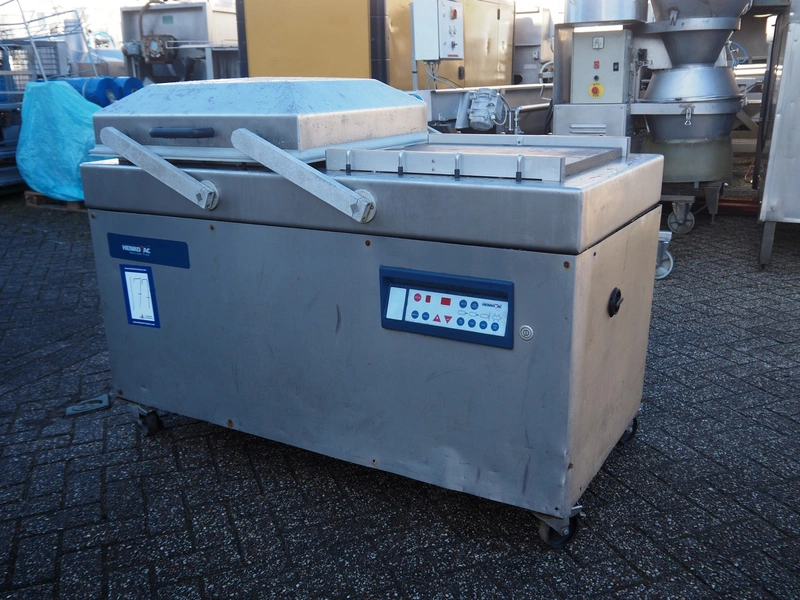 Henkovac mobile double chamber vacuum machine, seal length: (4x) 620 mm, chamber dimensions: (2x) 520 mm x 600 mmm, vacuum pump, total dimensions: 1600 mm x 870 mm x 1150 mm.