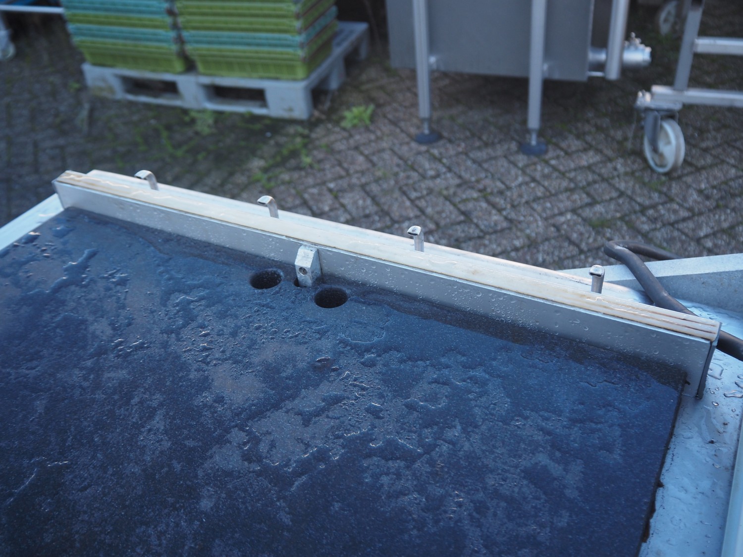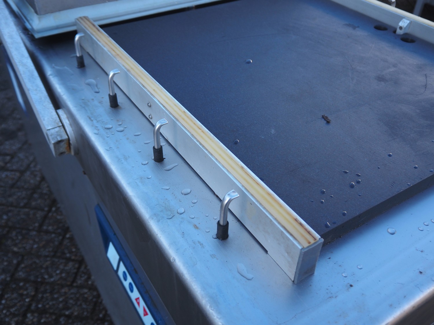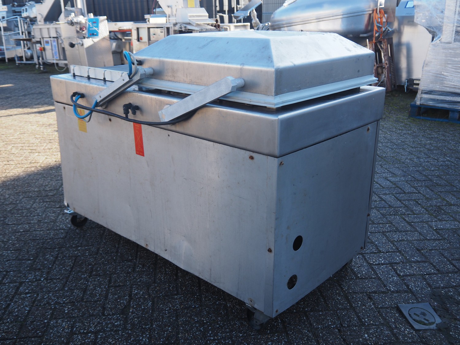 Henkovac mobile double chamber vacuum machine, seal length: (4x) 620 mm, chamber dimensions: (2x) 520 mm x 600 mmm, vacuum pump, total dimensions: 1600 mm x 870 mm x 1150 mm.