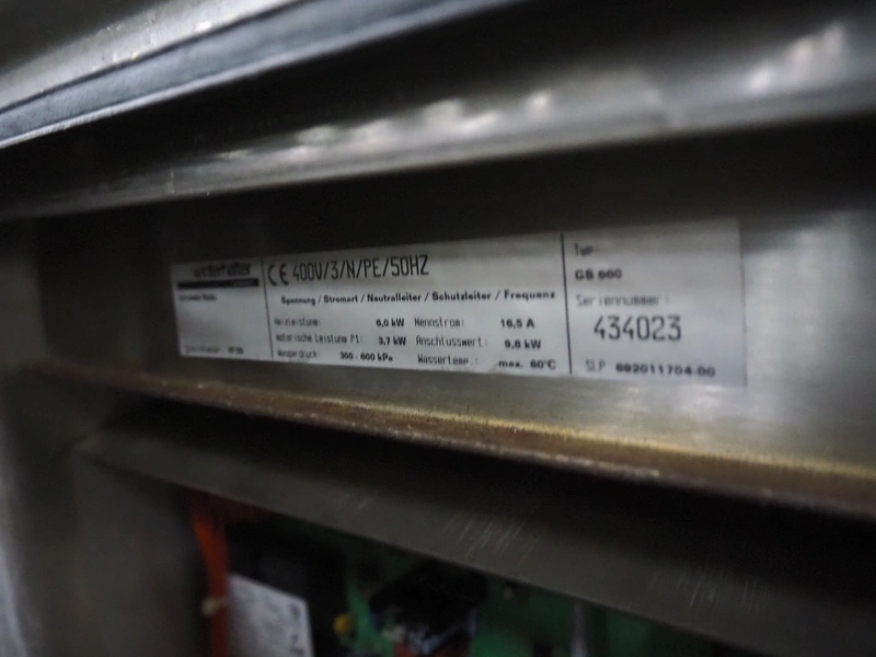 Winterhalter dishwasher, type: GS 660, serienummer: 434023, 400 V, 3 Ph, 50 Hz, 16.5 A, 9.8 kW, inside dimensions: 1280 mm x 720 mm x 950 mm, total dimensions: 1420 mm x 880 mm x 1770 mm.