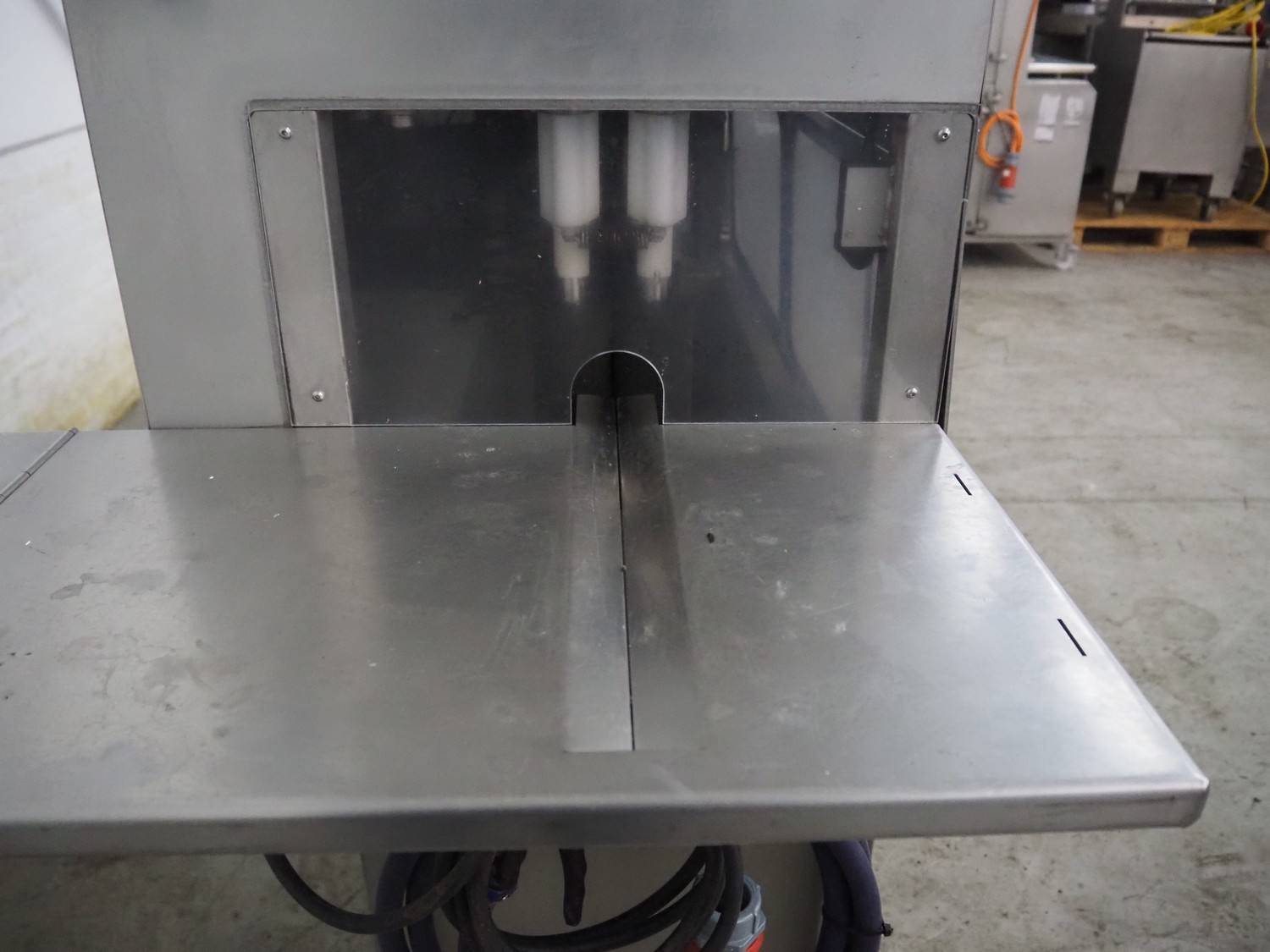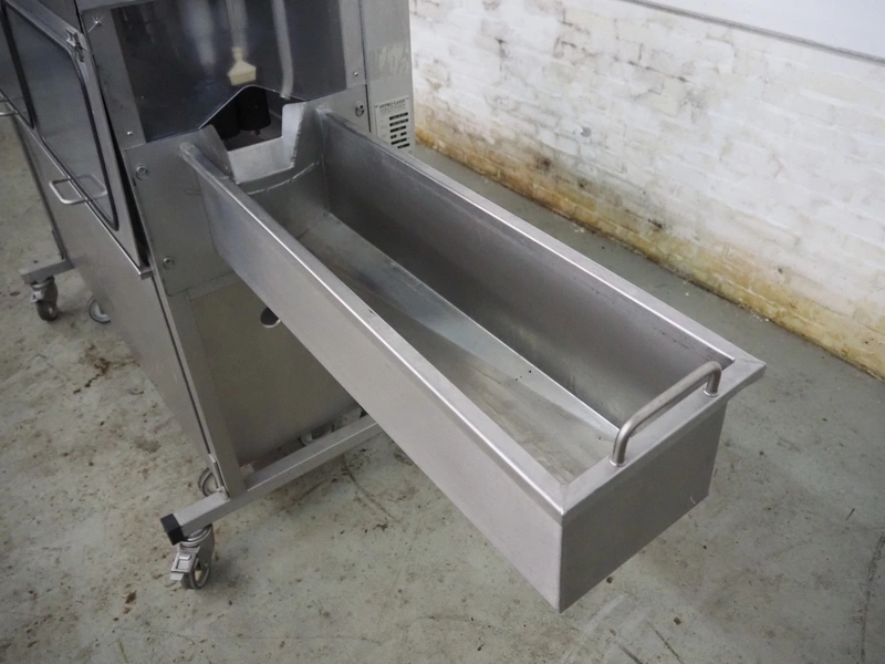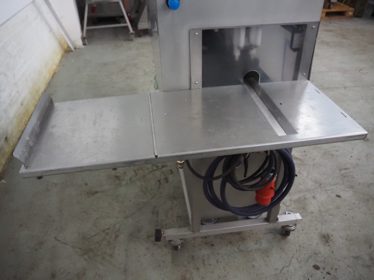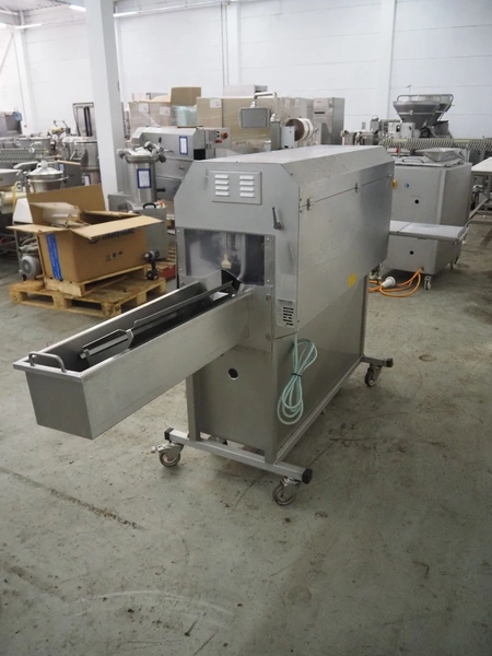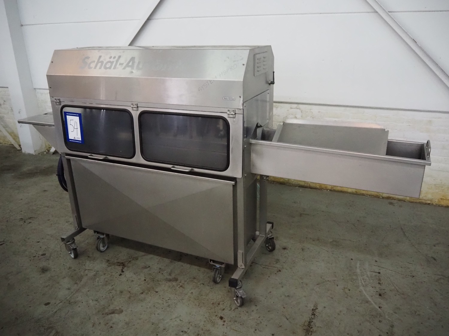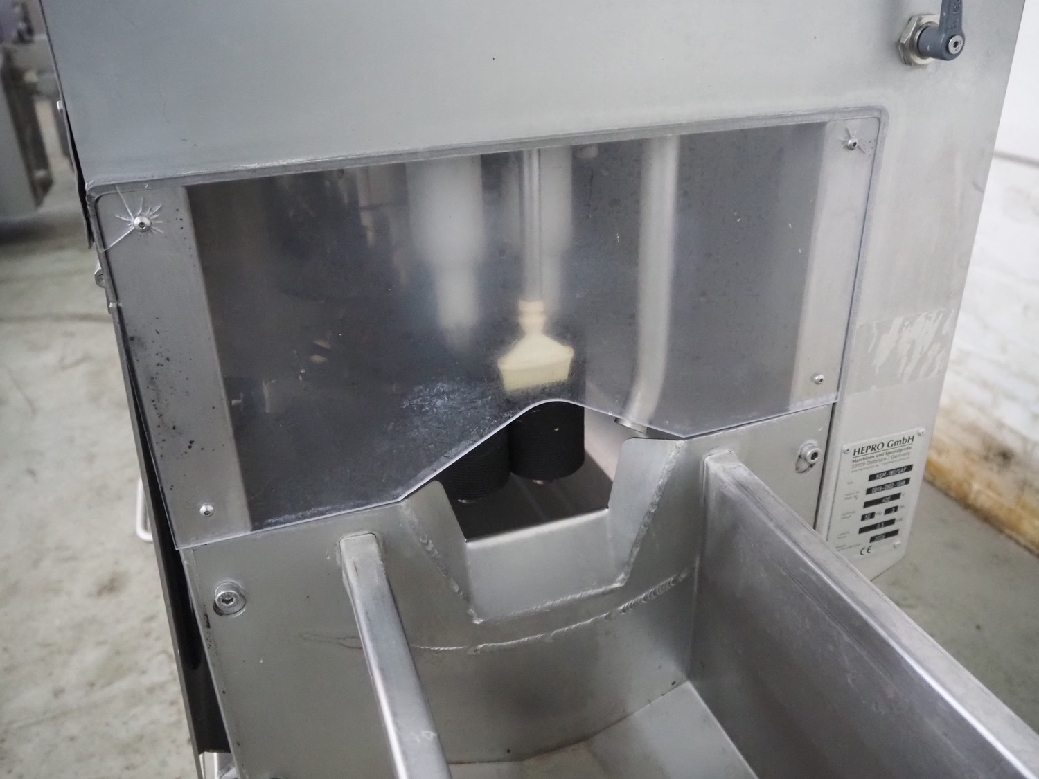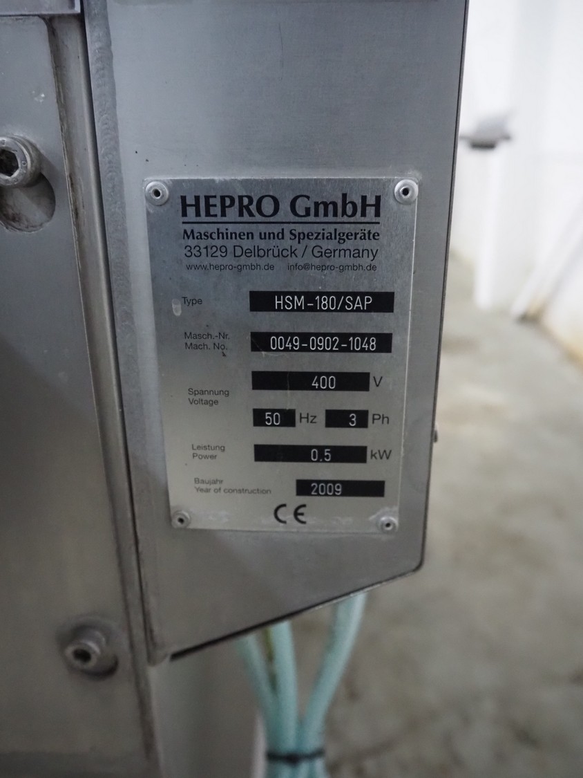 Hepro GmbH mobile industrial asparagus peeling machine, type: HSM-180/SAP, machine number: 0049-0902-1048, year of construction: 2009, 400 V, 3 Ph, 50 Hz, 0.5 kW, clearance: 60 mm x 55 mm, total dimensions: 2550 mm x 600 mm x 1420 mm.