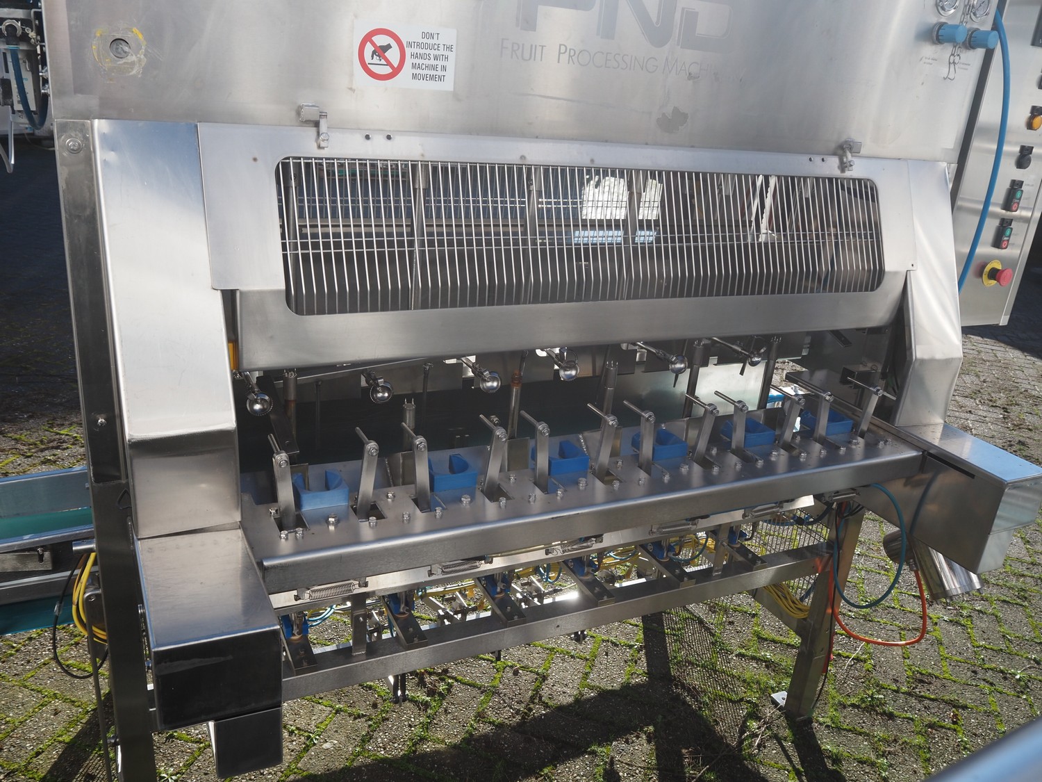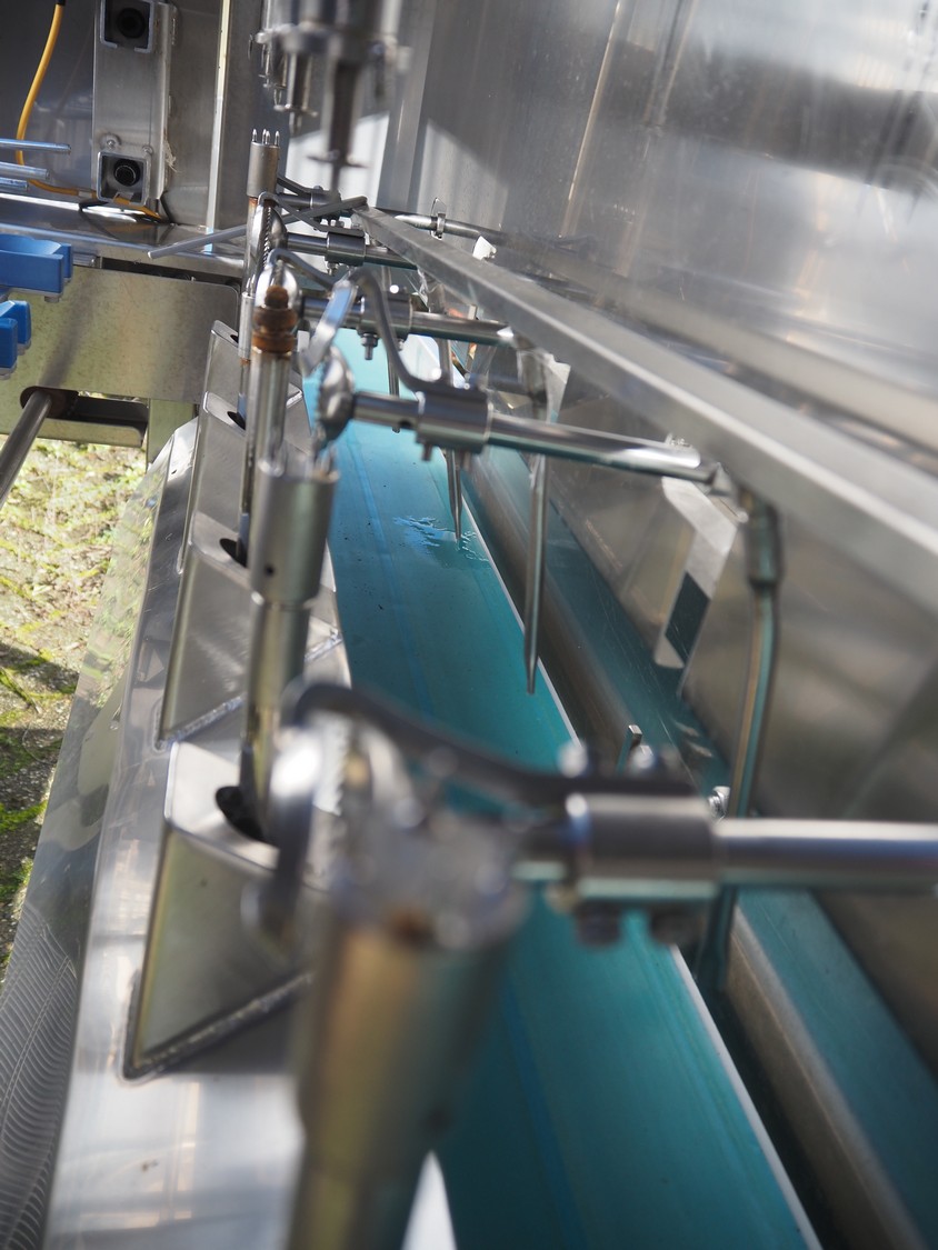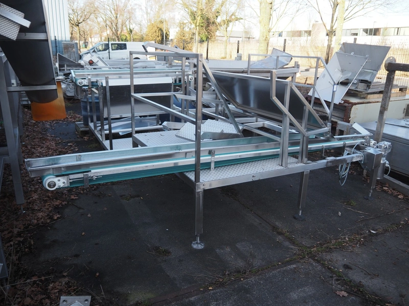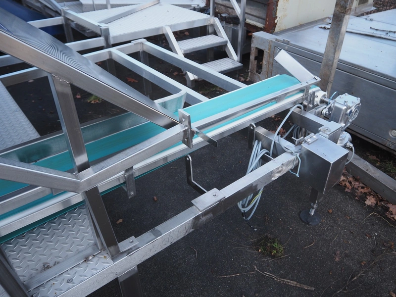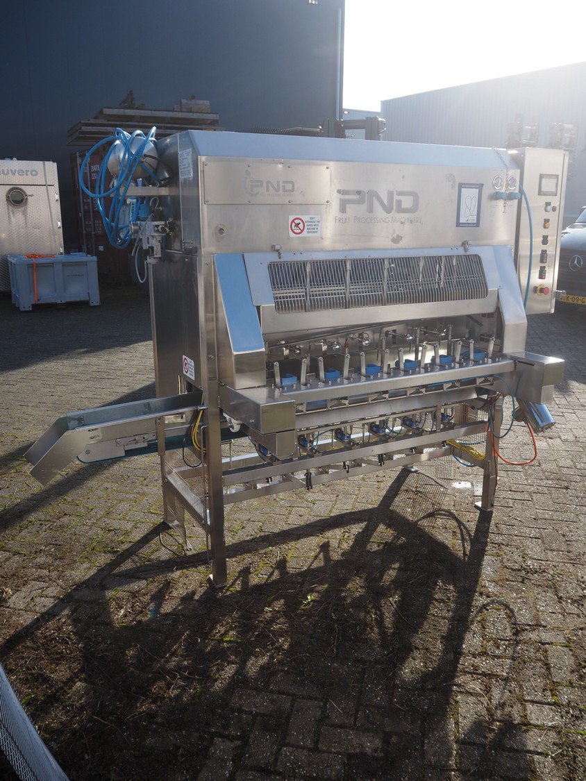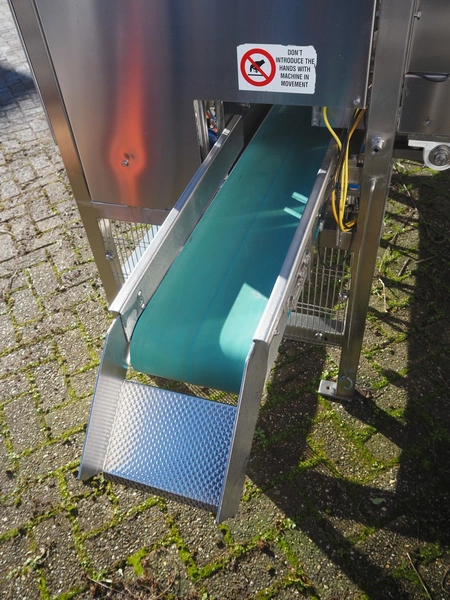PND s.r.l. fruit/vegetable peeler, type: peeling machine, year of construction: 2014, clearance: 150 mm x 205, plastic belt, belt width: 195 mm, total dimensions: 2700 mm x 1200 mm x 1900 mm. Including platform, dimensions: 3400 mm x 1800 mm x 1440 mm.