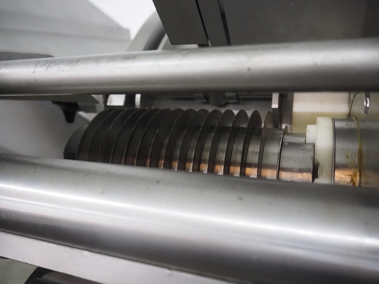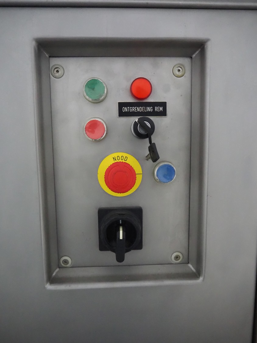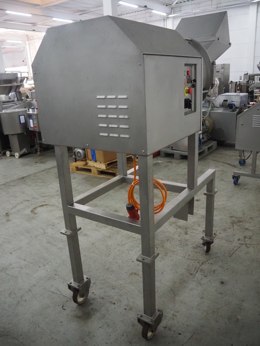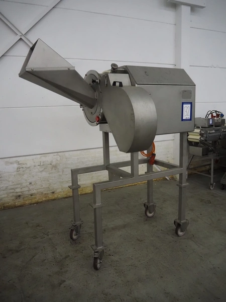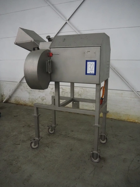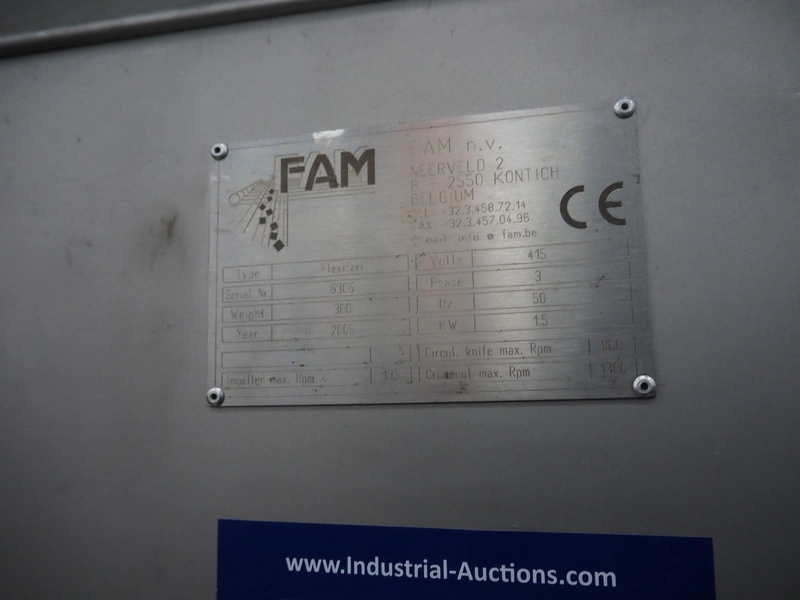 FAM n.v. mobile vegetable slicer, type: Flexifam, serial number: 6306, year of construction: 2005, 415 V, 3 Ph, 50 Hz, 1.5 kW, weight: 300 kg, distance between knives: 10 mm, dimensions infeed: 420 mm x 275 mm, total dimensions: 1700 mm x 1150 mm x 2180 mm.