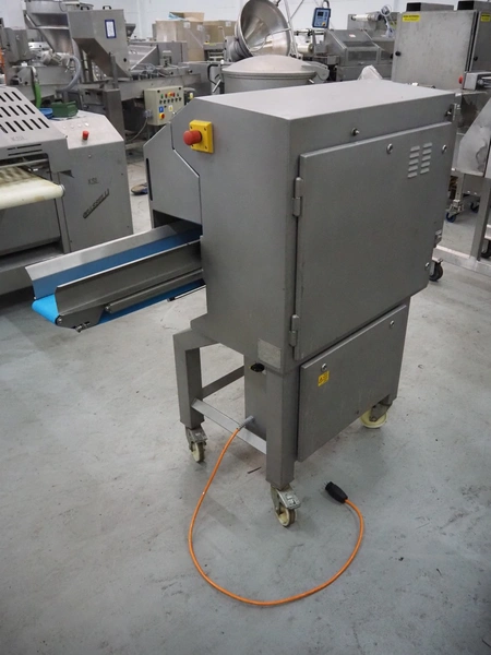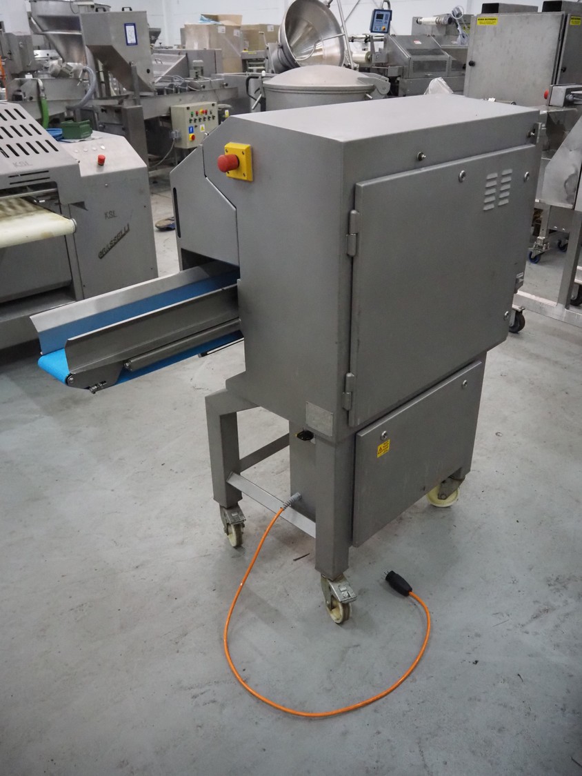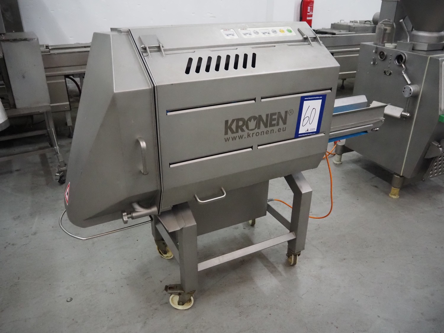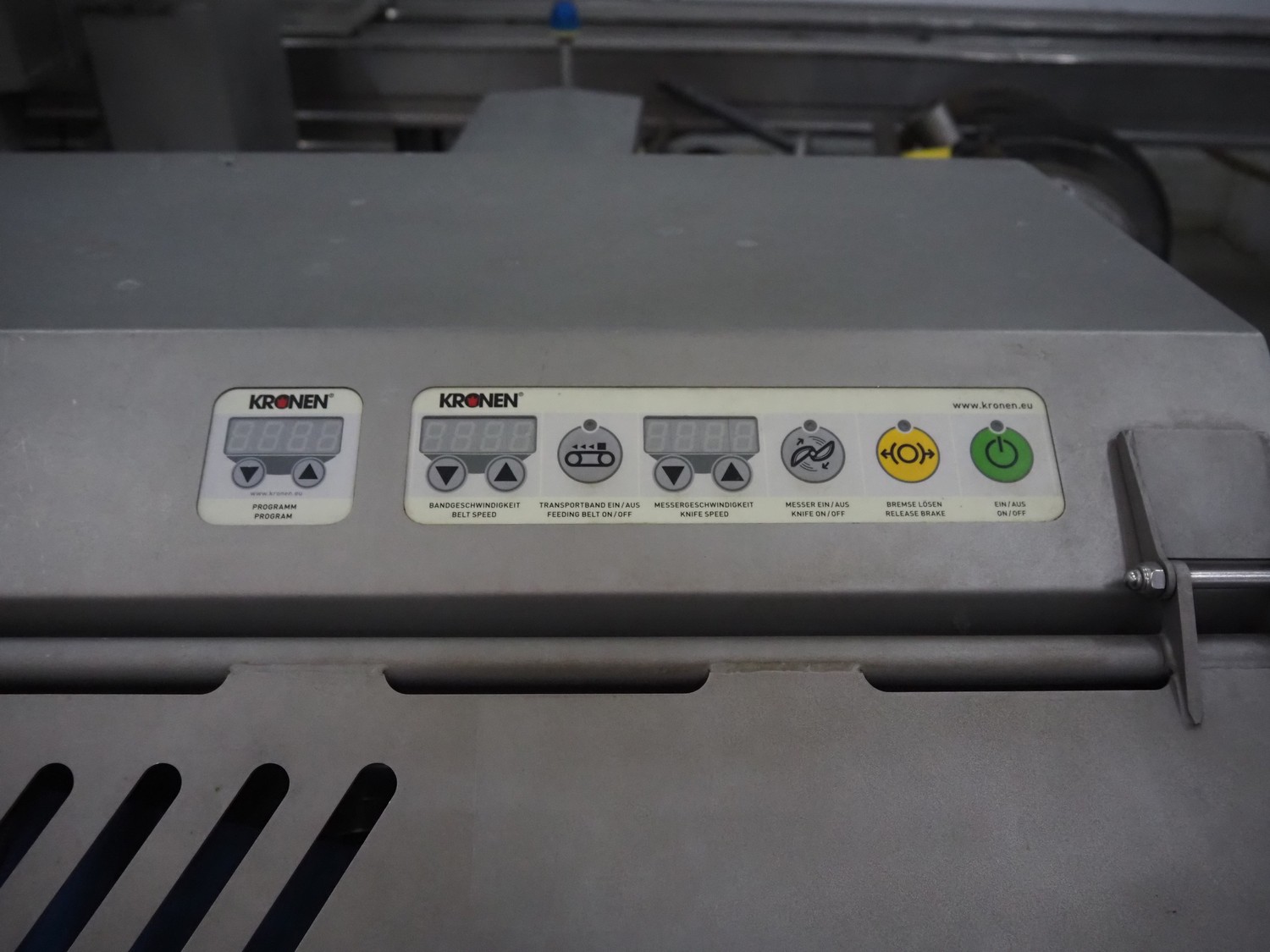 Kronen mobile vegetable slicer, type: GS 10-2, serial number: 2531, year of construction: 2017, 230 V, 1 Ph, 50/60 Hz, 1.8 kW, plastic belt, belt width: 130 mm, total dimensions: 1750 mm x 650 mm x 1430 mm.