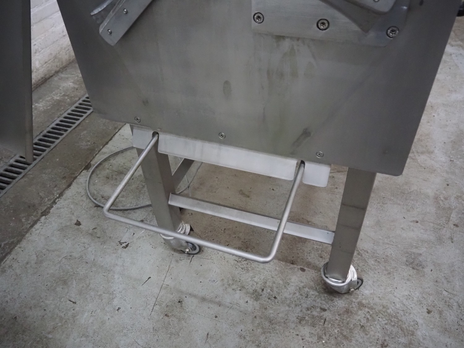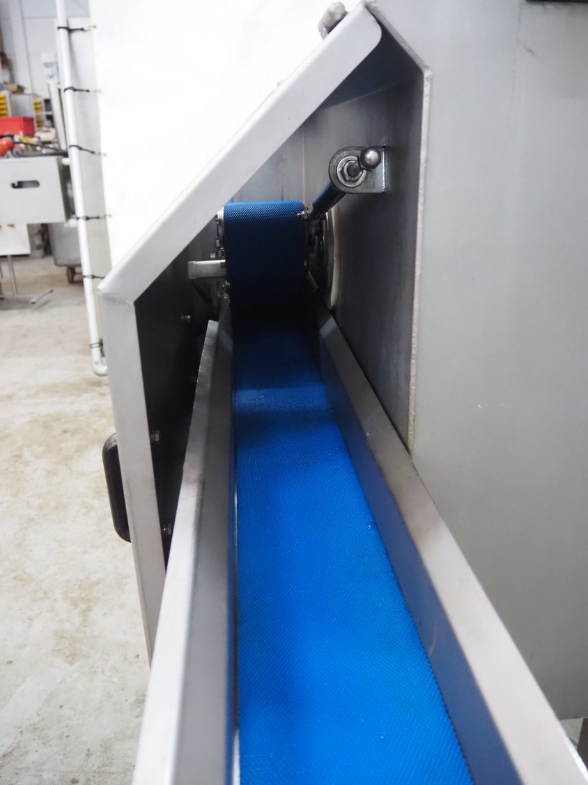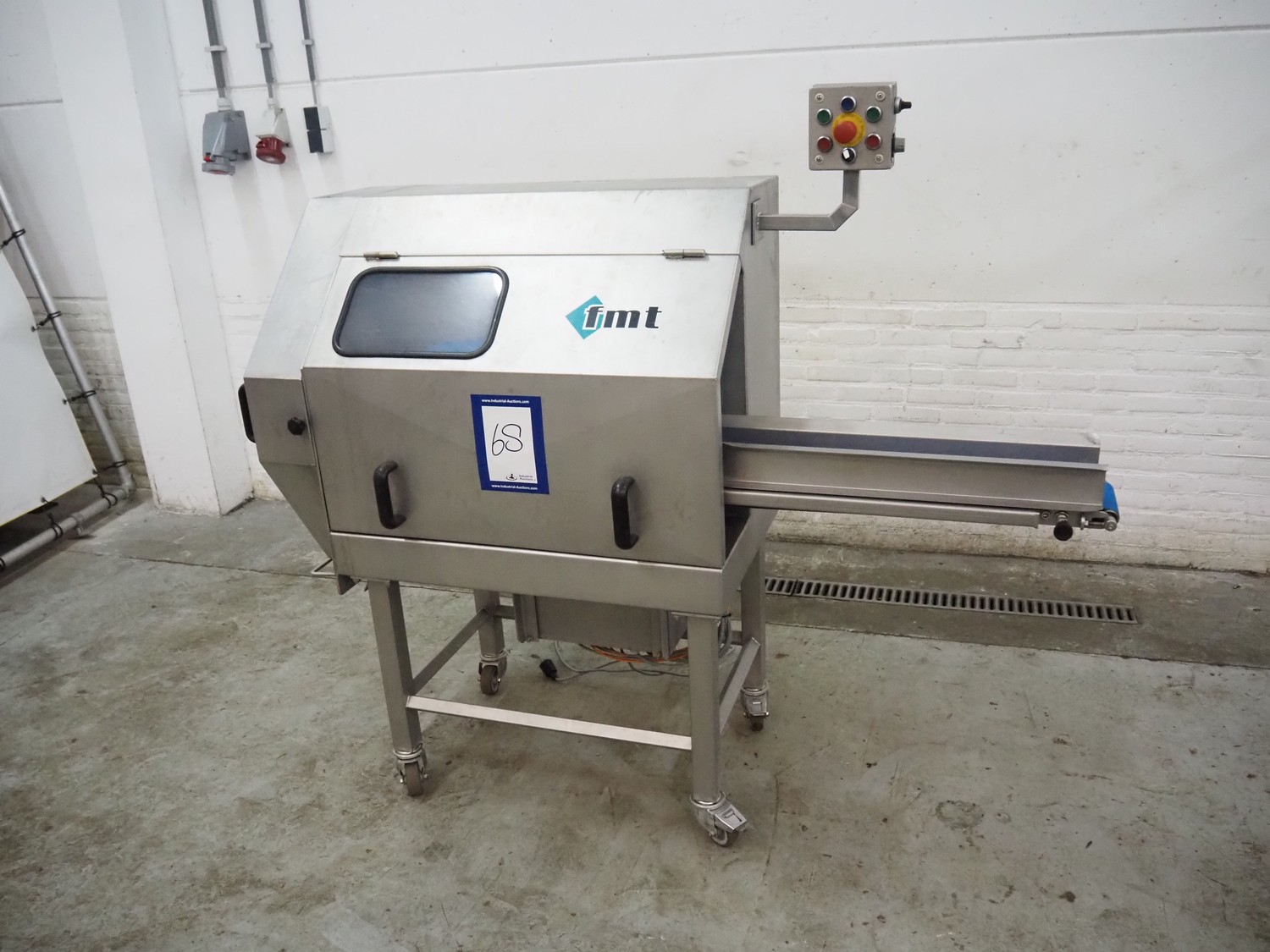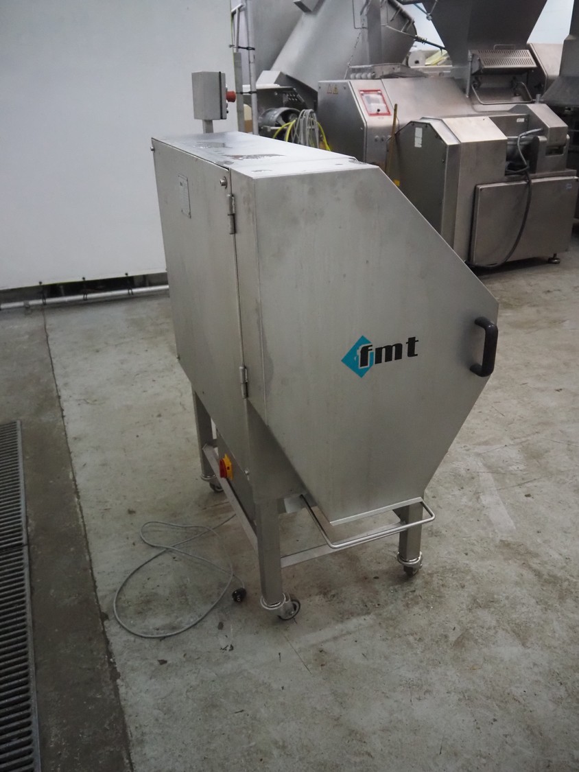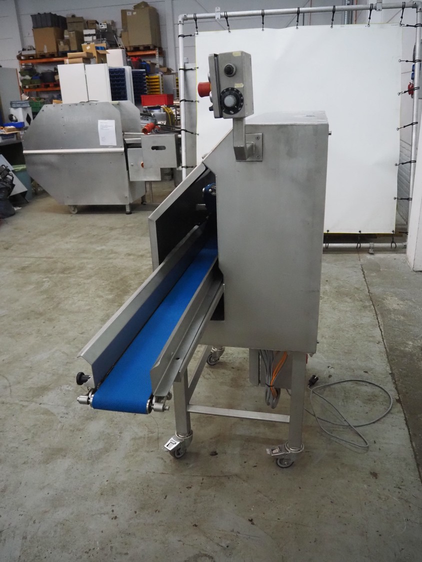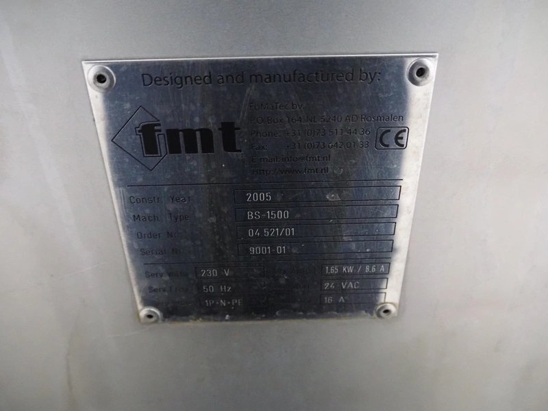 FMT mobile vegetable slicer, type: BS-1500, serial number: 9001-01, year of construction: 2005, 230 V, 1 Ph, 50 Hz, 16 A, 1.65 kW, plastic belt, belt width: 125 mm, clearance: 140 mm x 125 mm, total dimensions: 1400 mm x 650 mm x 1500 mm.