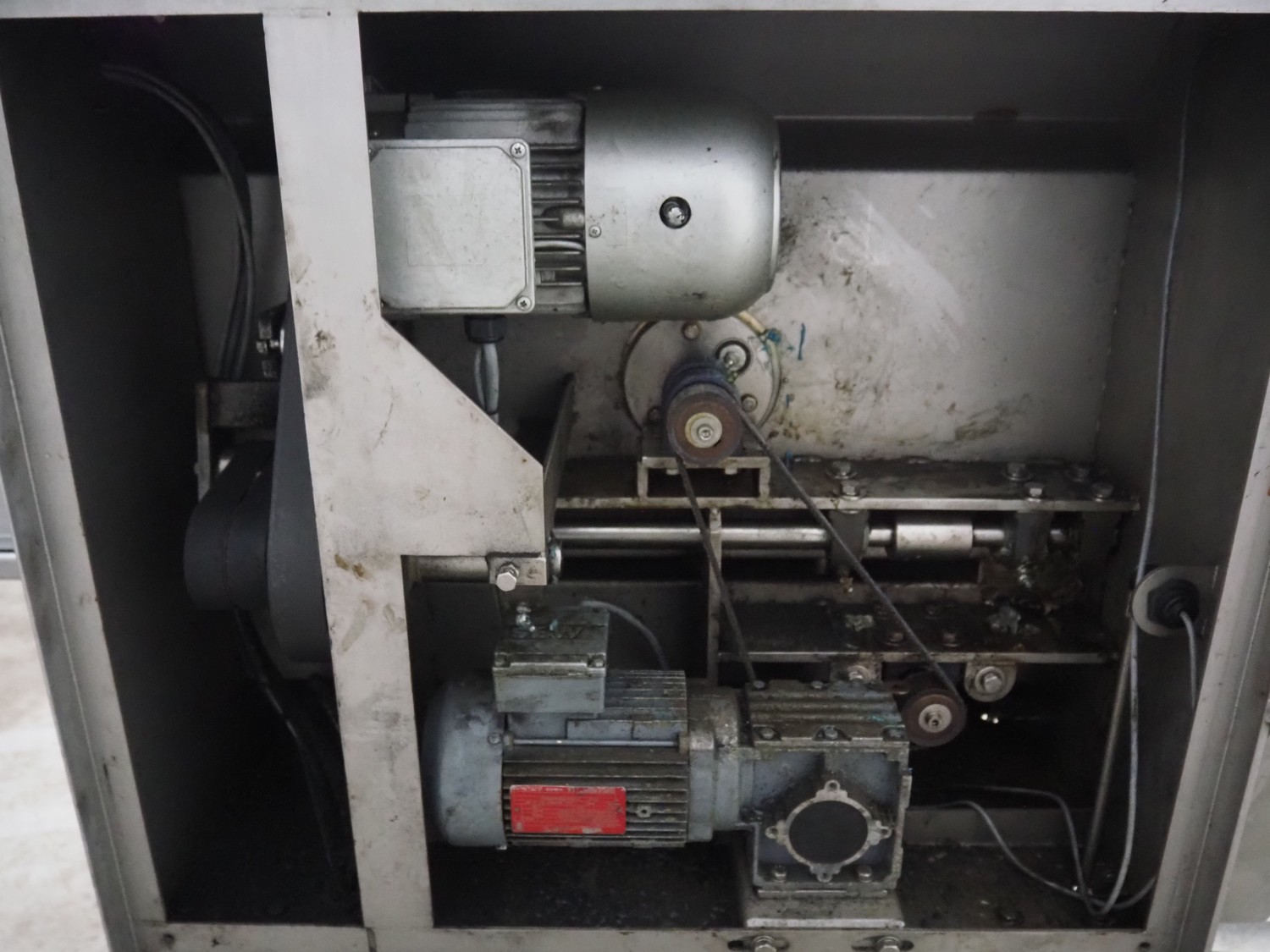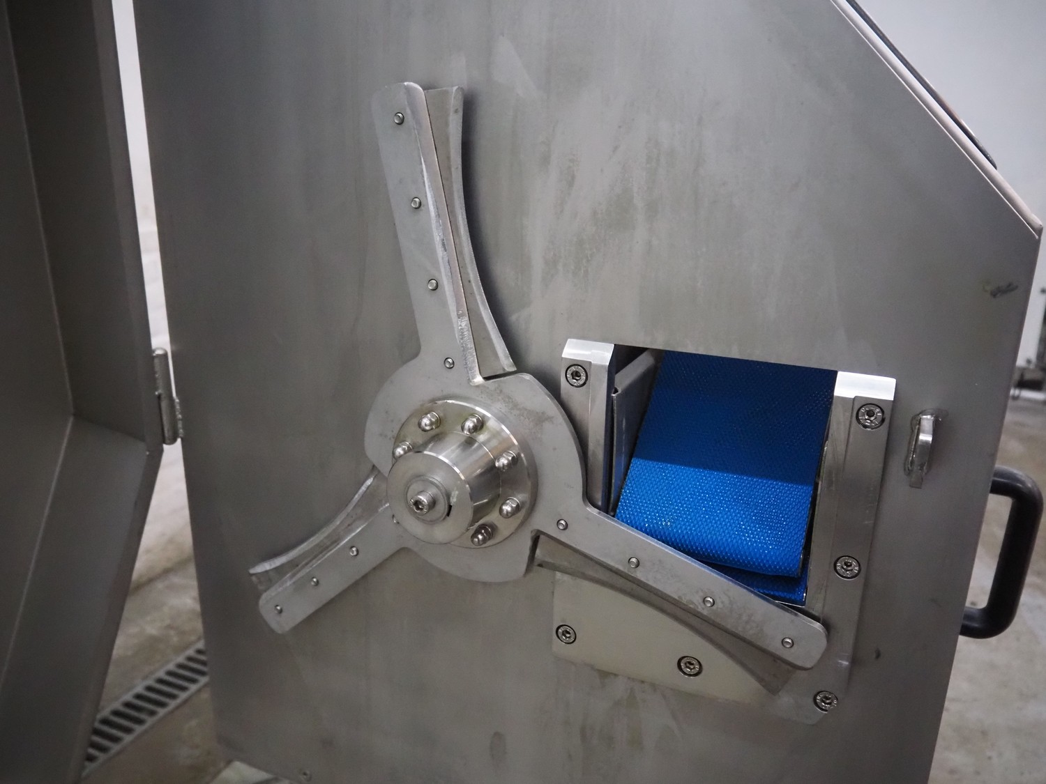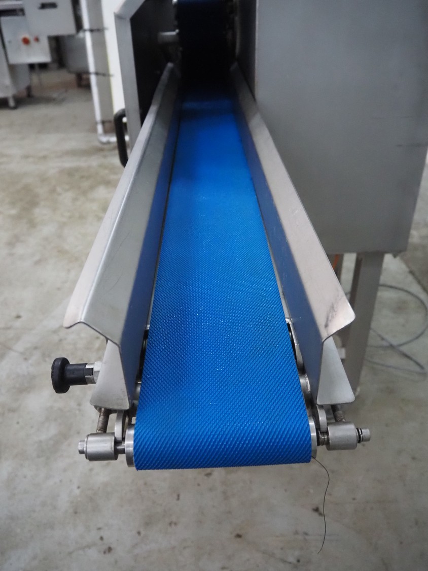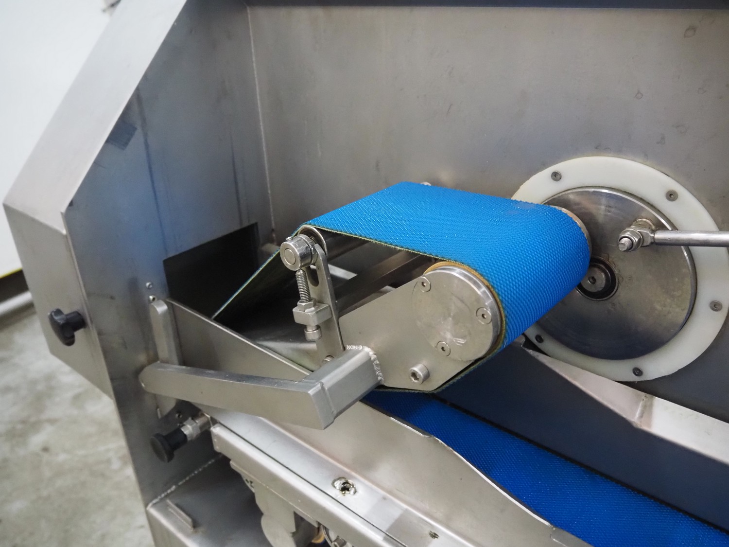 FMT mobile vegetable slicer, type: BS-1500, serial number: 9001-01, year of construction: 2005, 230 V, 1 Ph, 50 Hz, 16 A, 1.65 kW, plastic belt, belt width: 125 mm, clearance: 140 mm x 125 mm, total dimensions: 1400 mm x 650 mm x 1500 mm.