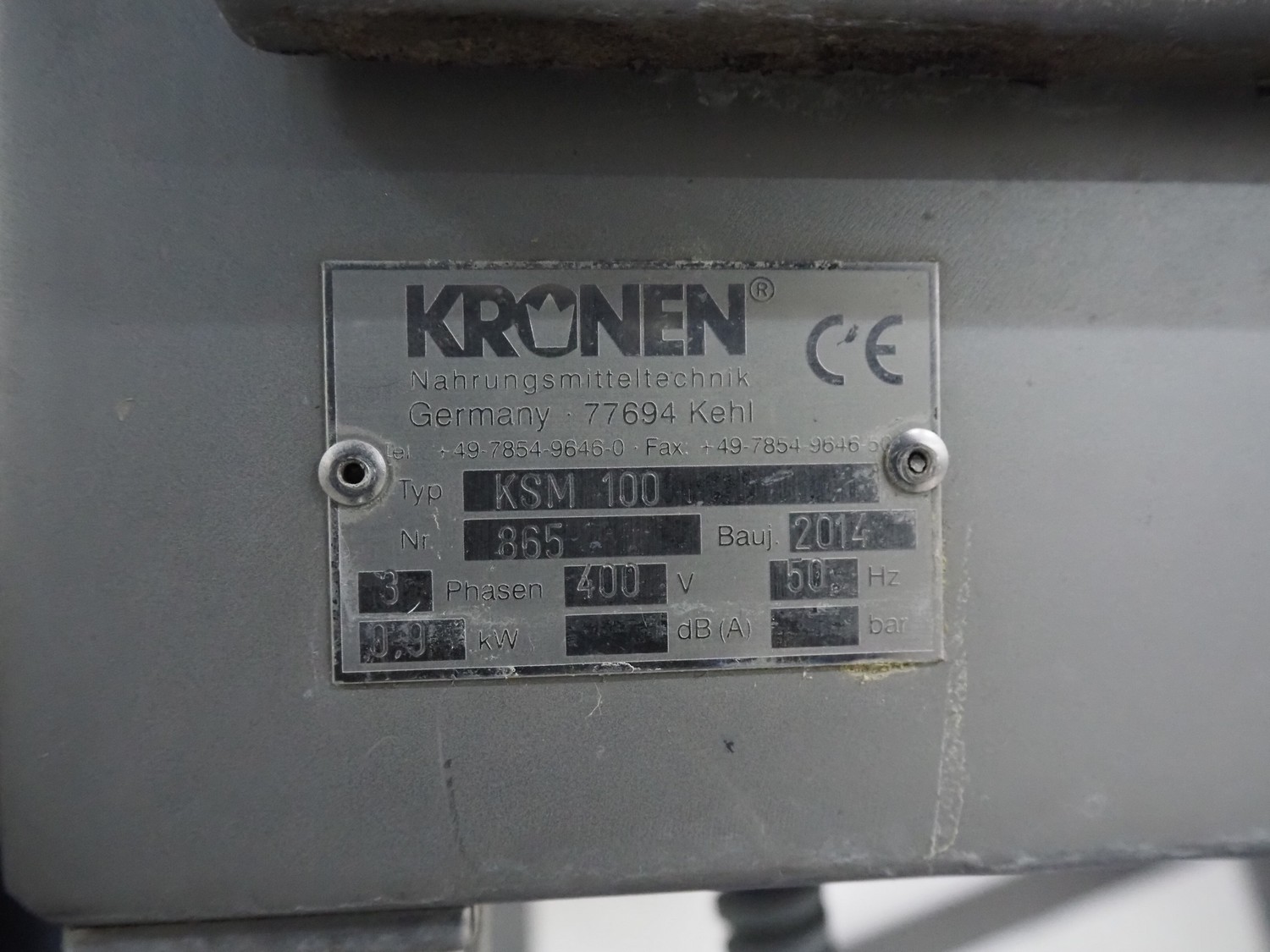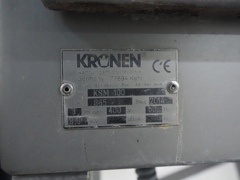 Kronen slicer, type: KSM 100, number: 865, year of construction: 2014, 400 V, 3 Ph, 50 Hz, 0.9 kW, total dimensions: 600 mm x 800 mm x 1200 mm.