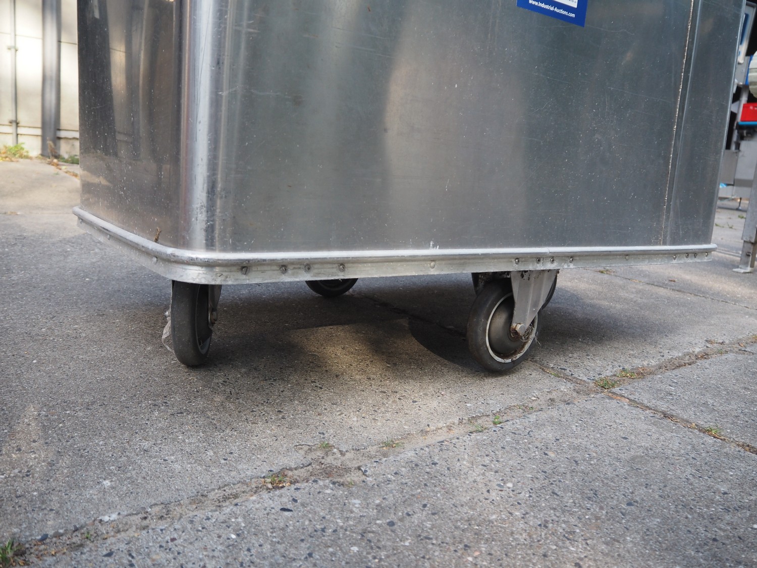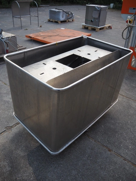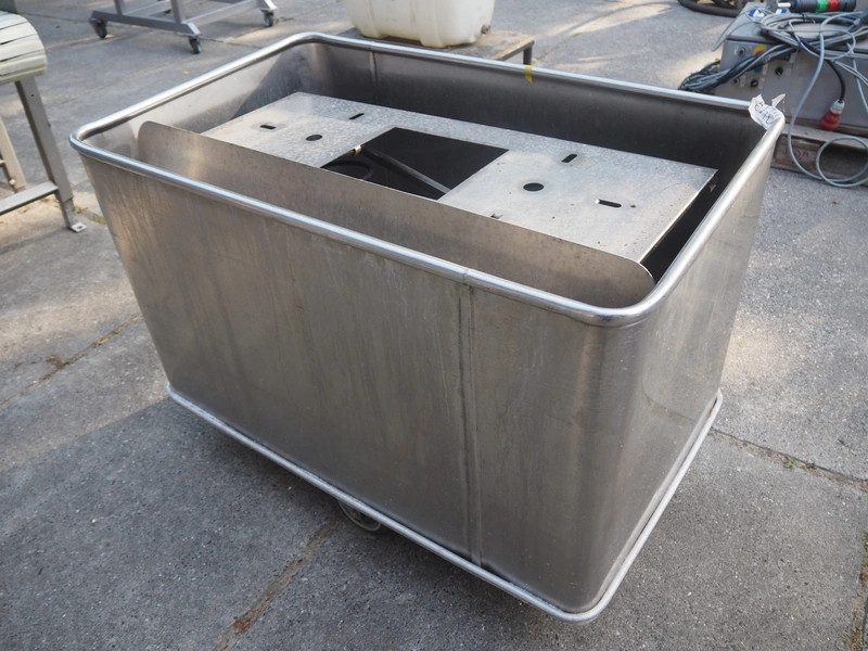 S/s mobile dispenser tub for plates, inside dimensions: 1060 mm x 660 mm, total dimensions: 1130 mm x 710 mm x 1020 mm.