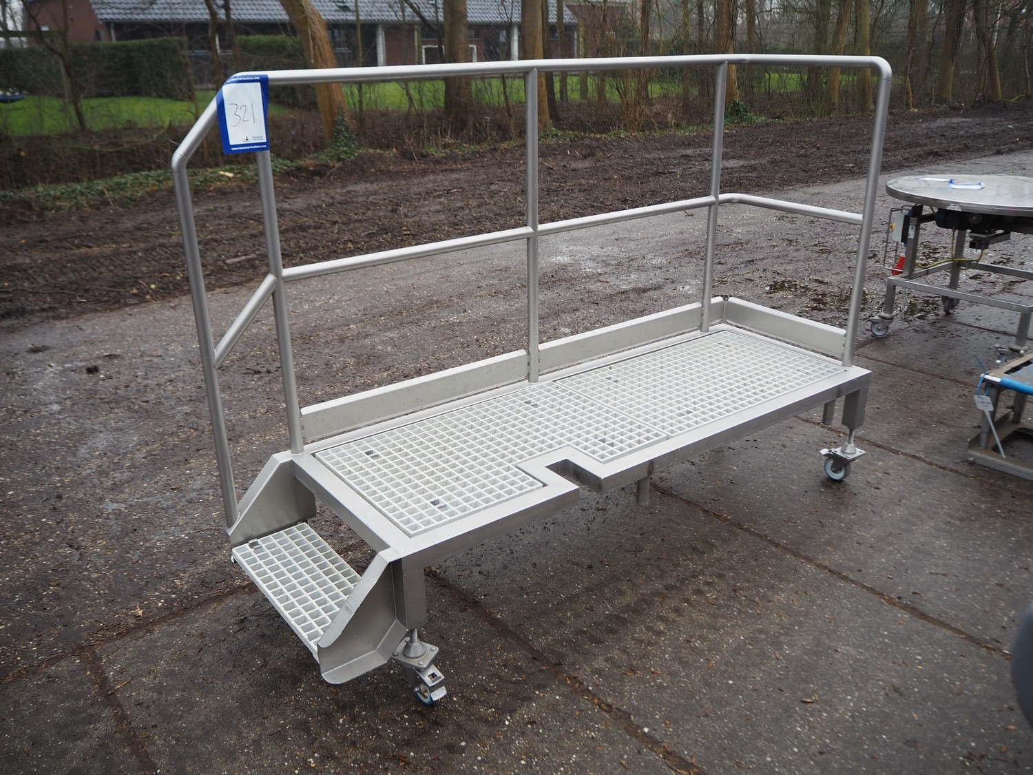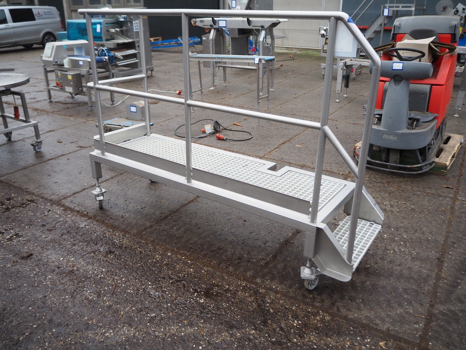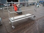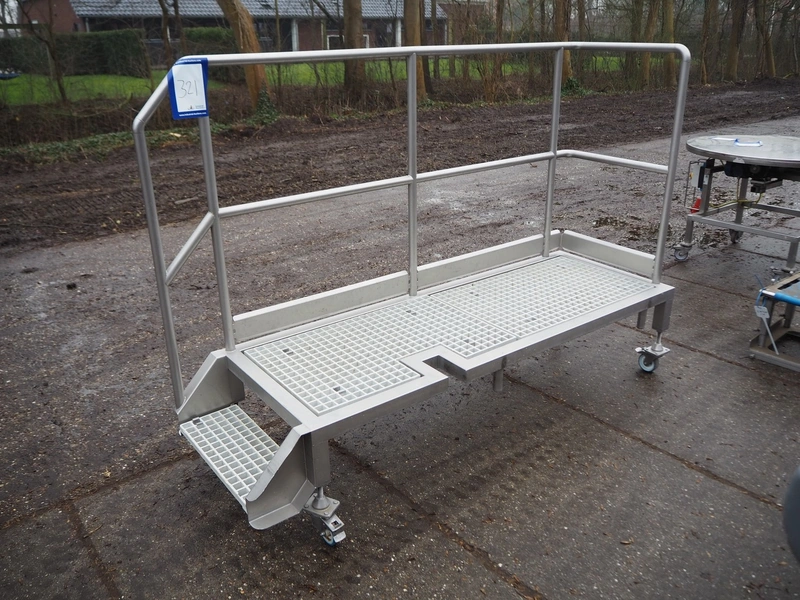 Mobile s/s platform with plastic grids, working height: 470 mm, total dimensions: 2200 mm x 730 mm x 1570 mm.