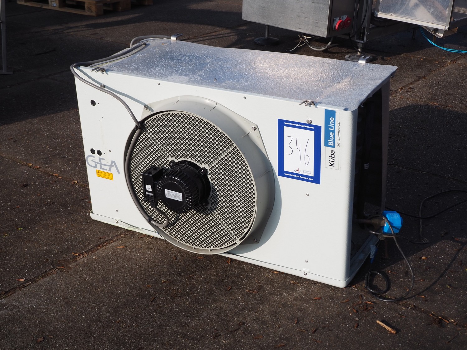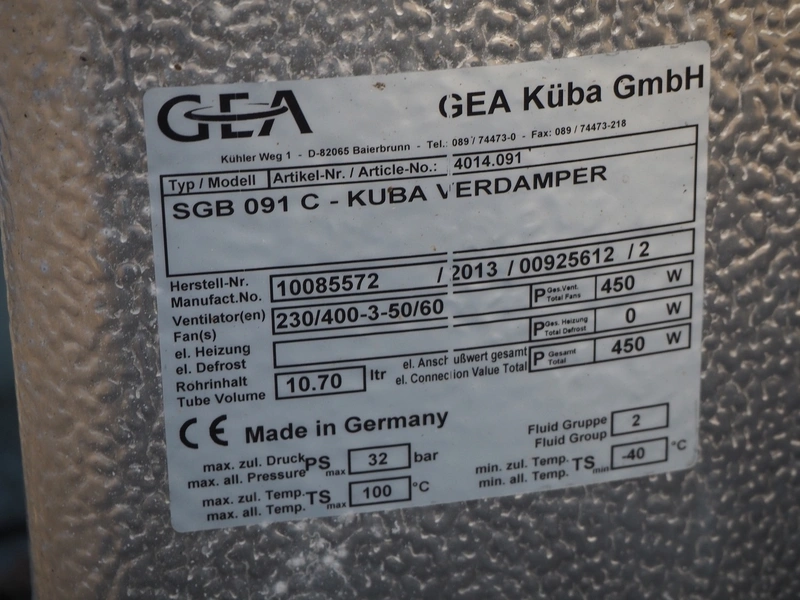 GEA evaporator with 1 fan, type: SGB 091 C-KUBA VERDAMPER, serial number: 10085572,year of construction: 2013, 230/400 V, 3 Ph, 50-60 Hz, 450 W, fluid group: 2, dimensions: 1060 mm x 700 mm x 640 mm.