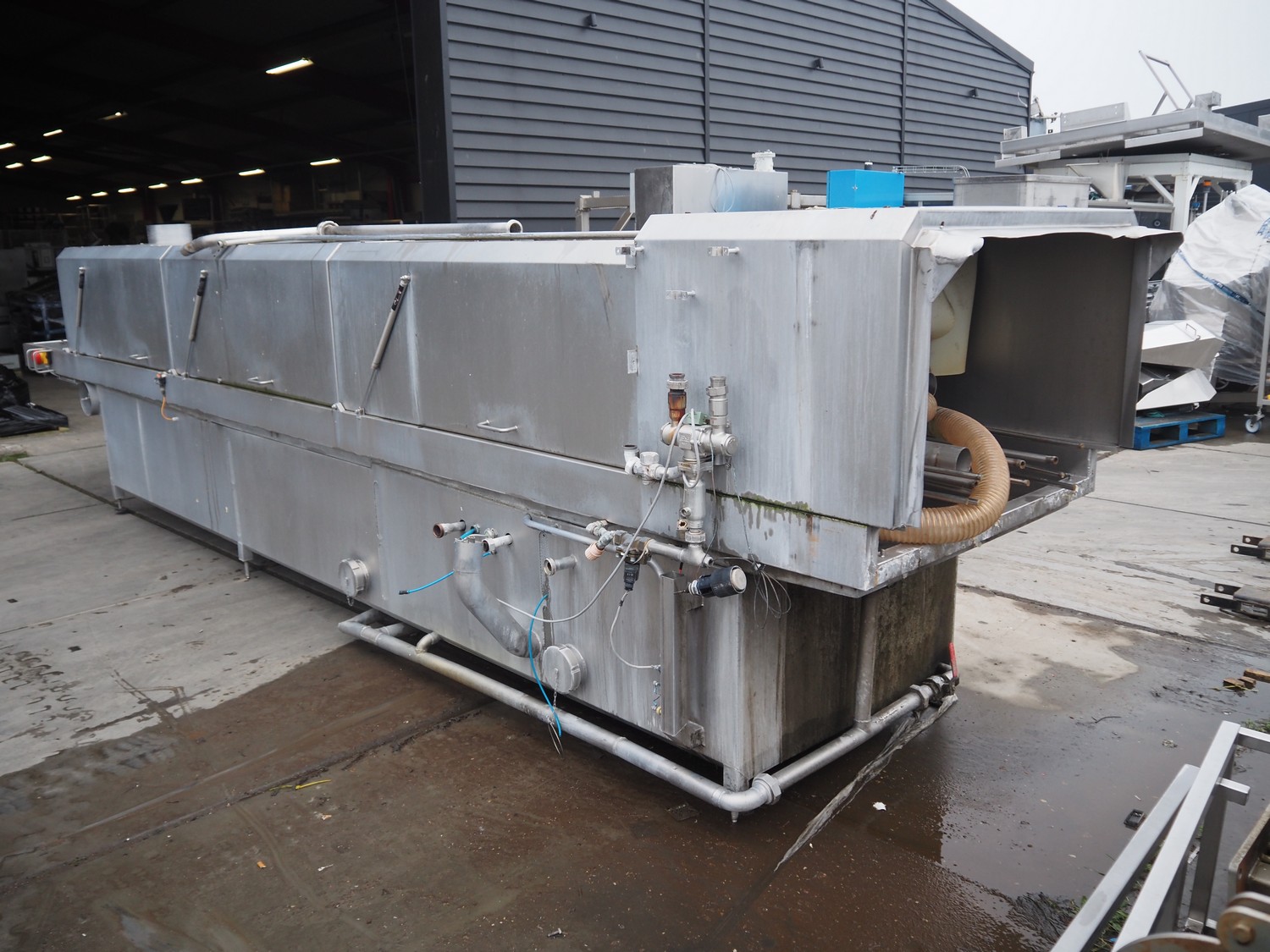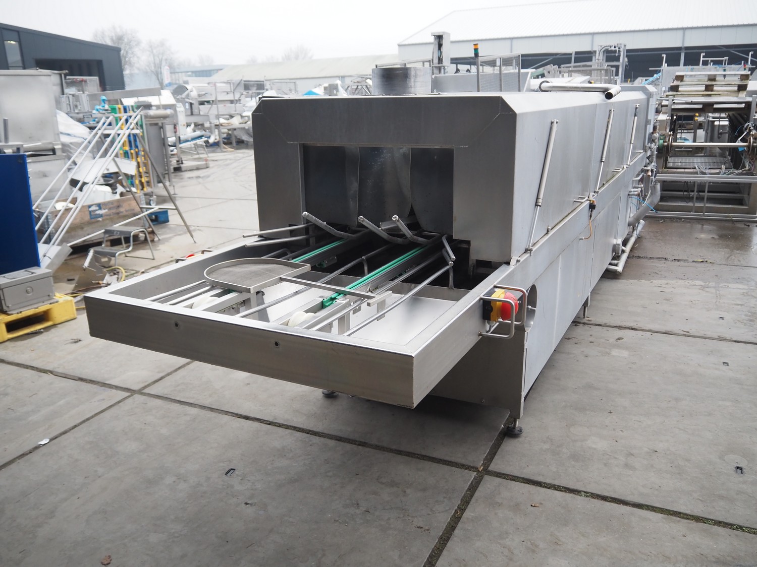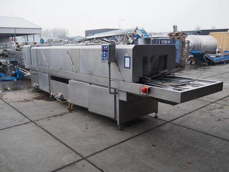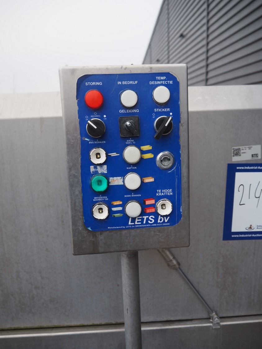 LETS BV crate washing and drying machine, model: K564 HE ST / D564 HE, pump 1: 5.5 kW, 11.5 A, 72 m³ per hour, pump 2: 11 kW, 30.5 A, 8 m³ per hour, pump 3: 11 kW, 22 A, 72 m³ per hour, blowers: 3 x 5.5 kW, total dimensions: 9650 mm x 1350 mm x 2600 mm.