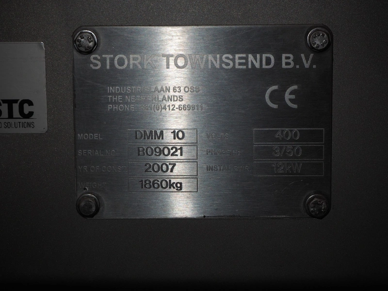 Stork Townsend B.V. meat harvester, model: DMM 10, serial number: B09021, year of construction: 2007, 400 V, 3 Ph, 50 Hz, 12 kW, 1860 kg, ø chamber: 215 mm, length: 450 mm, ø filter: 5 mm, total dimensions: 3200 mm x 1000 mm x 2000 mm, Denison hydraulics hydraulic unit, type: N19 - 01334-A, year of construction: 15-09-2006, dimensions: 1650 mm x 800 mm x 1900, including s/s switch cabinet, dimensions: 850 mm x 400 mm x 1800 mm.
