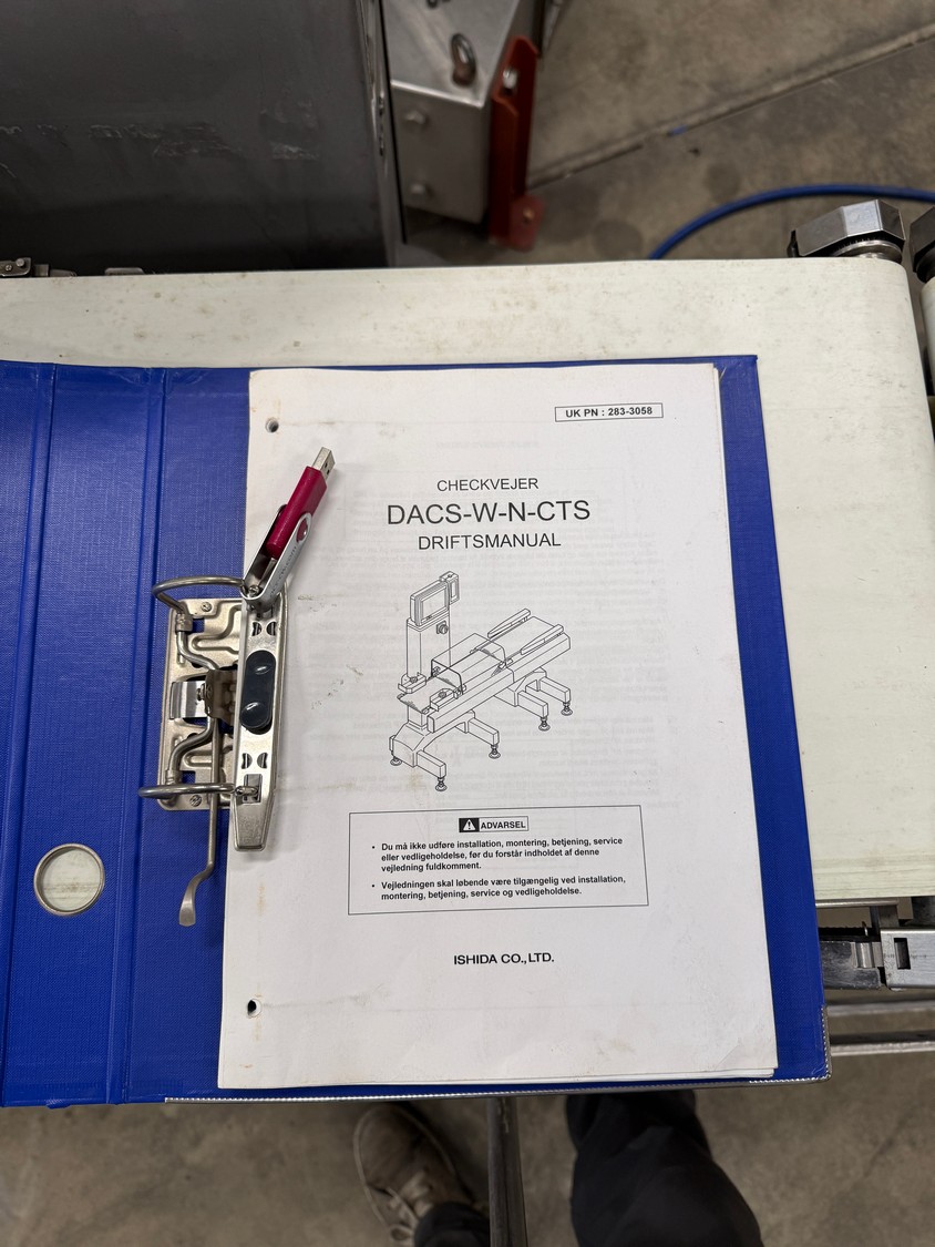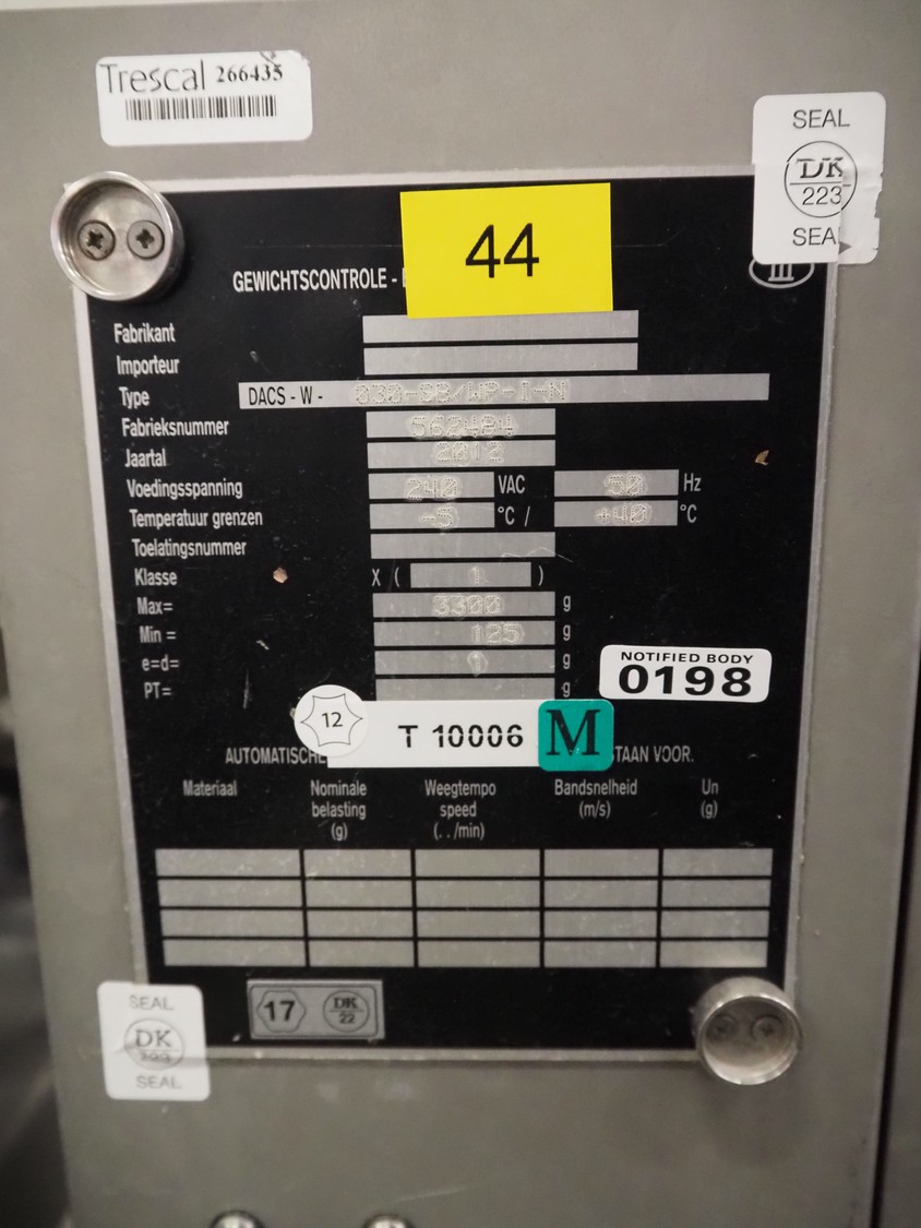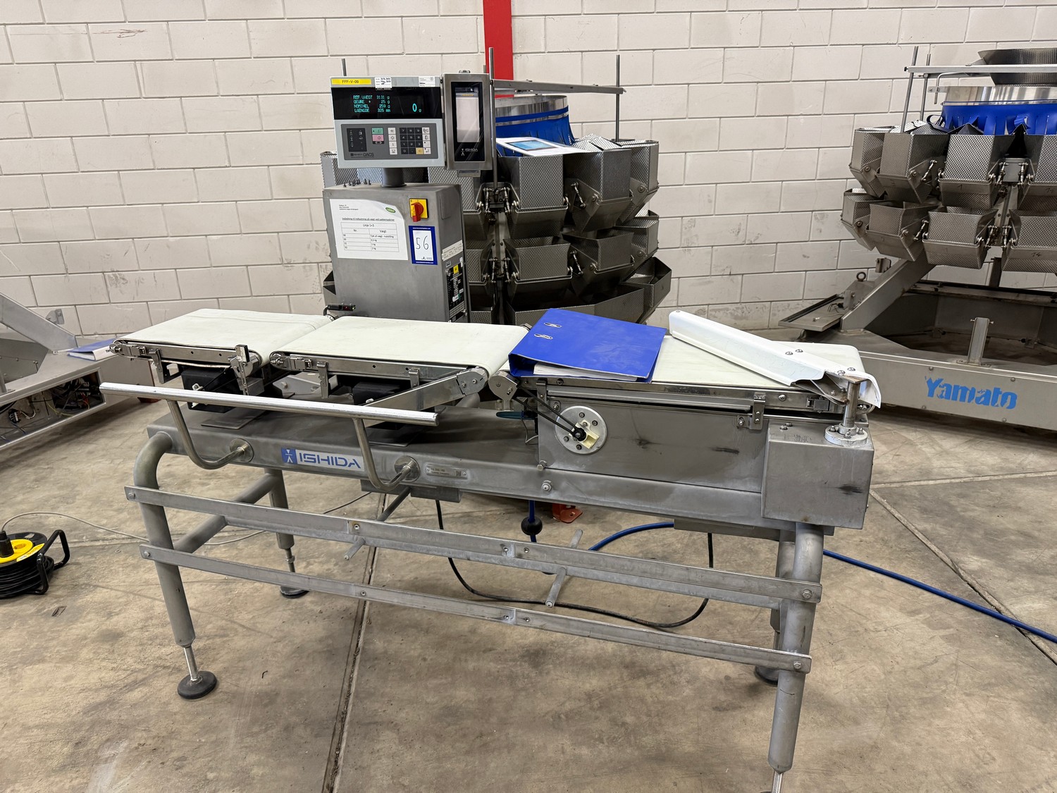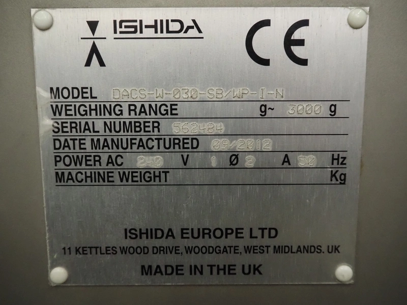 Ishida checkweigher with rejecter, type: DACS-W-030-SB/WP-I-N, serial number: 562484, year of construction: 2012, 240 V, 50 Hz, 2A, maximum weight: 3300 mm, minimum weight: 125 gram, plastic belt, belt width: 300 mm, total dimensions: 1800 mm x 810 mm x 1600 mm.