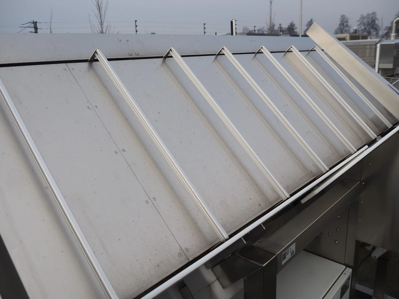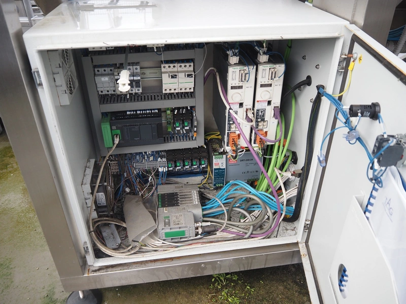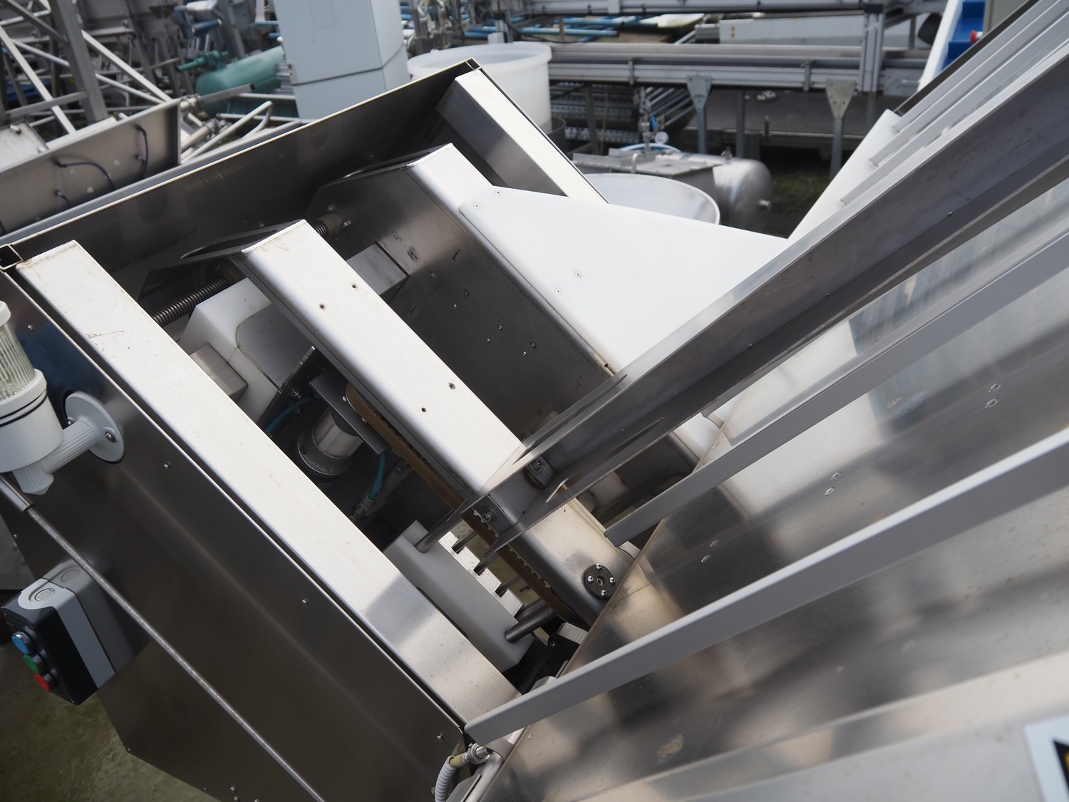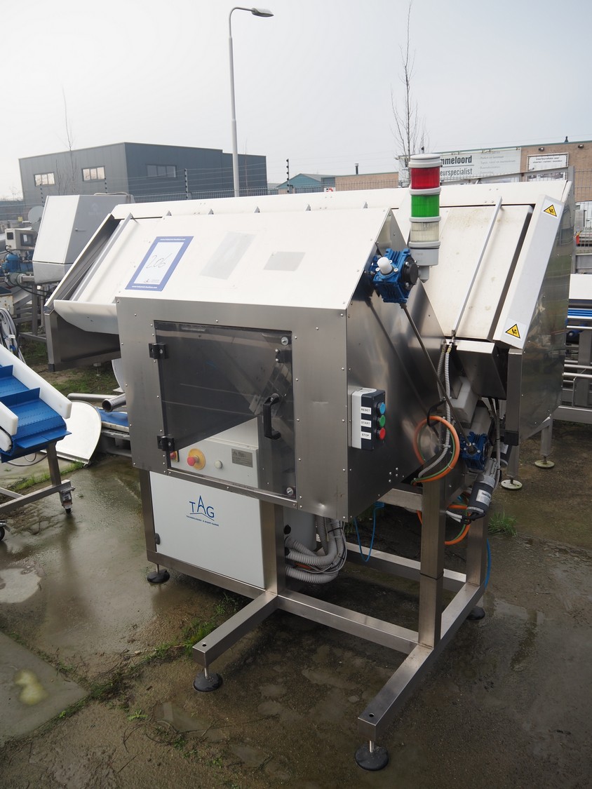 TAG punnet denester, model: TAG Egenore, serial number: TAG Guendalina 00220-3/11, year of construction: 2020, chain belt with dividers, belt width: 550 mm, distance between dividers: 250 mm, divider height: 40 mm, total dimensions: 2200 mm x 1400 mm x 1750 mm.