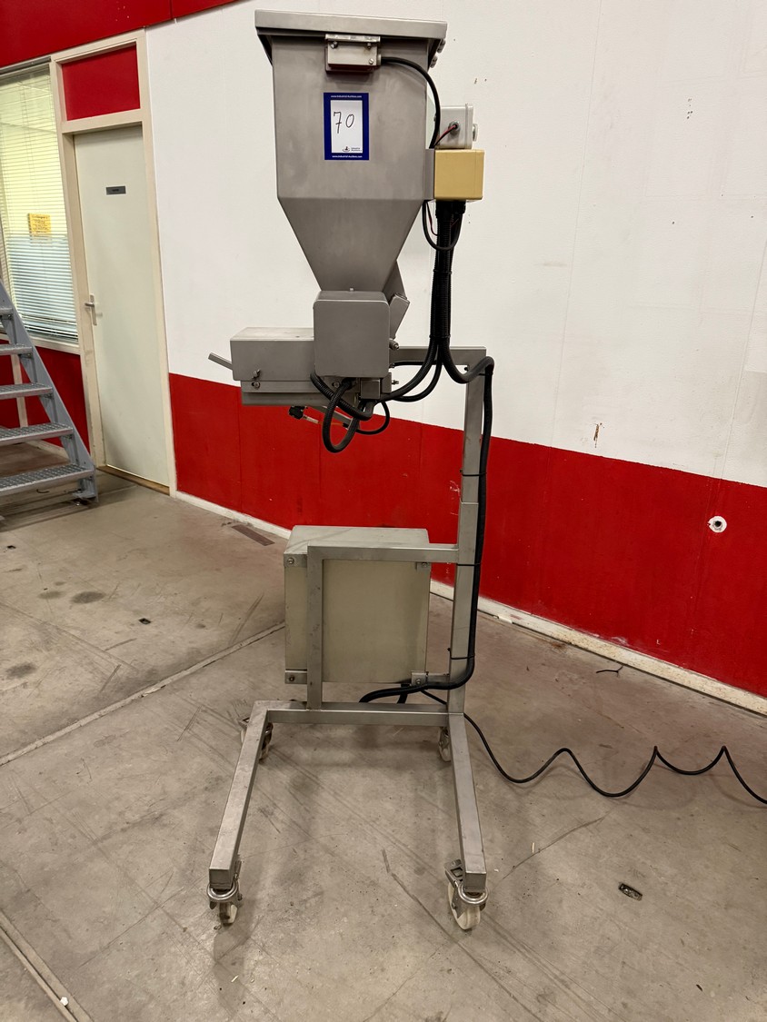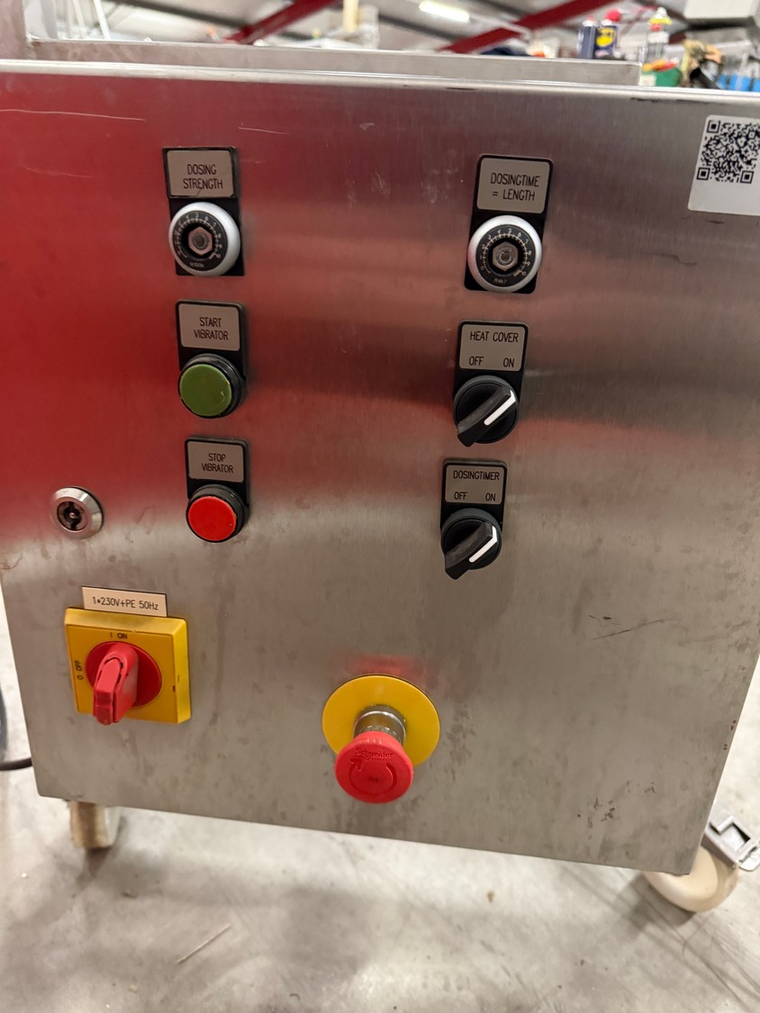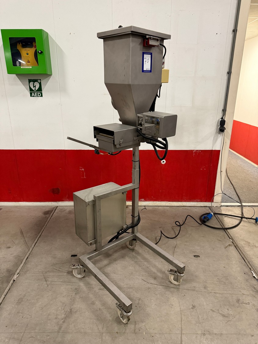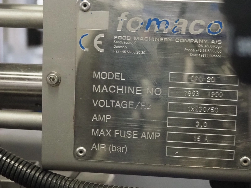 Fomaco Food Machinery Company A/S mobile depositor, model: DPD 20, machine number: 7863, year of construction: 1999, 230 V, 1 Ph, 50 Hz, 3.0/16 A, dimensions: 700 mm x 900 mm x 1800 mm. Incomplete.