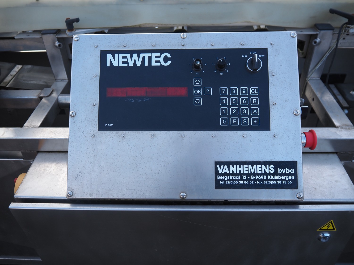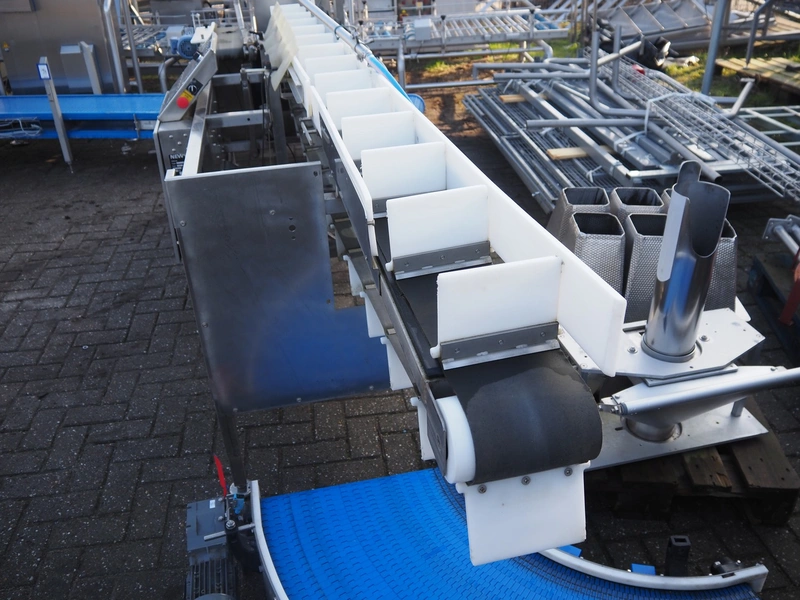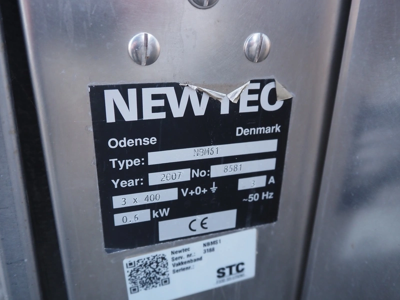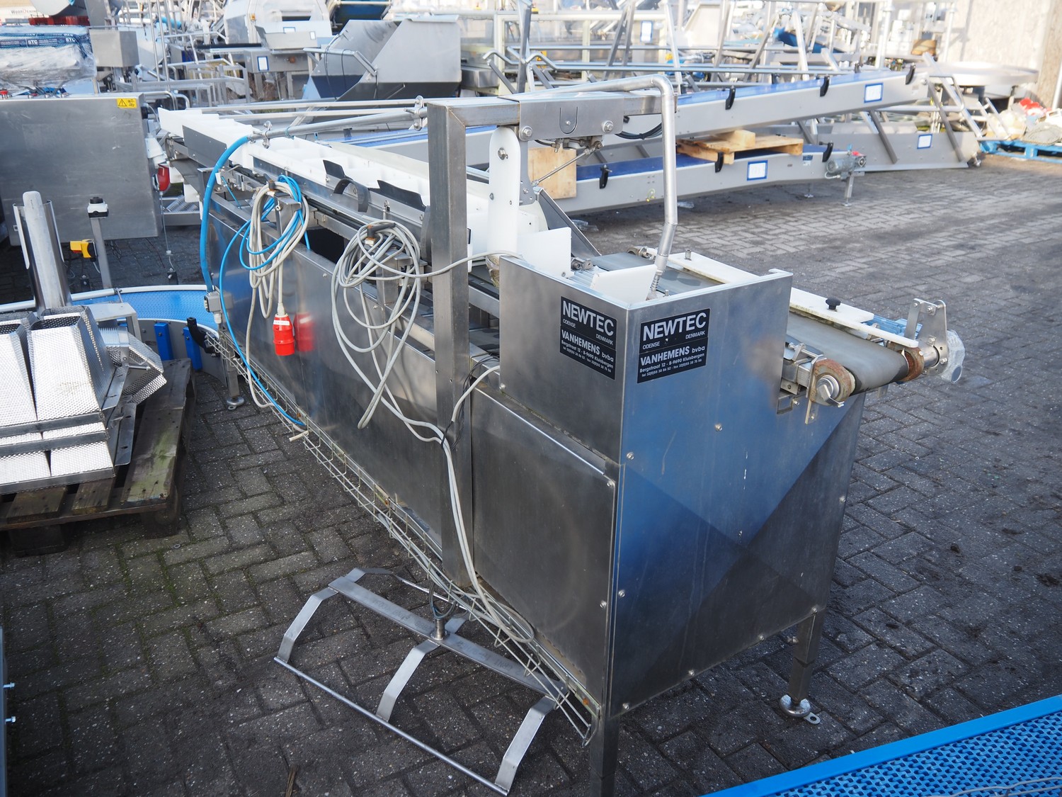 Newtec tray filler, type: NBM61, number: 8581, year of construction: 2007, 400 V, 3 Ph, 3 A, 0.6 kW, plastic belt with dividers, plastic belt, belt width: 150 mm, divider height: 120 mm, distance between dividers: 220 mm, total dimensions: 3600 mm x 900 mm x 1380 mm. Technical condition unknown and incomplete.