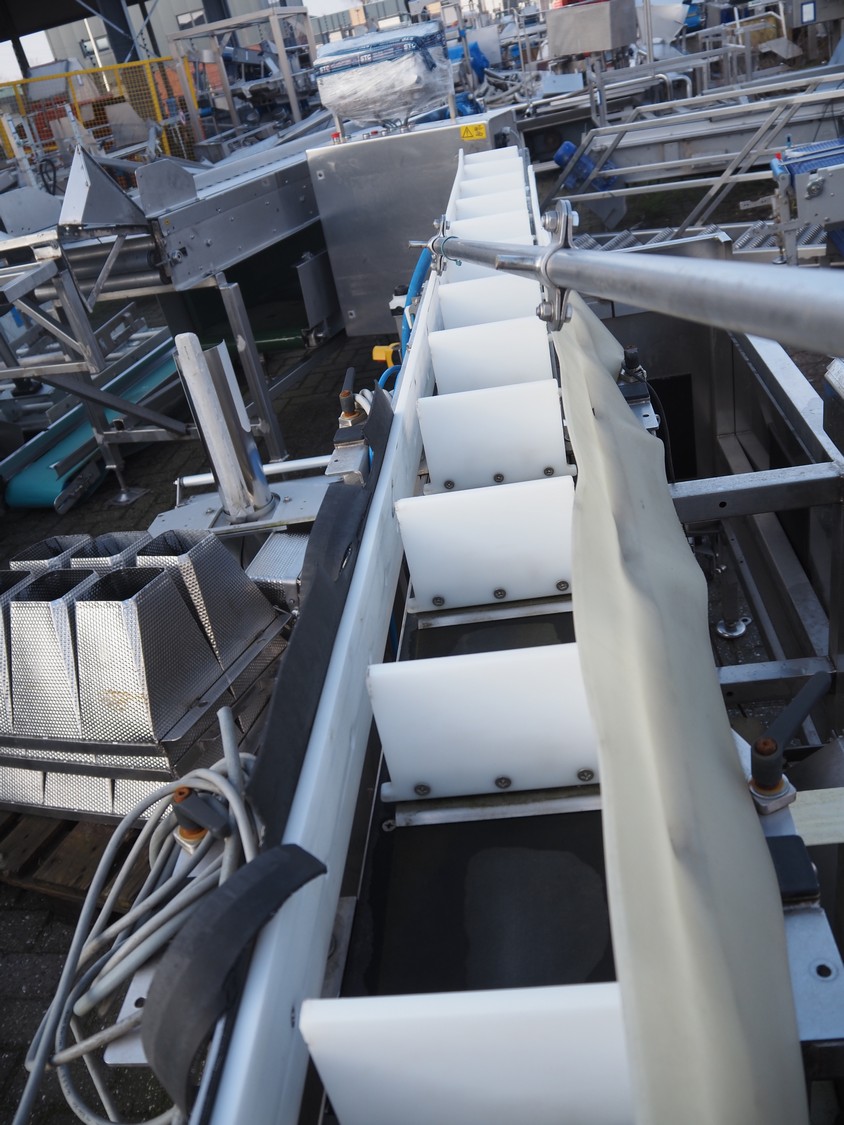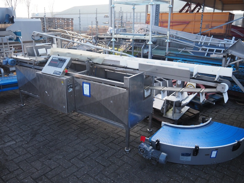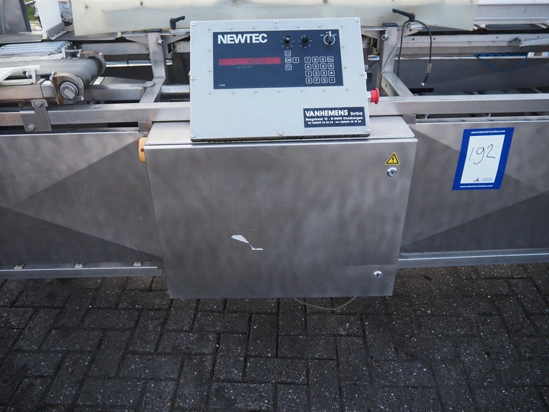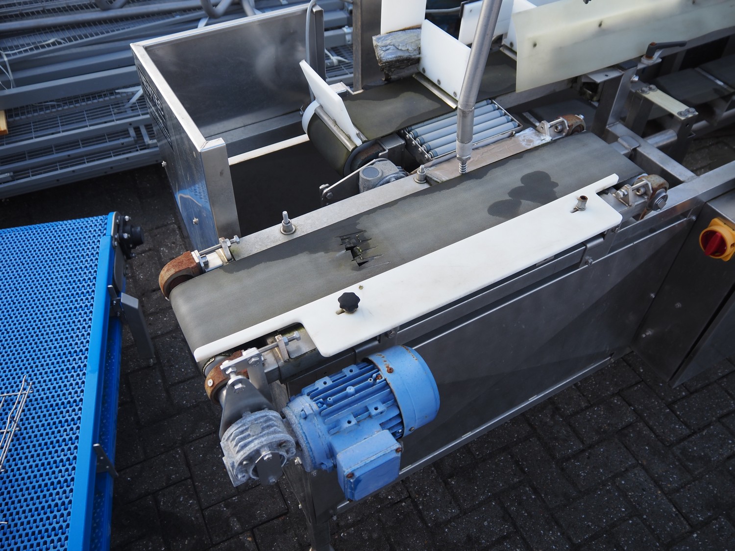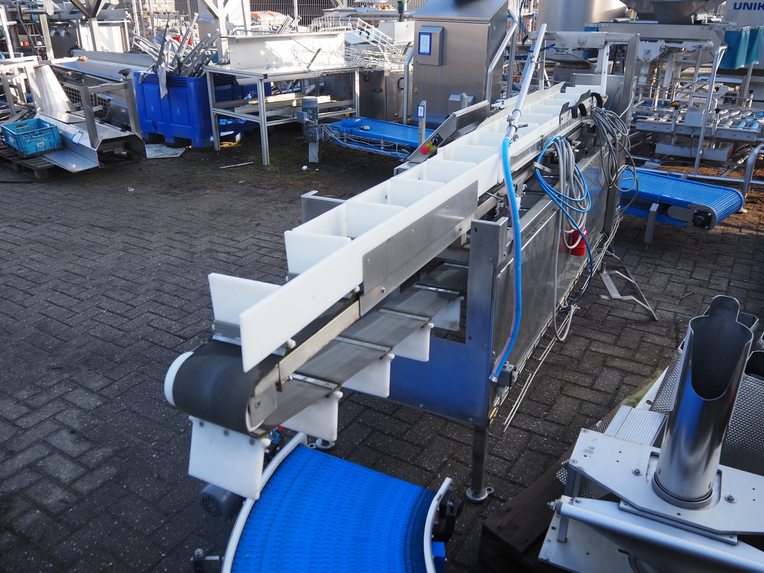 Newtec tray filler, type: NBM61, number: 8581, year of construction: 2007, 400 V, 3 Ph, 3 A, 0.6 kW, plastic belt with dividers, plastic belt, belt width: 150 mm, divider height: 120 mm, distance between dividers: 220 mm, total dimensions: 3600 mm x 900 mm x 1380 mm. Technical condition unknown and incomplete.
