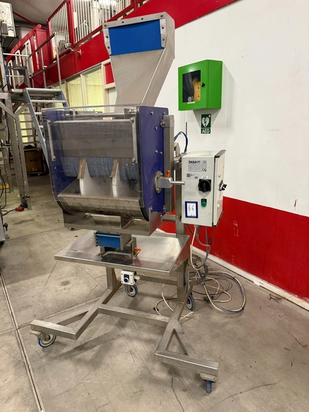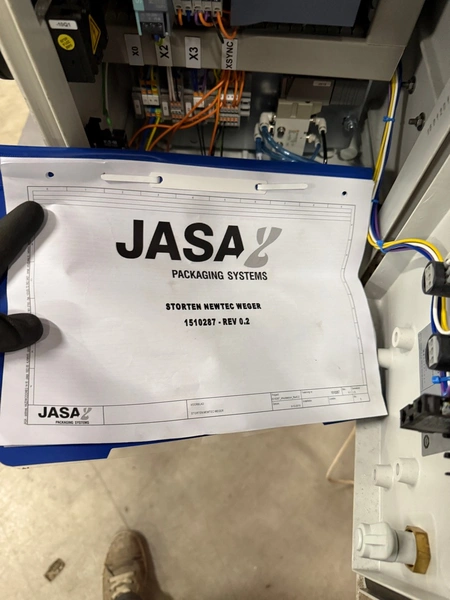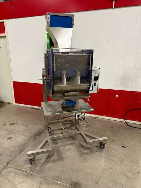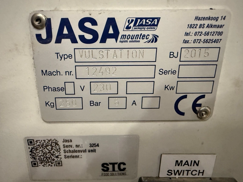 Jasa Packaging Systems mobile tray filling machine, type: VULSTATION, machine number: 12492, year of construction: 2015, 230 V, 6 bar, weight: 250 mm, clearance outfeed: 150 mm x 145 mm, total dimensions: 950 mm x 900 mm x 2100 mm.