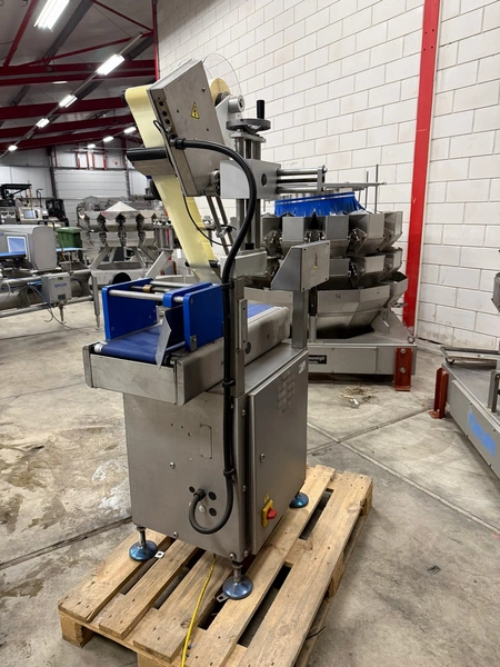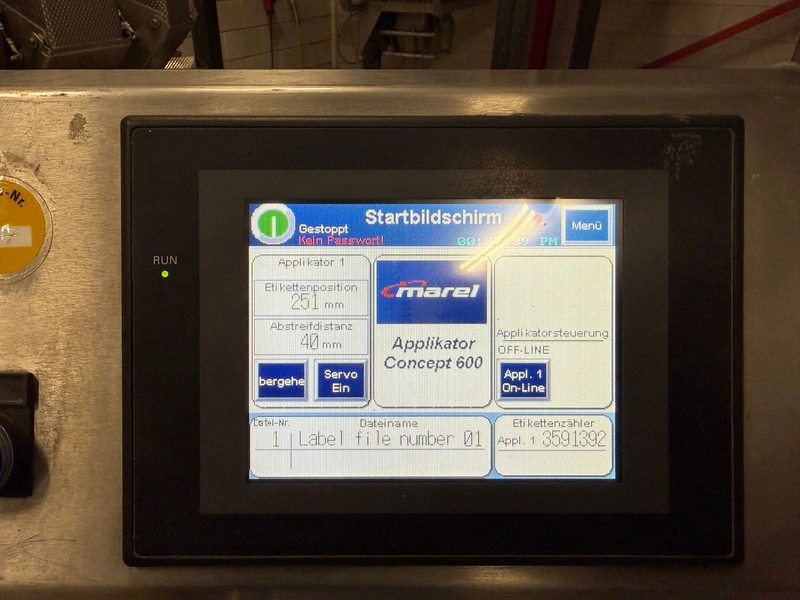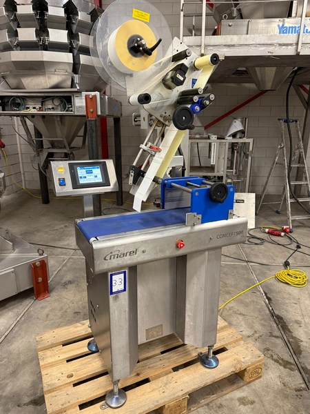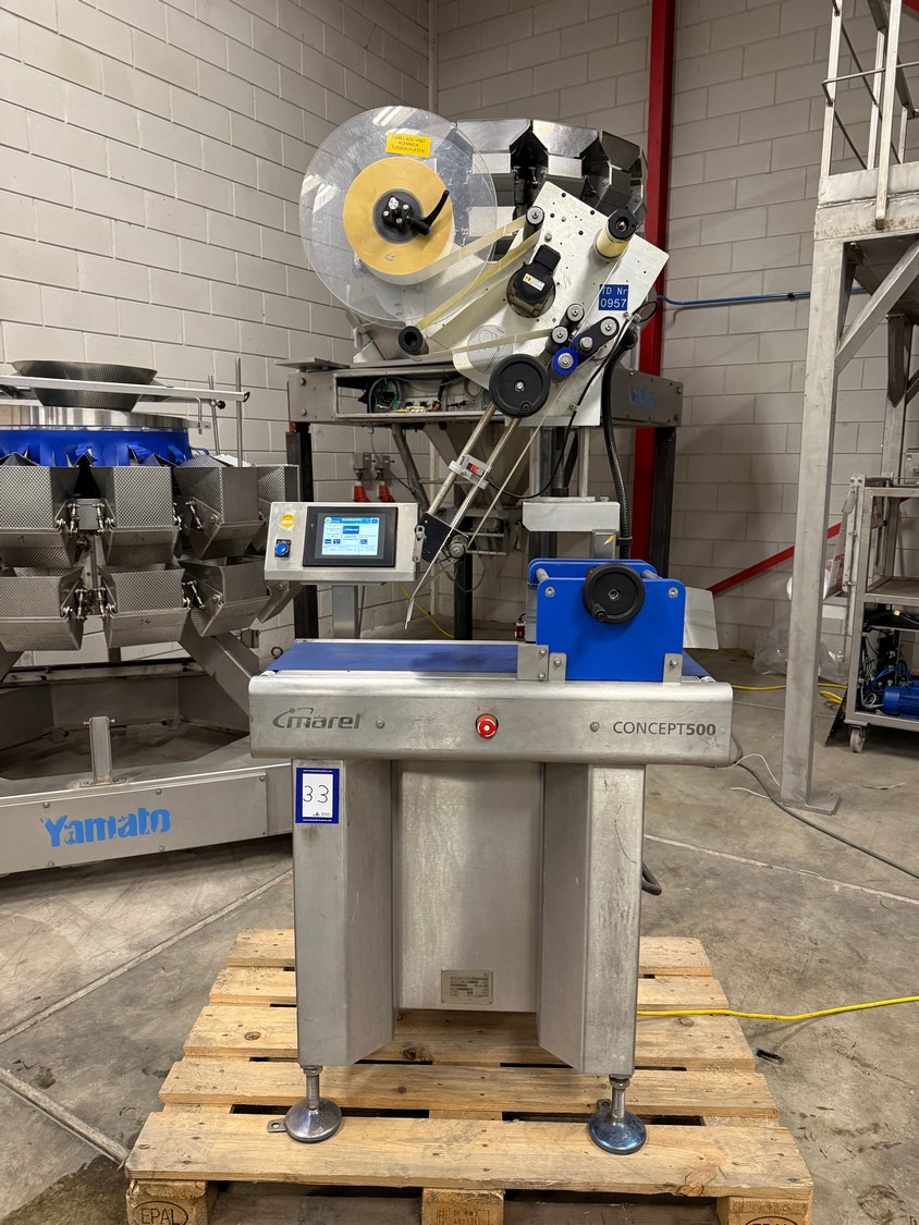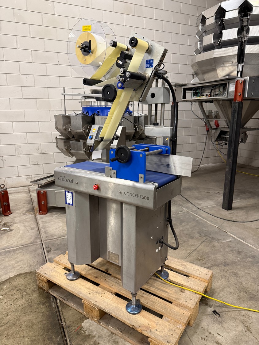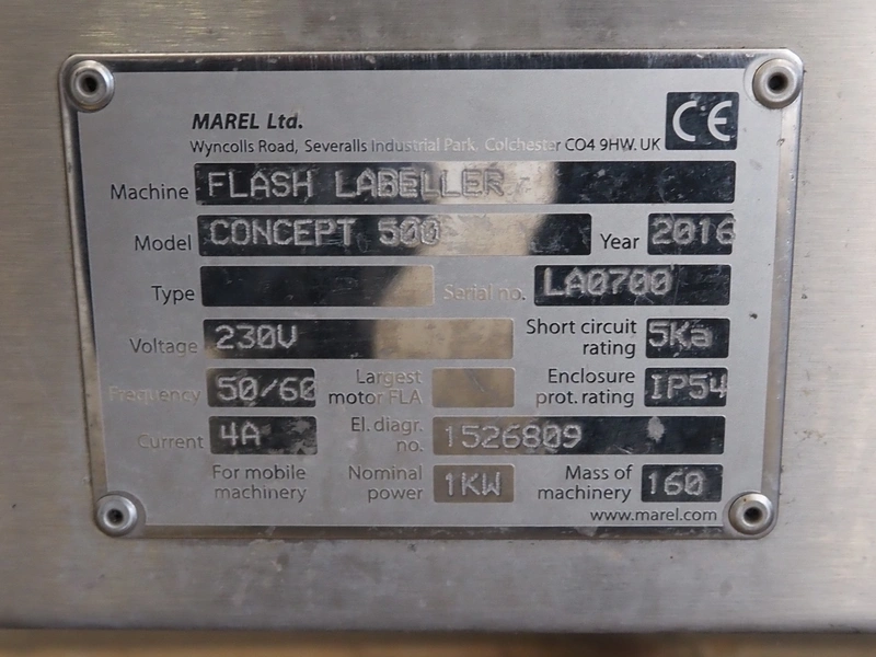 Marel labelling machine, model: CONCEPT 500, serial number: LA0700, year of construction: 2016, 230 V, 50/60 Hz, 4 A, 1 kW, weight: 160 kg, plastic belt, belt width: 240 mm, total dimensions: 900 mm x 700 mm x 1800 mm.