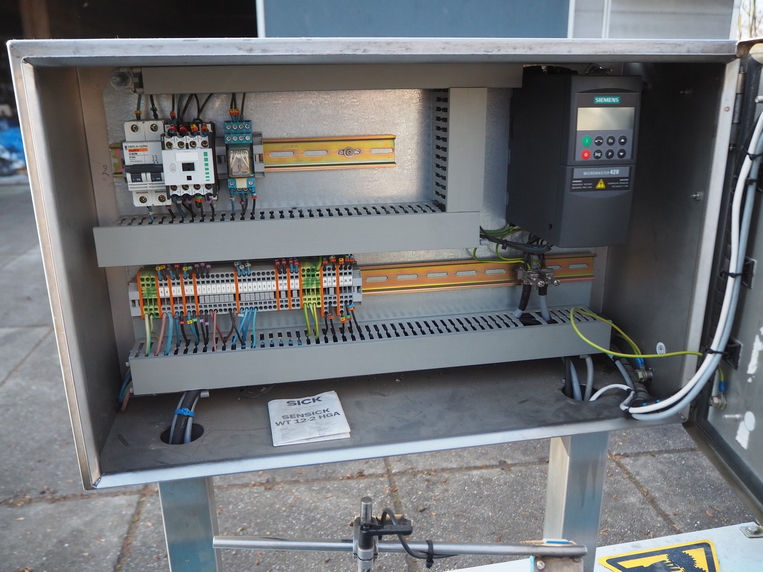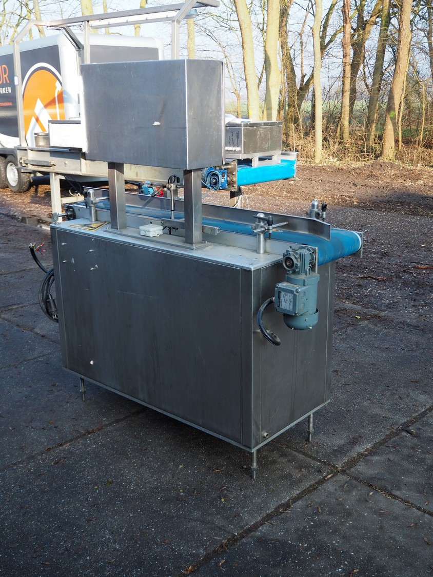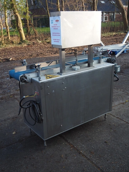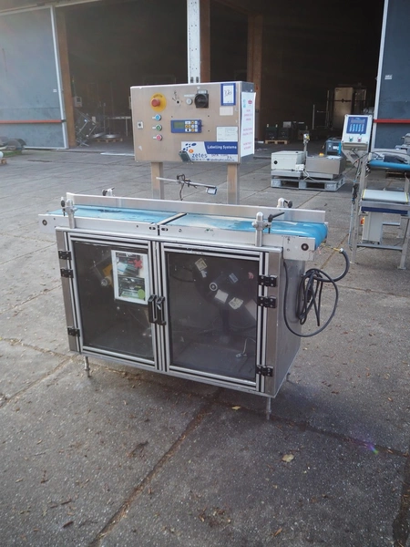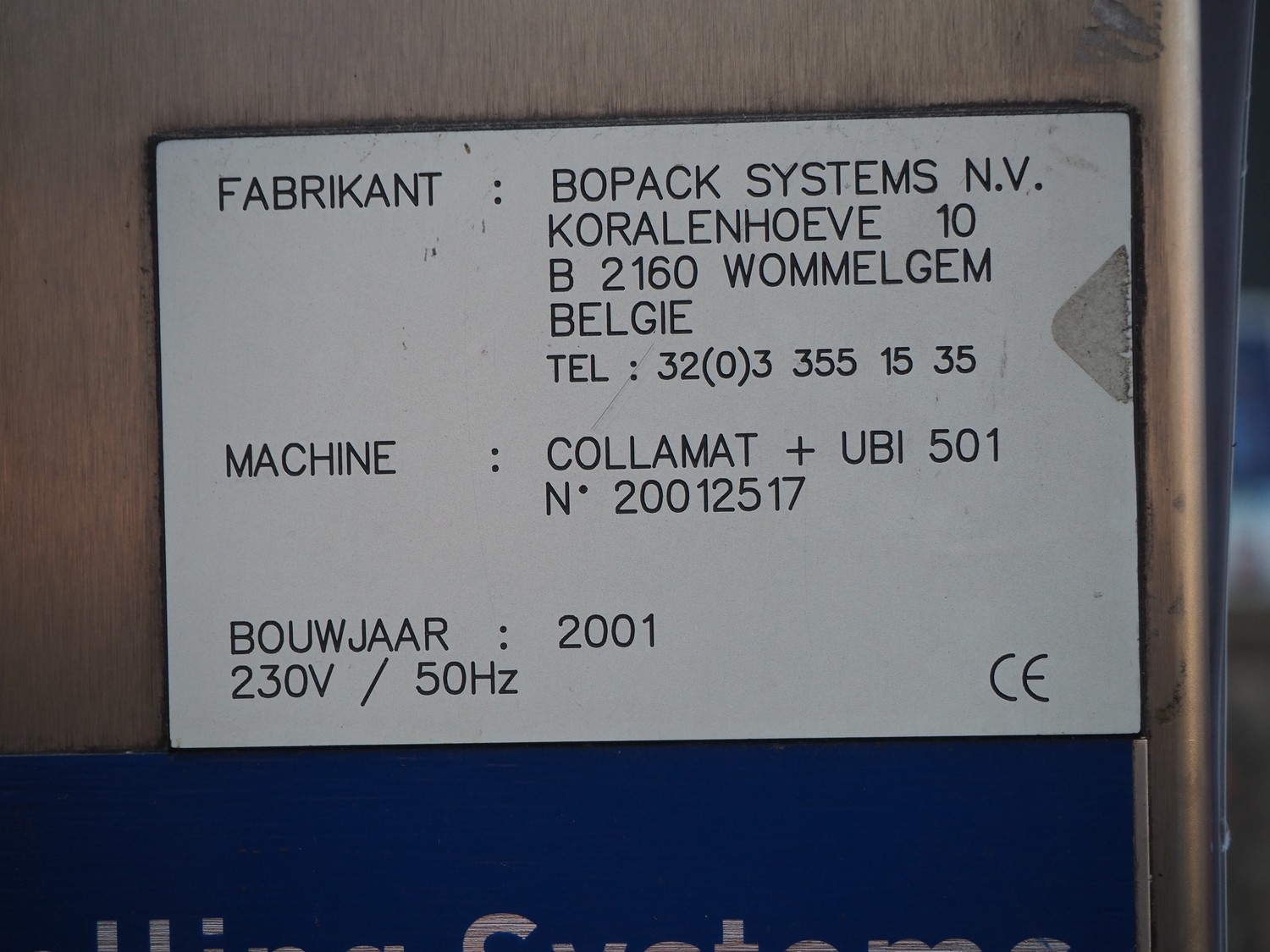 Bopack systems N.V. labelling machine, model: Collamat + UBI 501, serial number: 20012517, year of construction: 2001, 230 V, 50 Hz, plastic belt, belt width: 280 mm, total dimensions: 1520 mm x 600 mm x 1600 mm. Incomplete.