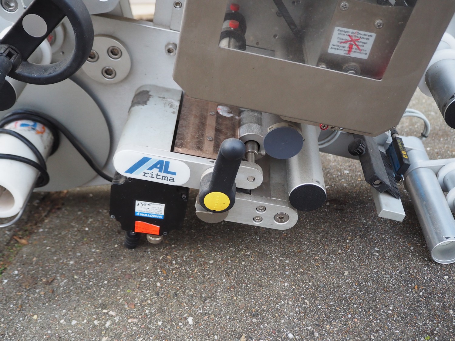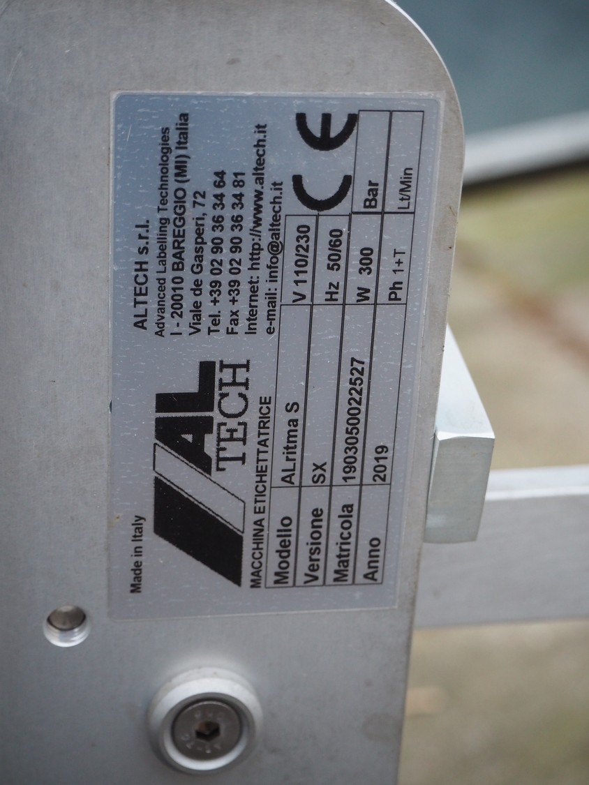 AL Tech labelling machine, model: Alritma S, version: SX, serial number: 1903050022527, year of construction: 2019, 110-230 V, 1 Ph, 50-60 Hz, 300 W, dimensions: 1300 mm x 600 mm x 600 mm. Technical condition unknown.