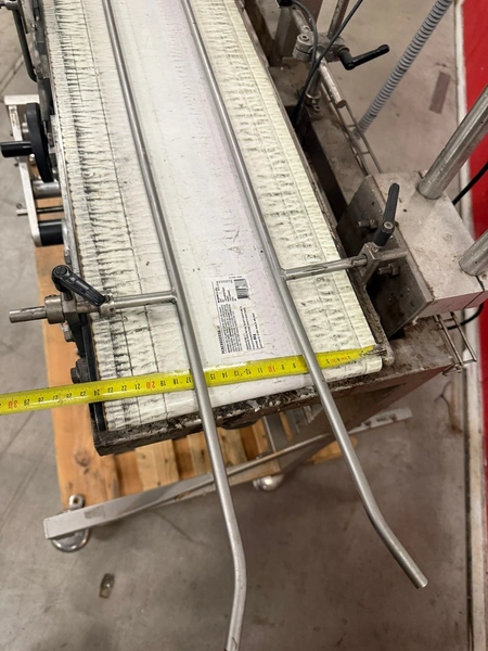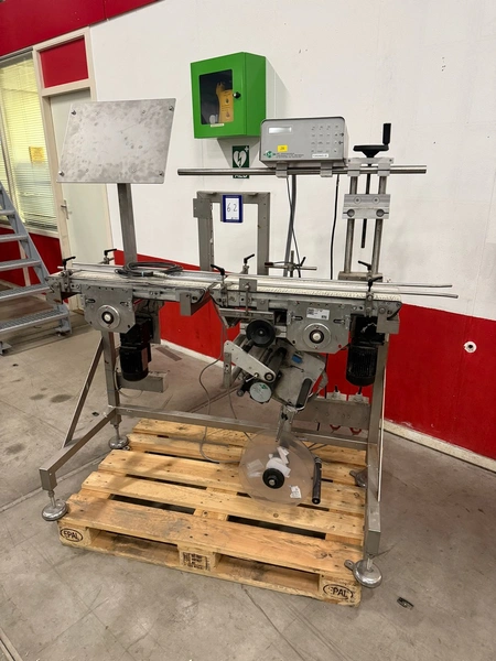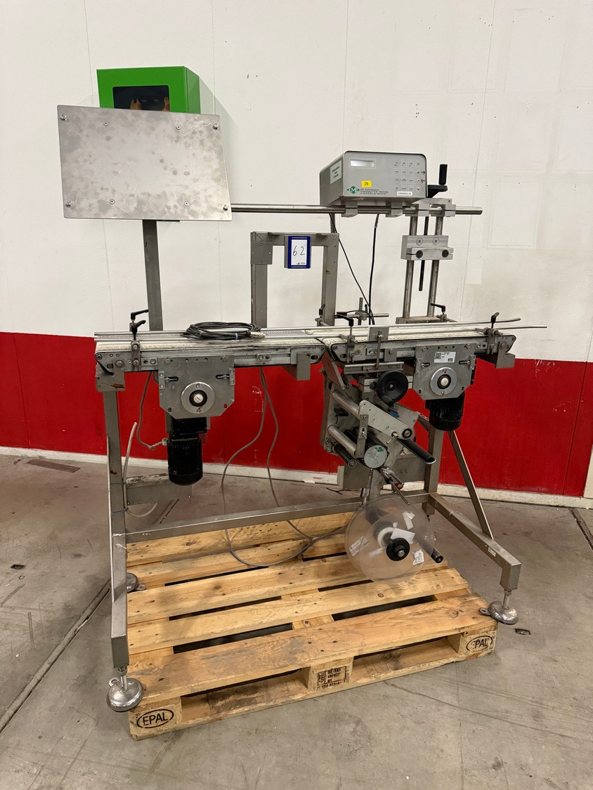 EME labelling machine, type: EME Serie 1000, serial number: SEE Label head, 220-240 VAC, 50/60 Hz, 250 W, belt width: 235 mm, total dimensions: 2200 mm x 750 mm x 1550 mm.