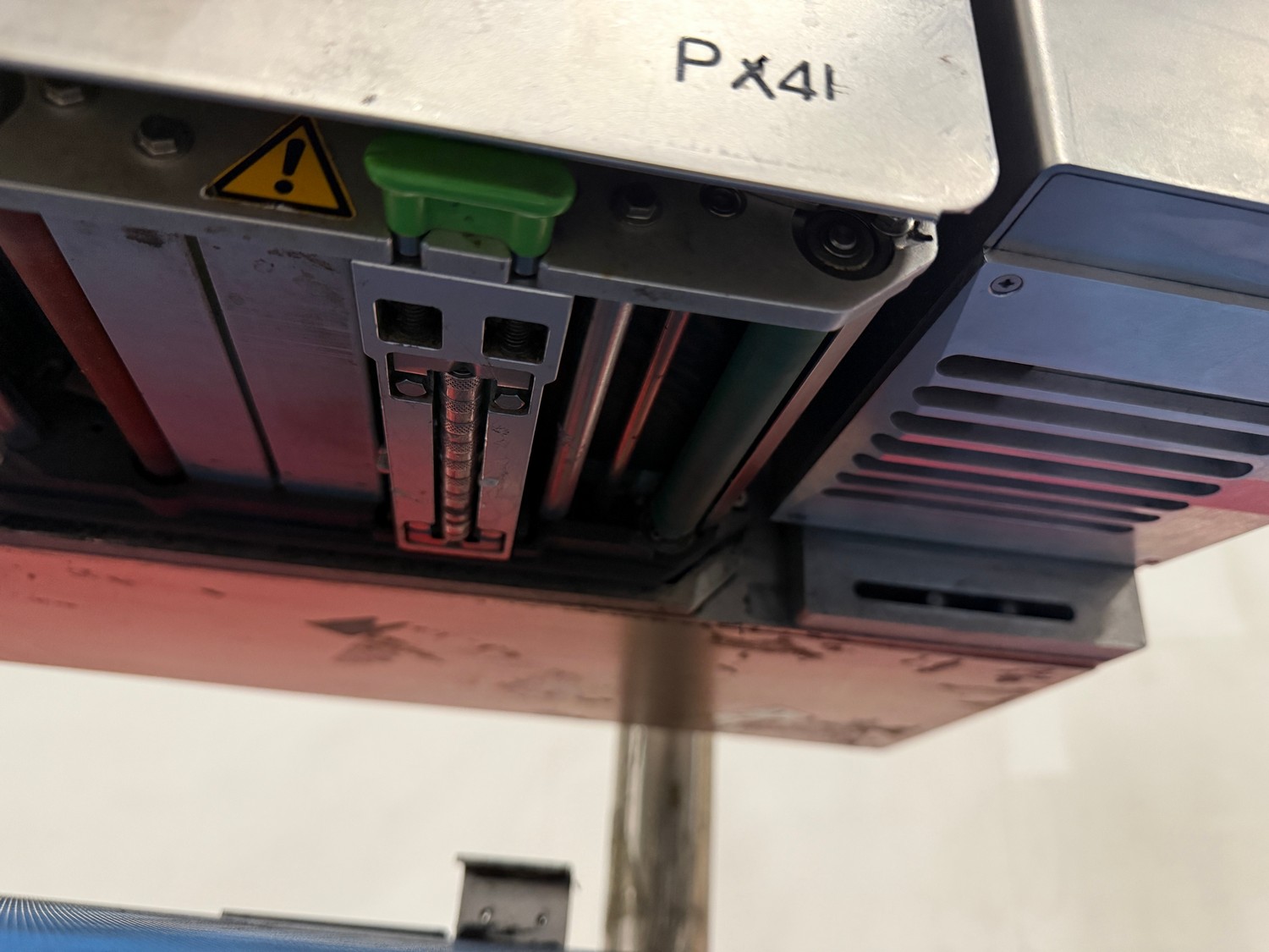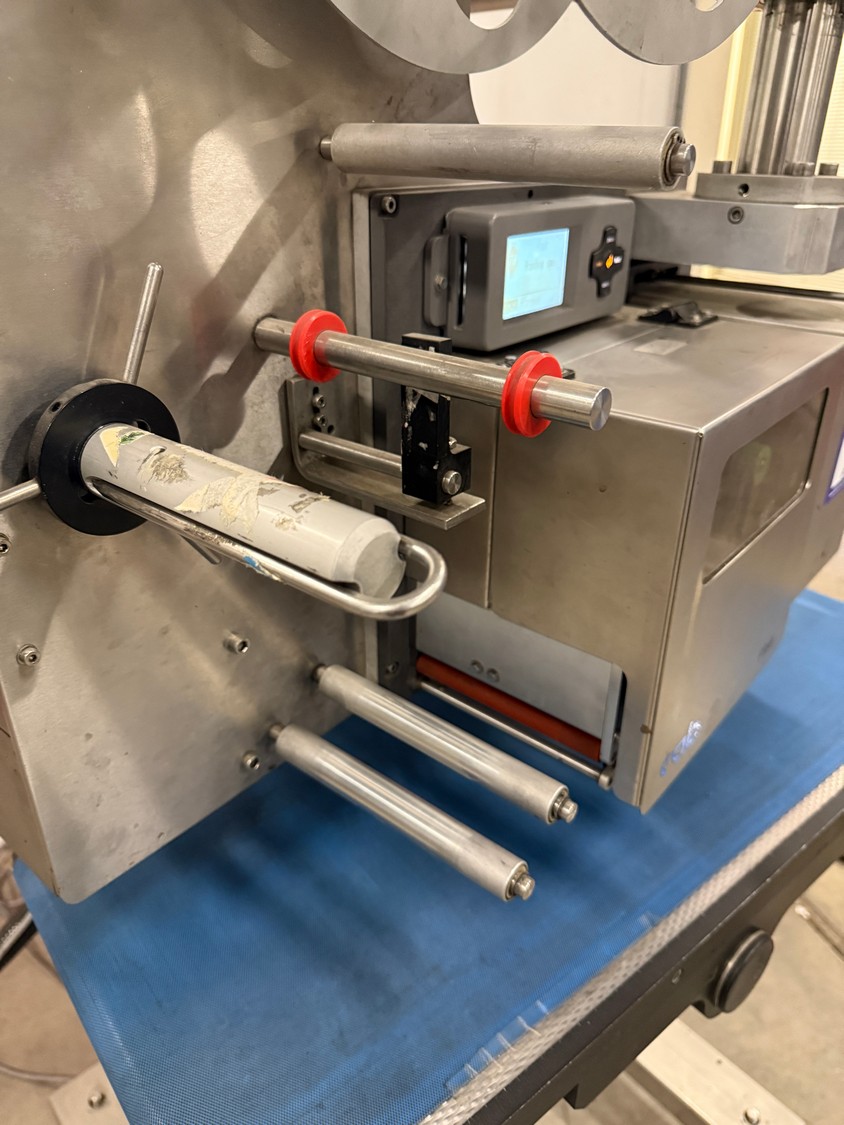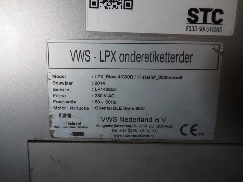 VWS Nederland B.V. labelling machine, model: LPX_Blow 4/300R / H statief_800mmbelt, serial number: LP142852, year of construction: 2014, 230 V, 50-60 Hz, plastic belt, belt width: 295 mm, total dimensions: 700 mm x 800 mm x 1700 mm.