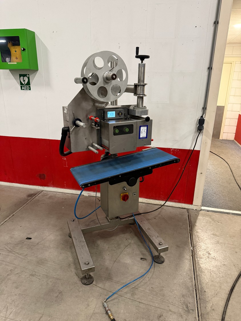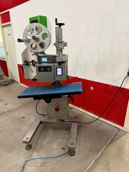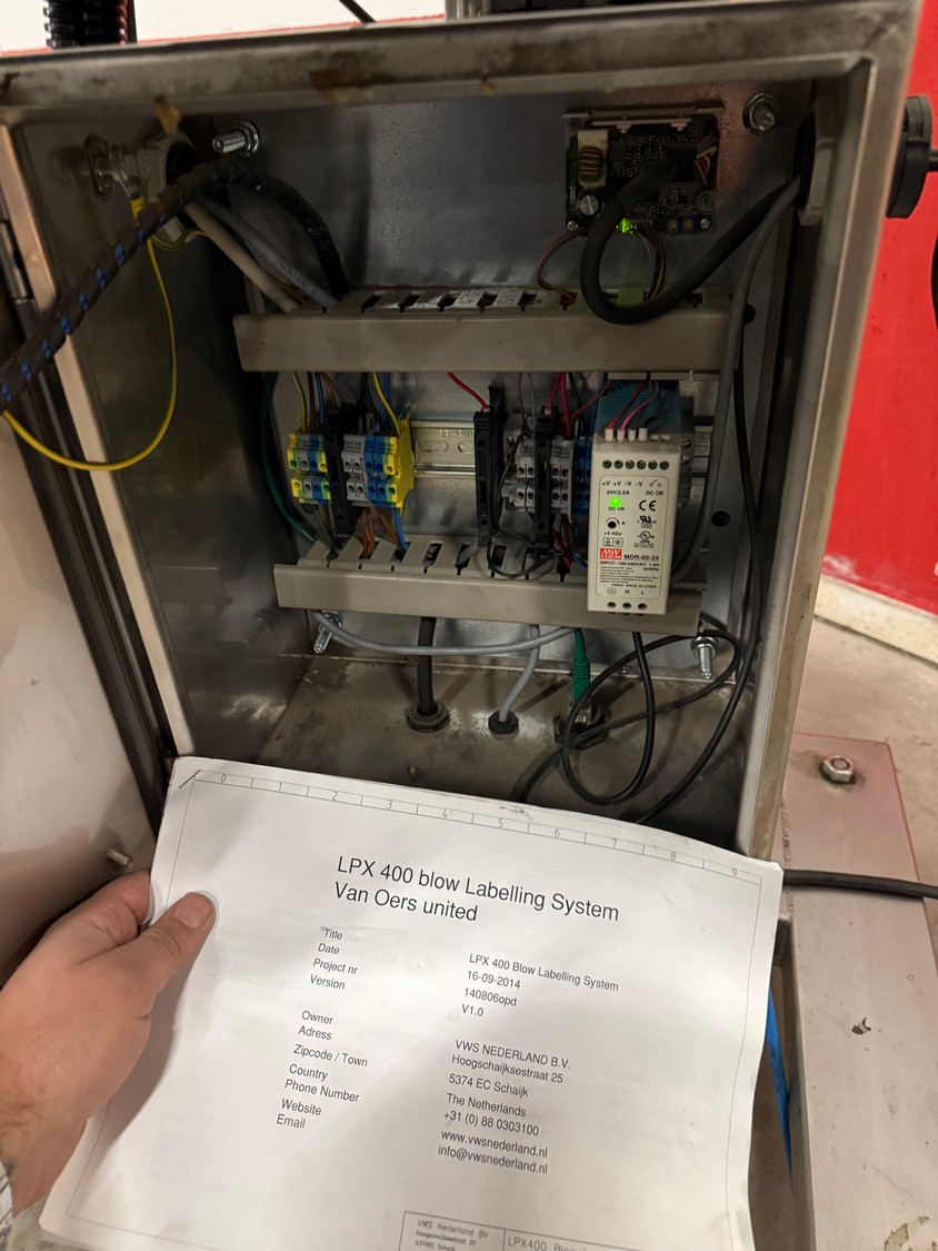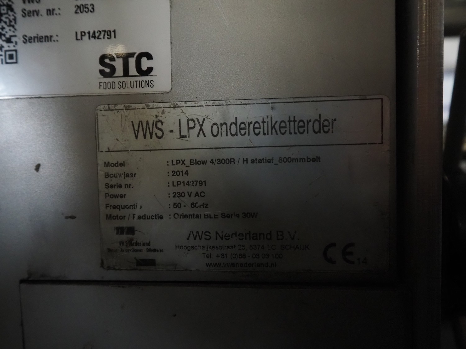 VWS Nederland B.V. labelling machine, model: LPX_Blow 4/300R/H statief_800mmbelt, serial number: LP142791, year of construction: 2014, 230 V, 50-60 Hz, plastic belt, belt width: 300 mm, total dimensions: 750 mm x 800 mm x 1750 mm.