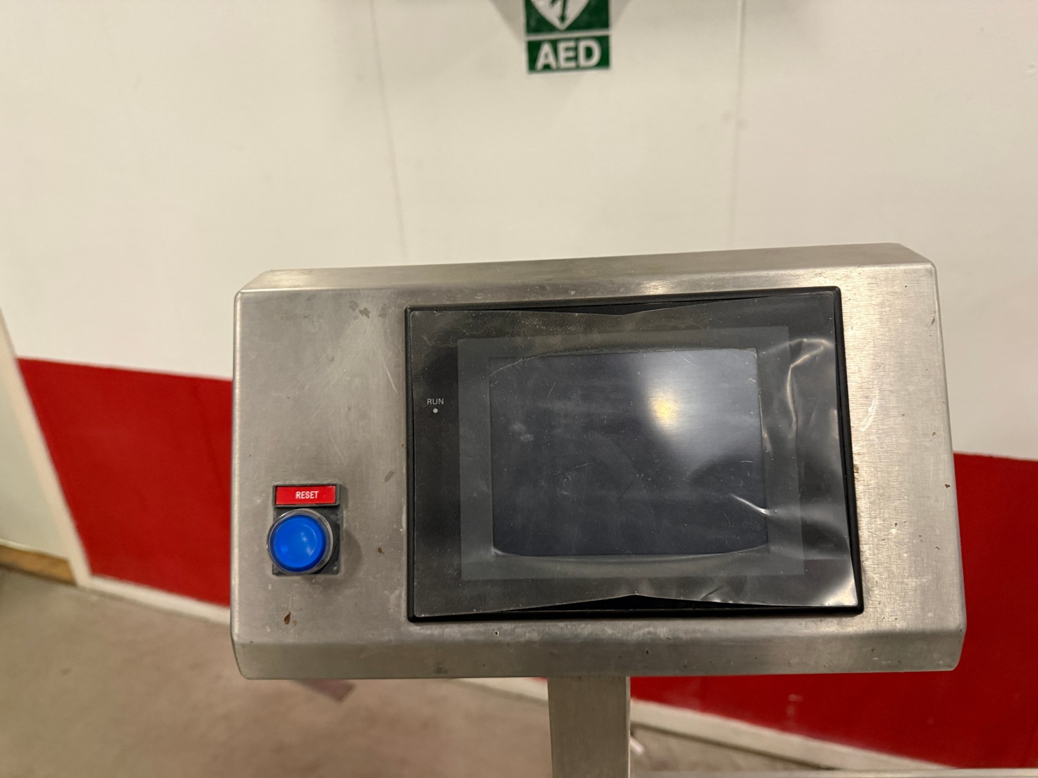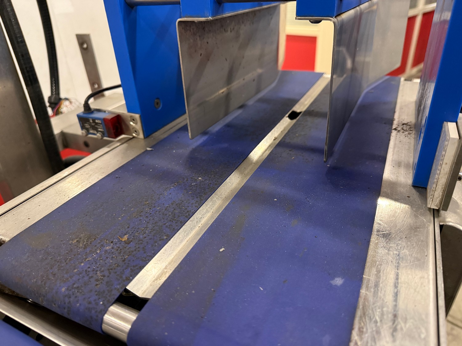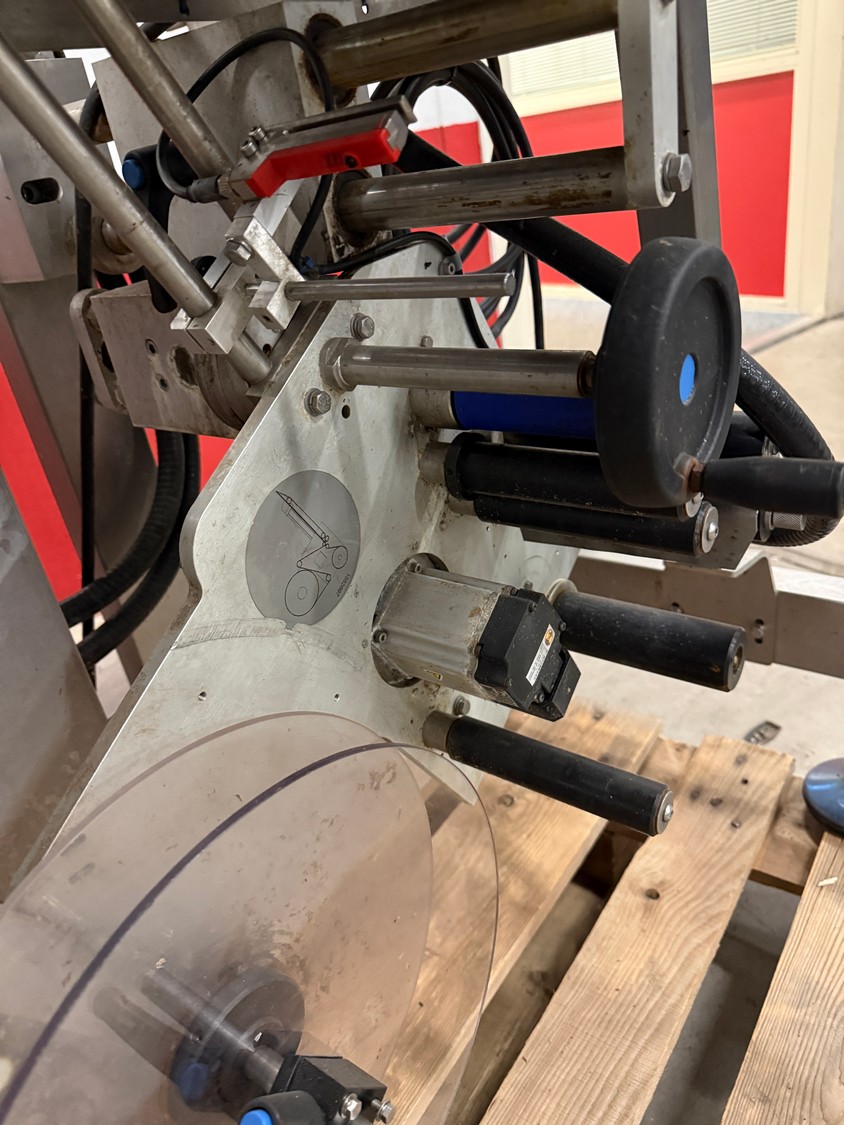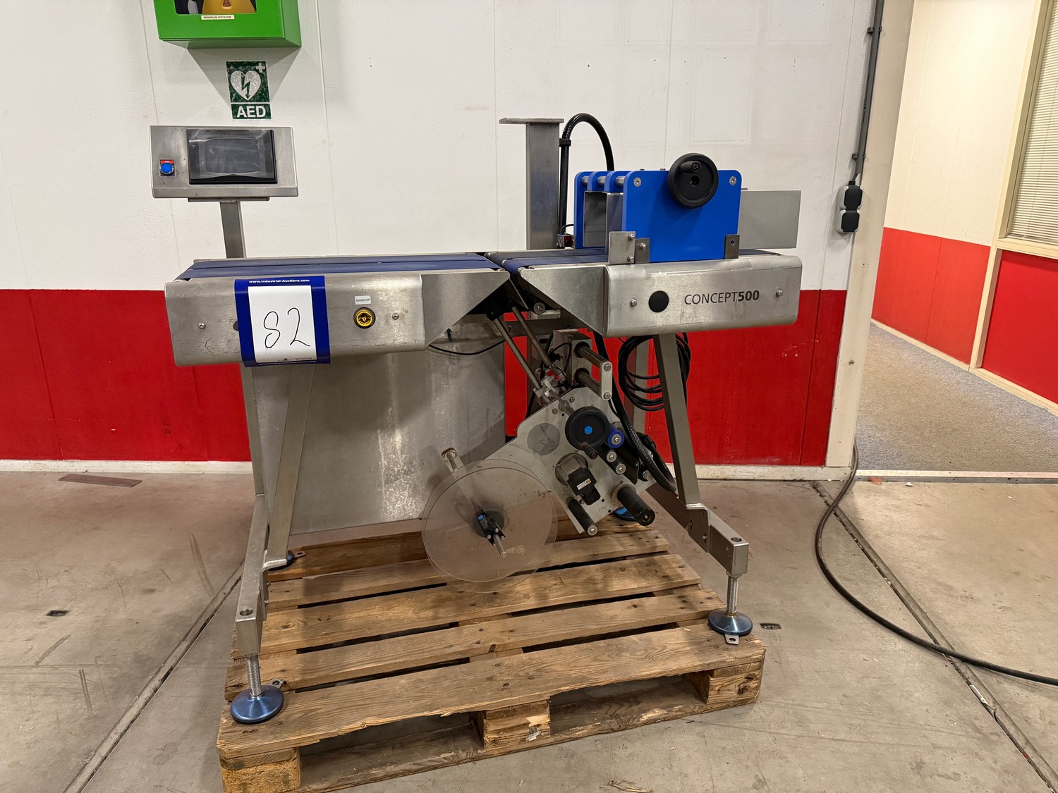 Marel bottom labelling machine, model: Concept 500, serial number: LA0754, year of construction: 2018, 230 V, 50/60 Hz, 1 kW, weight: 160 kg, plastic belt, belt width: (2x) 110 mm, total dimensions: 1320 mm x 780 mm x 1800 mm.