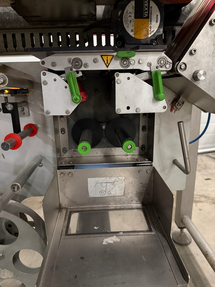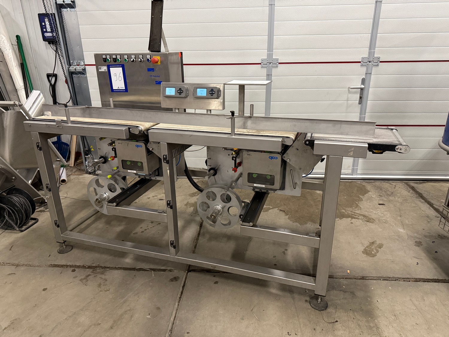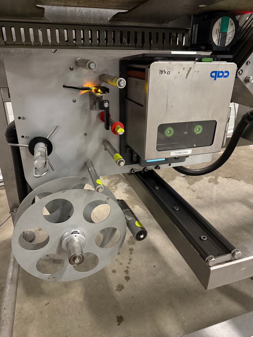 VWS Nederland B.V. labelling machine, plastic belt, belt width: 280 mm, total dimensions: 2100 mm x 850 mm x 1300 mm.