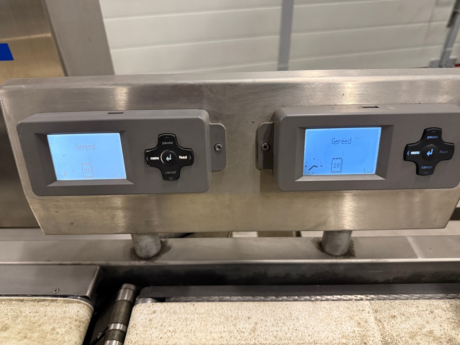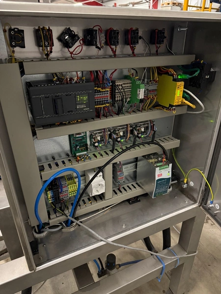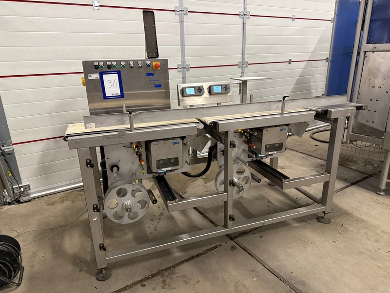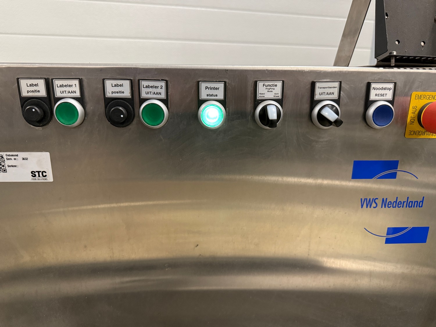 VWS Nederland B.V. labelling machine, plastic belt, belt width: 280 mm, total dimensions: 2100 mm x 850 mm x 1300 mm.