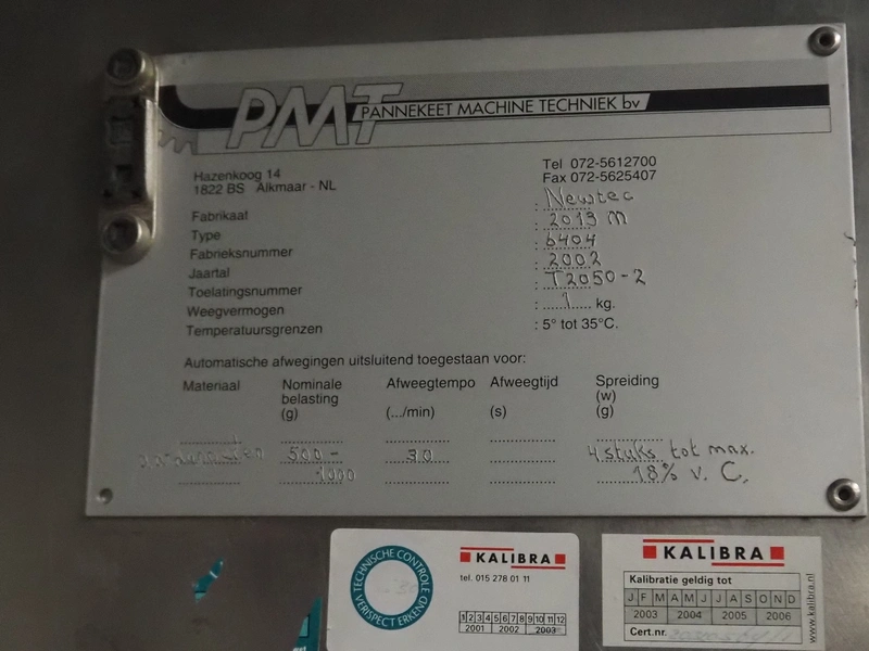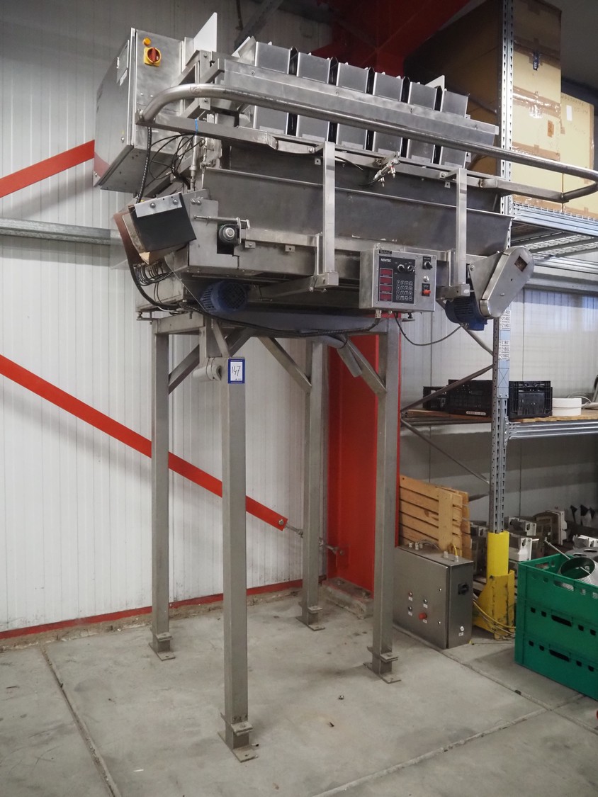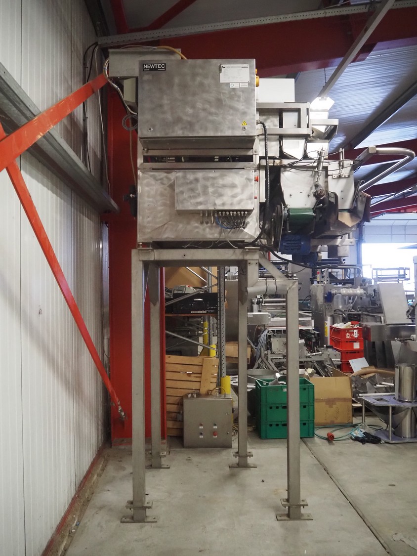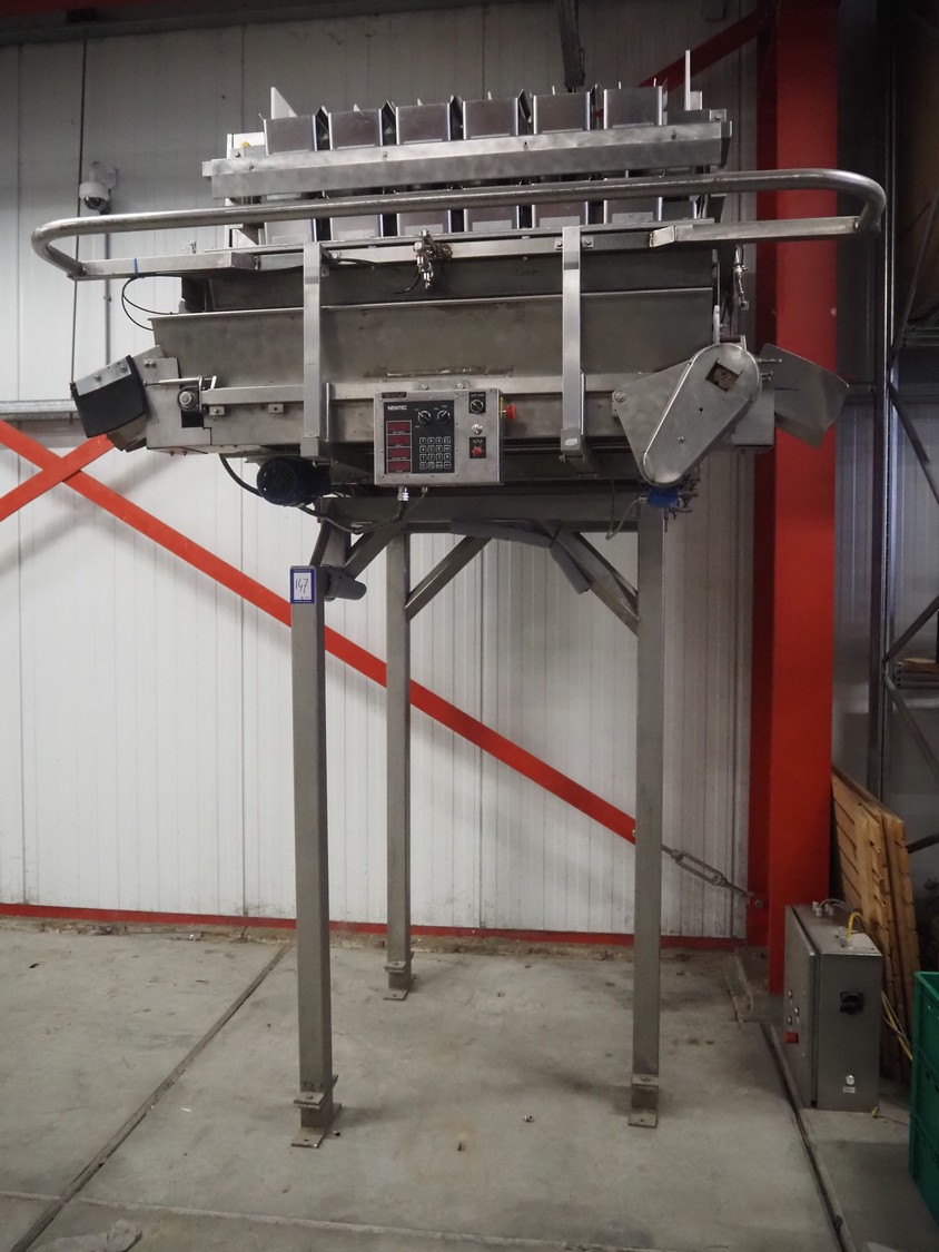 Newtec 6-lanes linear weigher on s/s platform, type: 2013M, number: 6404, year of construction: 2002, 400 V, 3 Ph, 50 Hz, 9 A, 1.4 kW, 6, lane width: 85 mm, total dimensions: 1900 mm x 2000 mm x 3320 mm.