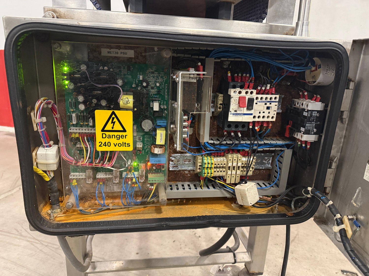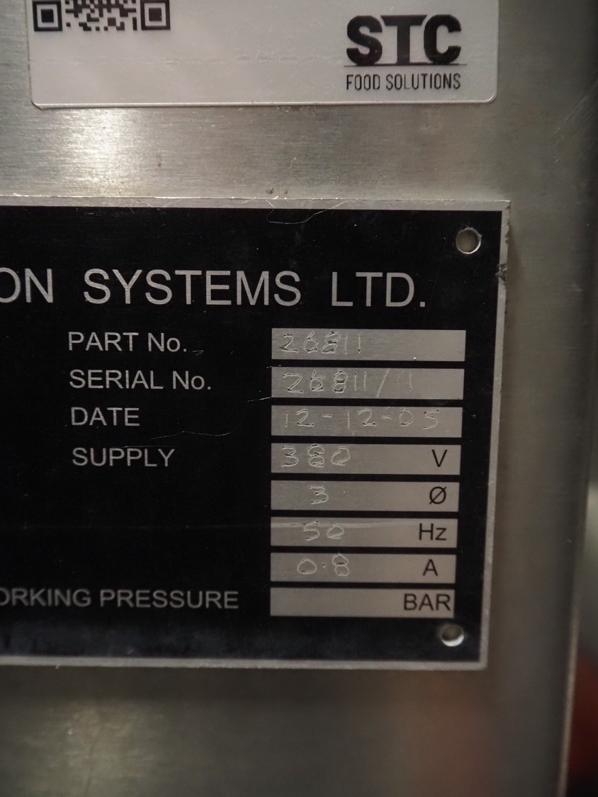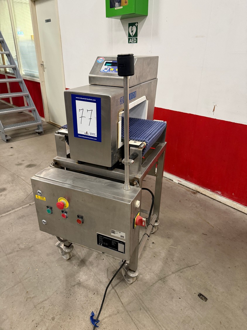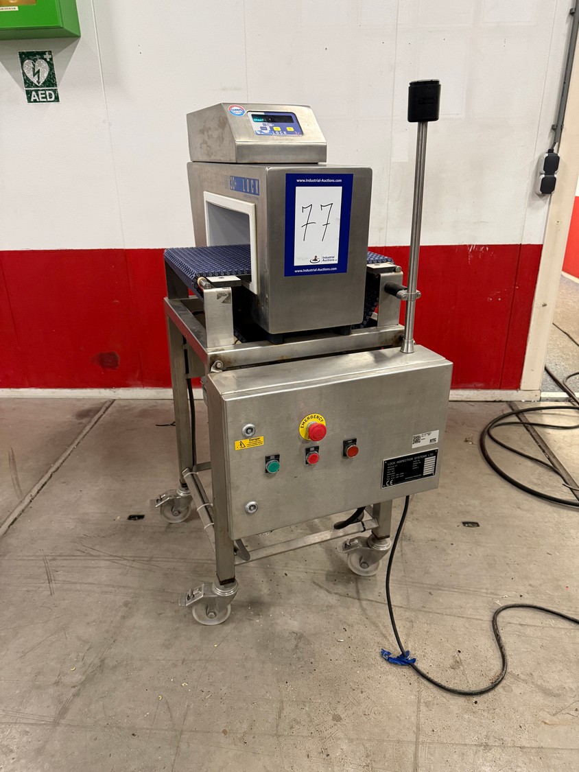Lock Inspection Systems mobile metal detector, model: MET30+, serial number: 26811/1, year of construction: 12-12-05, 380 V, 3 Ph, 50 Hz, 0.8 A, plastic mesh belt, belt width: 350 mm, clearance: 370 mm x 120 mm, total dimensions: 870 mm x 500 mm x 1260 mm.
