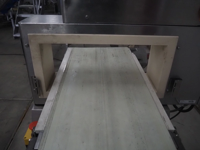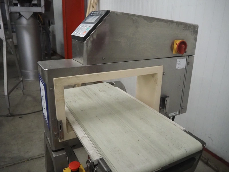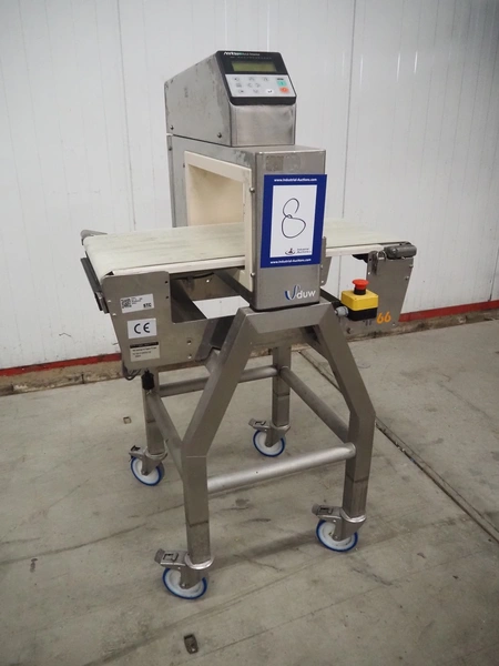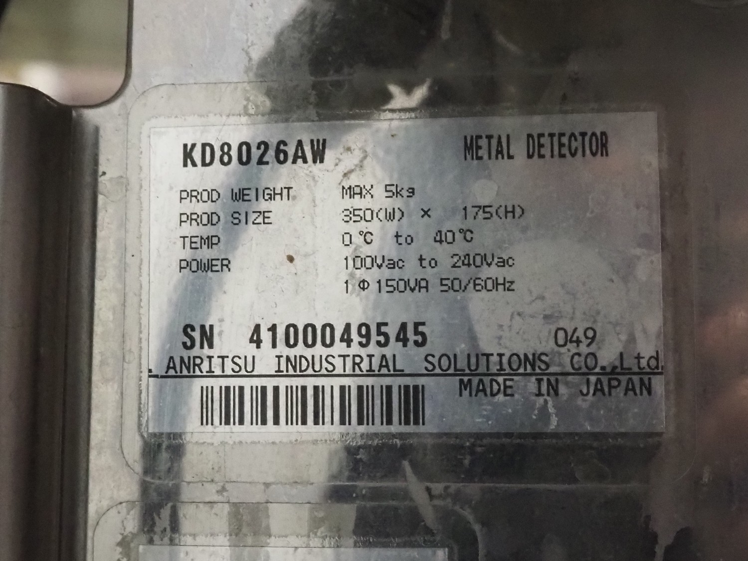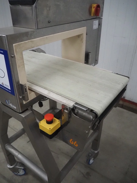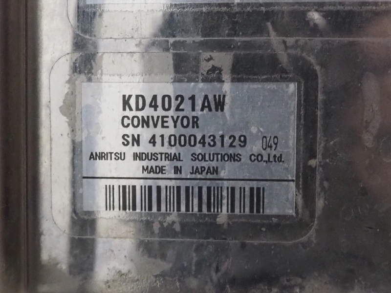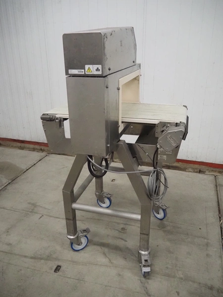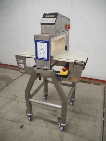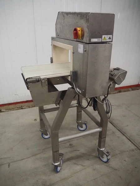Anritsu mobile metal detector, type: KD8026AW, serial number: 4100049545, year of construction: 2004, 100-240 V, 1 Ph, 50/60 Hz, maximum product weight: 5 kg, plastic belt, belt width: 350 mm, clearance: 450 mm x 170 mm, total dimensions: 760 mm x 750 mm x 1130 mm.