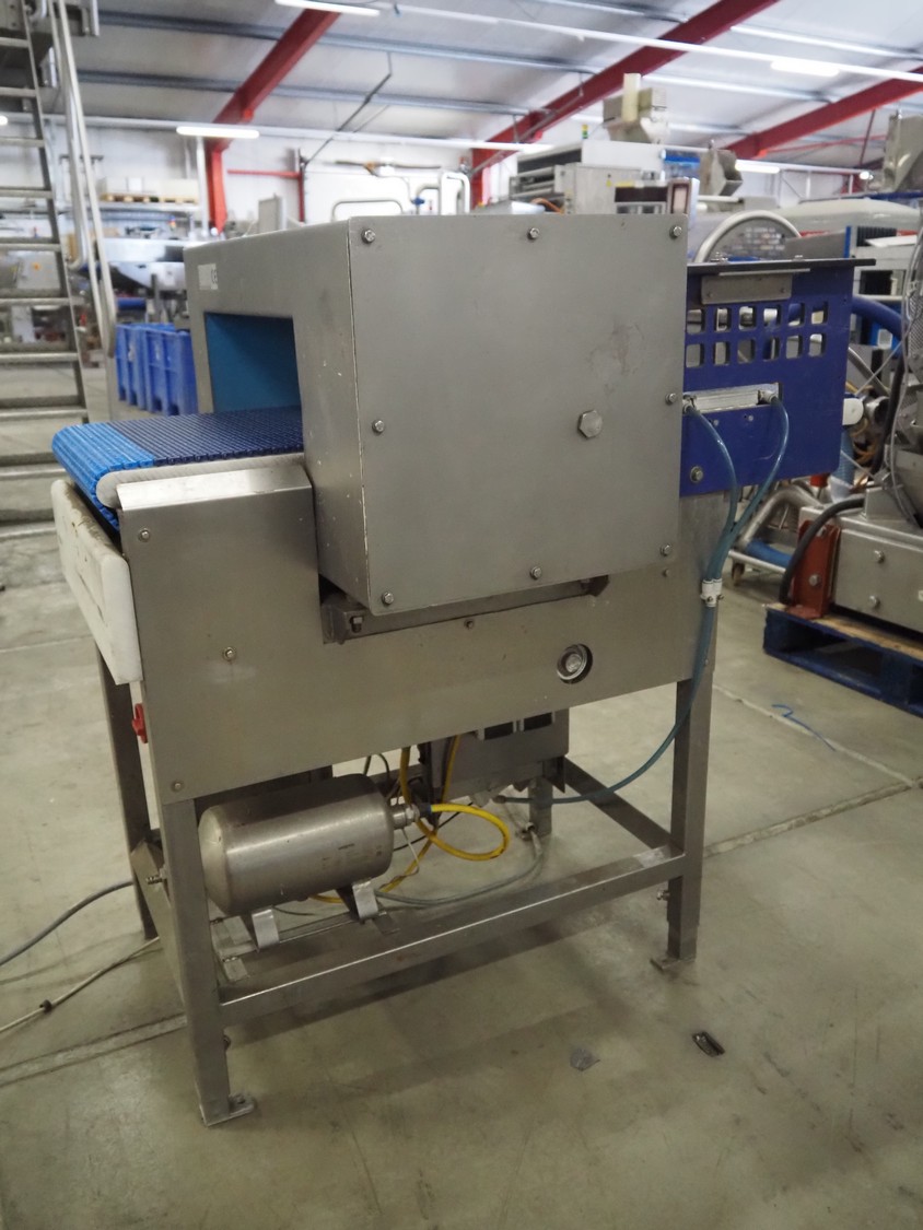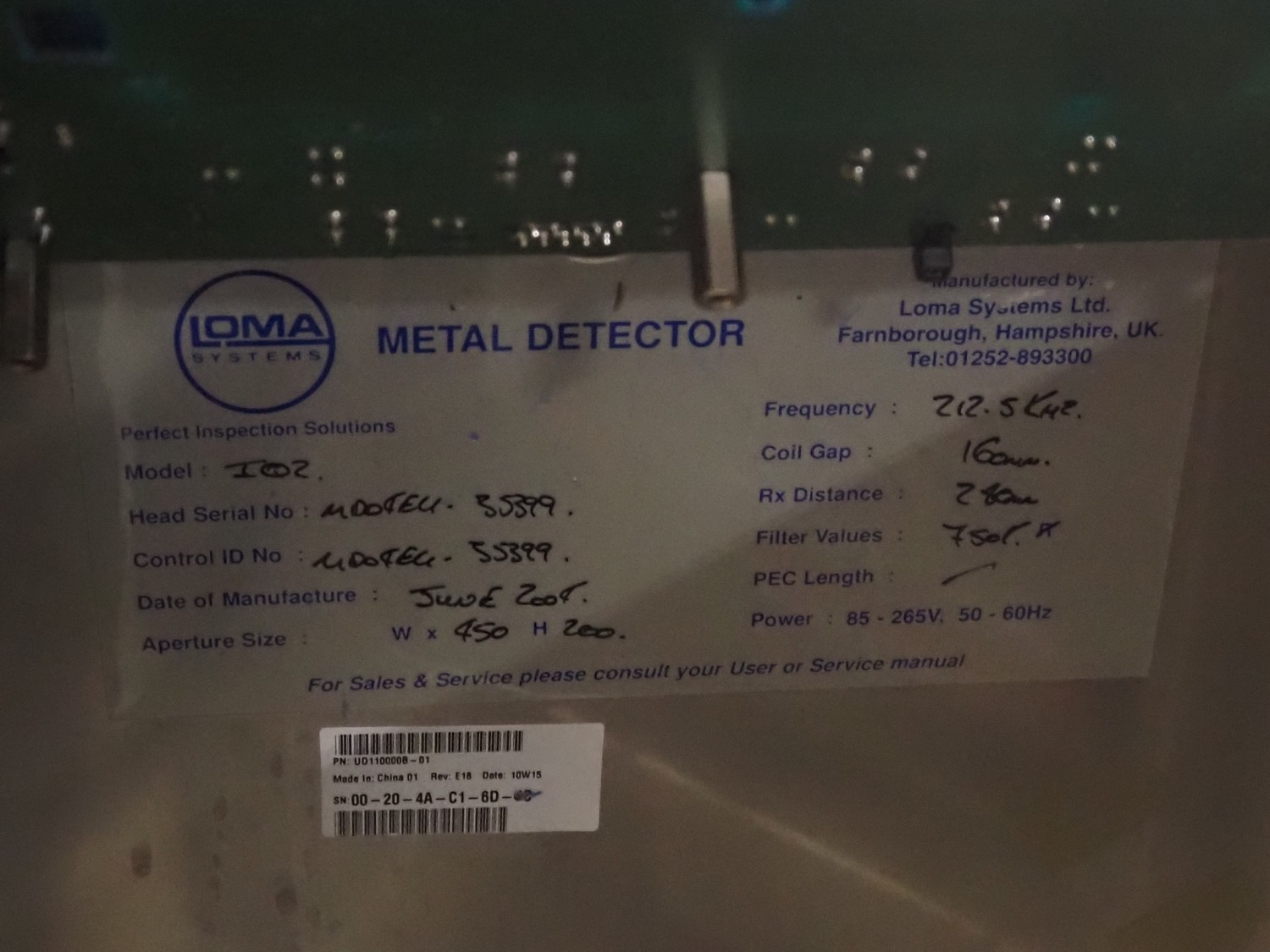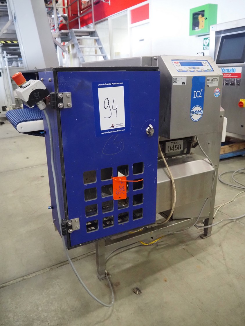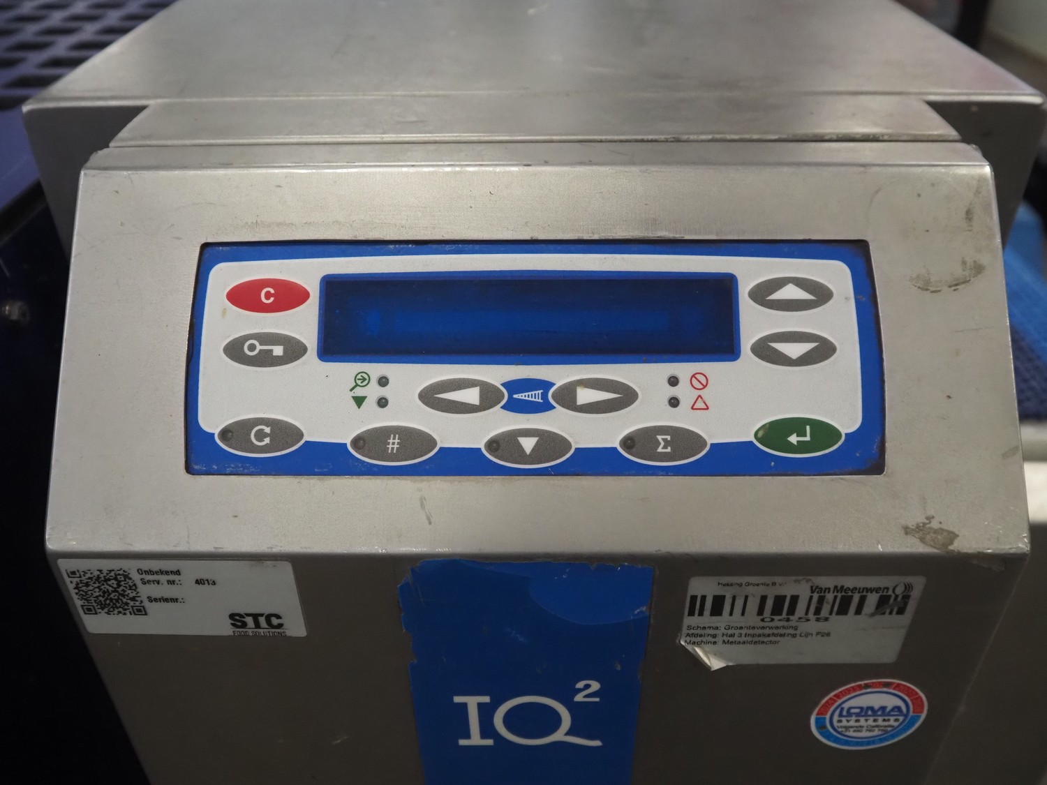 Loma Systems metal detector, model: IQ2, serial number: 11143, year of construction: 2004, 400 V, 3 Ph, 0.35 kW, plastic mesh belt, belt width: 400 mm, clearance: 450 mm x 150 mm, total dimensions: 1200 mm x 950 mm x 1150 mm.