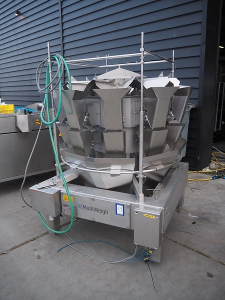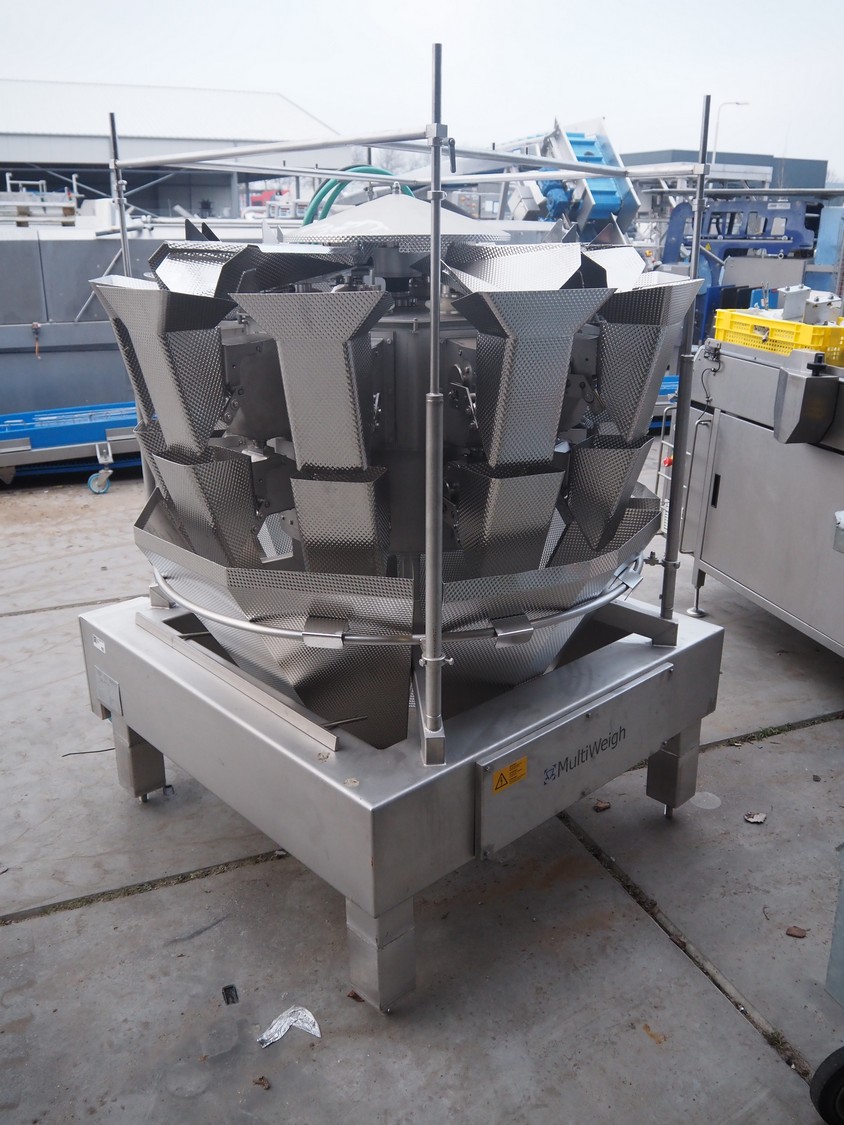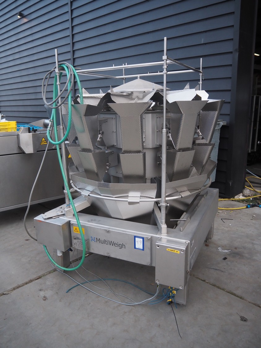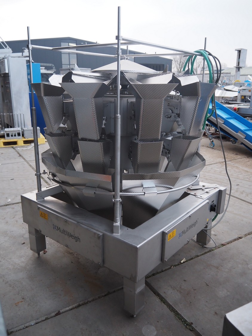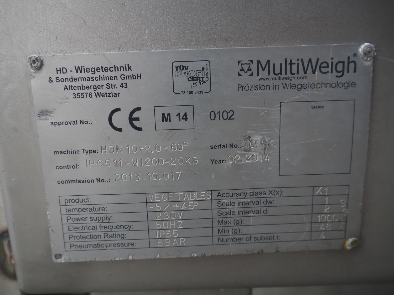 MultiWeigh 10-heads multihead weigher, type: HDW 10-2.0-60, serial number: X0759, year of construction: 02.2014, 230 V, 1 Ph, 50 Hz, minimum weight: 45 g, maximum weight: 1000 g, d=1/2 g, dimensions: 1250 mm x 1300 mm x 1800 mm. Incomplete, missing one outfeed gutter.