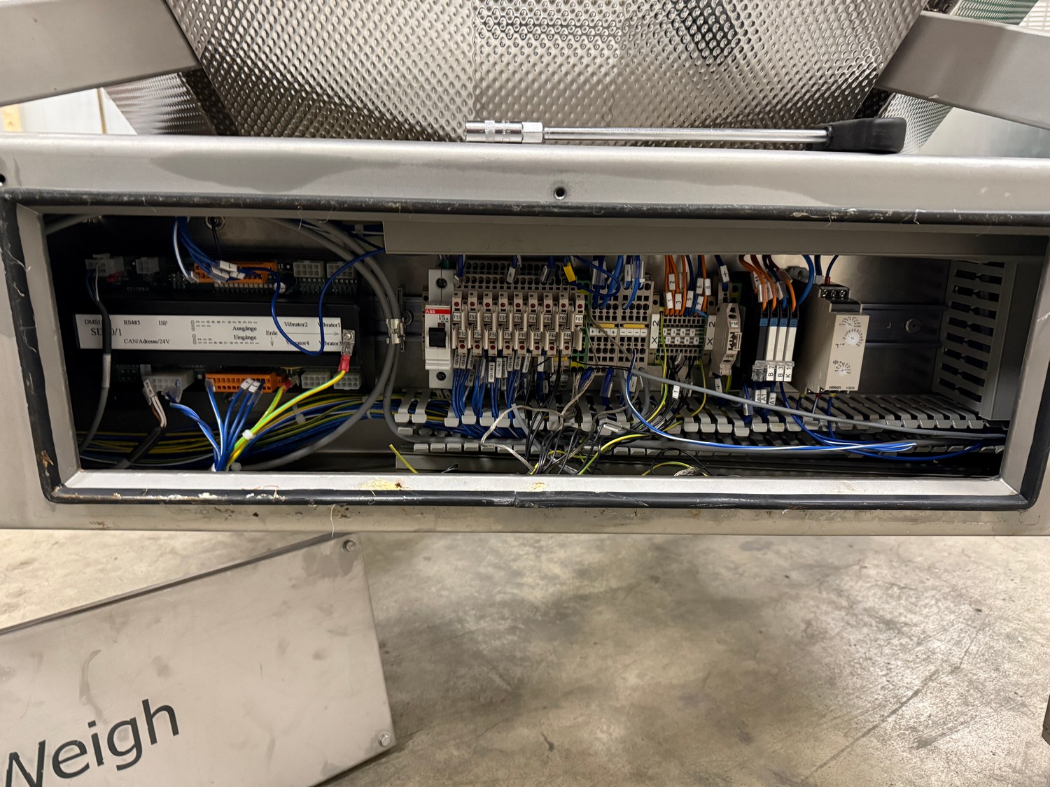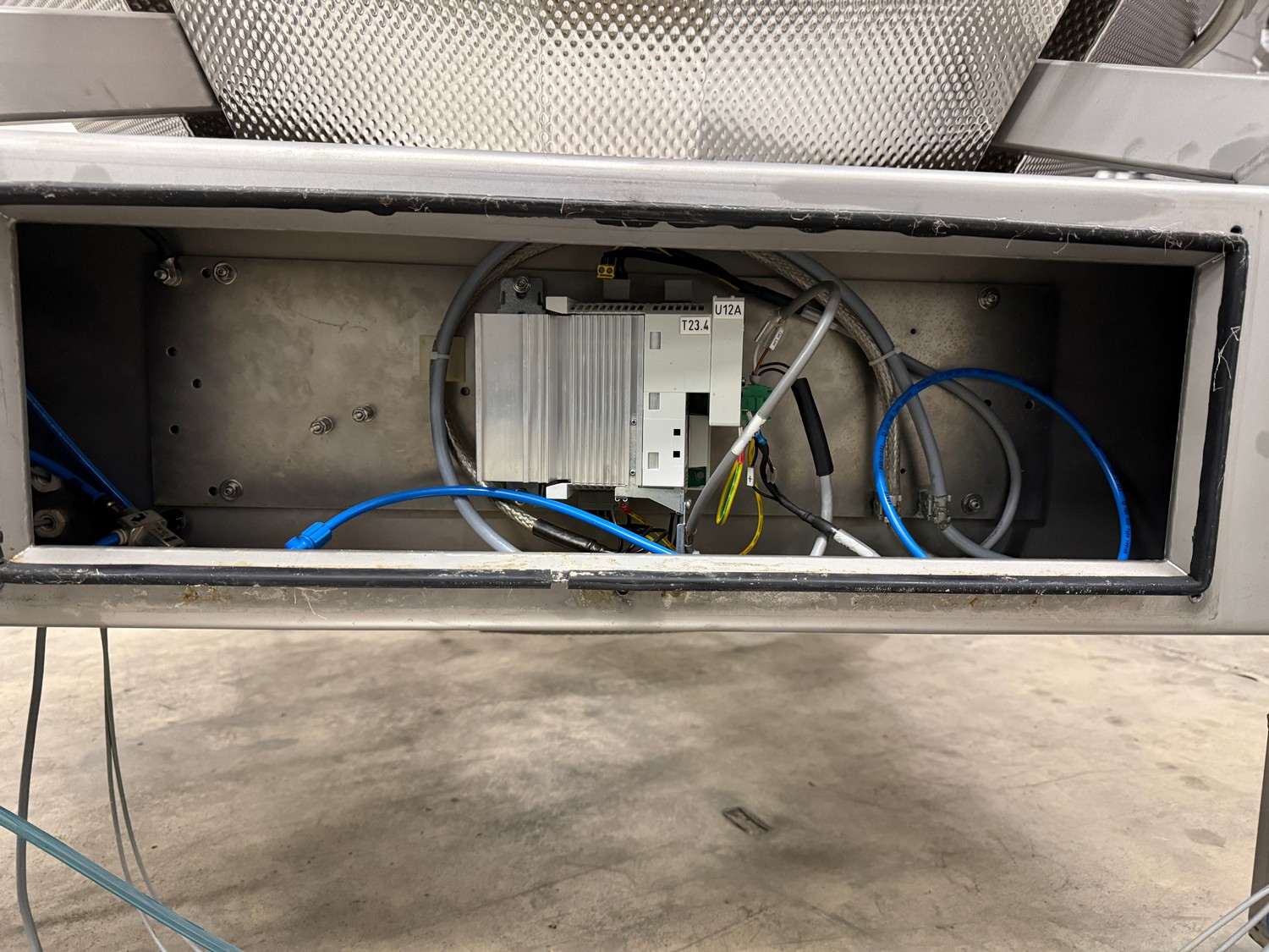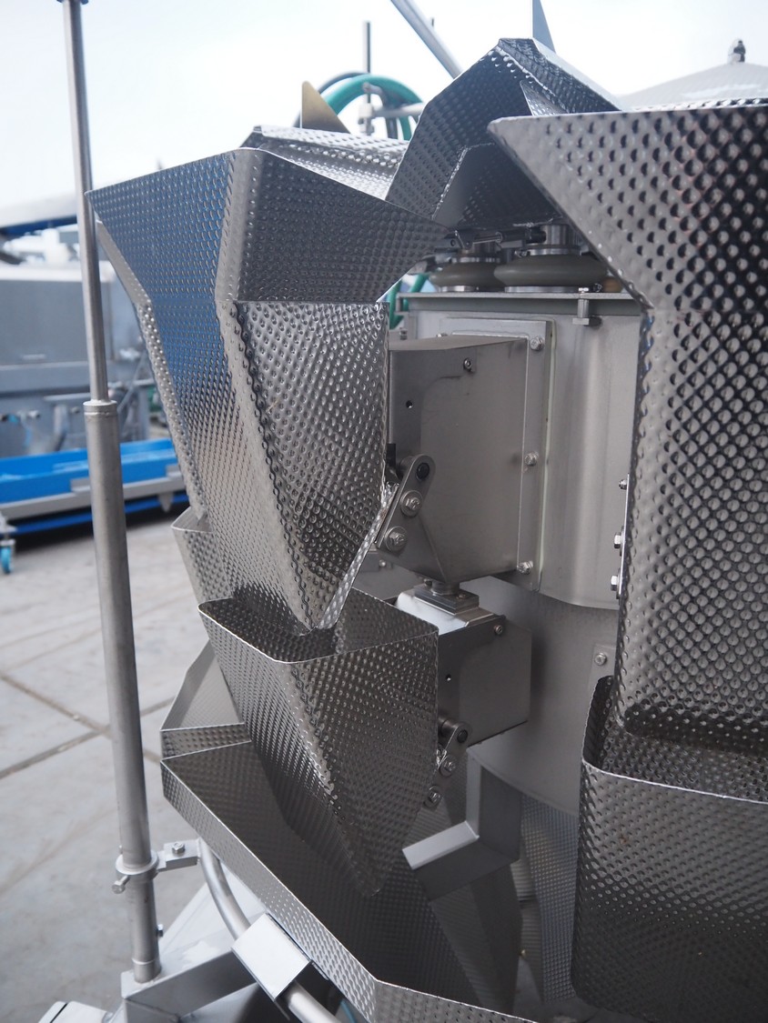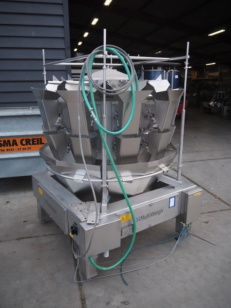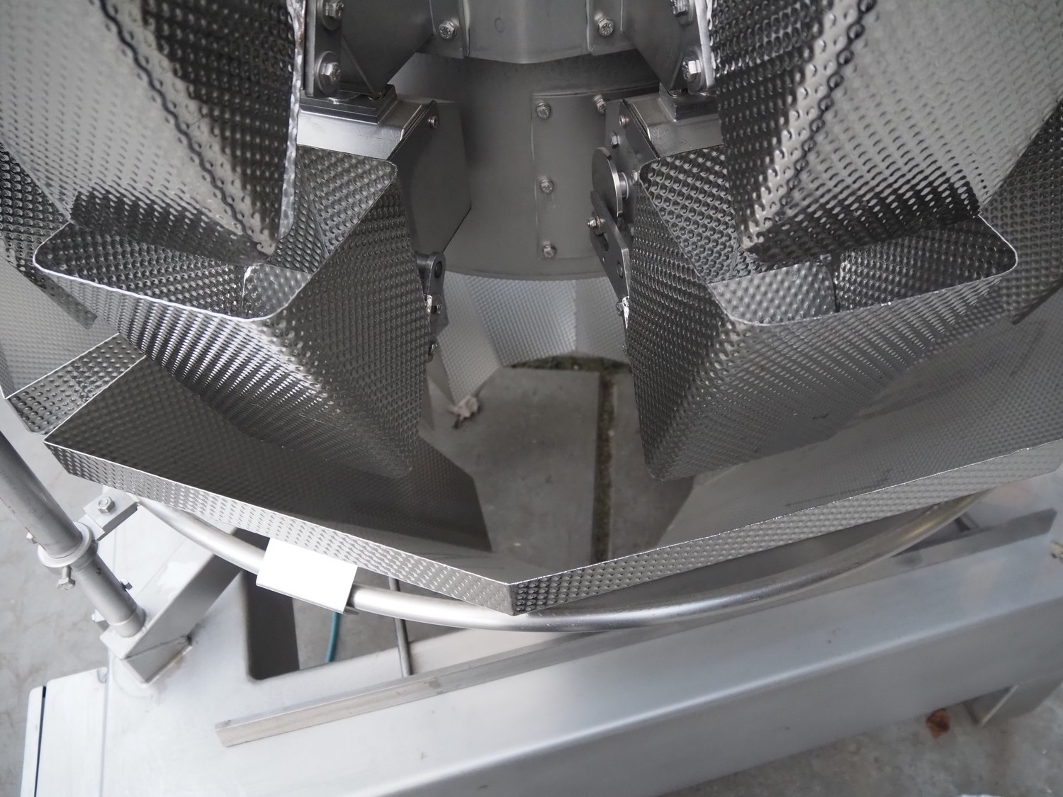 MultiWeigh 10-heads multihead weigher, type: HDW 10-2.0-60, serial number: X0759, year of construction: 02.2014, 230 V, 1 Ph, 50 Hz, minimum weight: 45 g, maximum weight: 1000 g, d=1/2 g, dimensions: 1250 mm x 1300 mm x 1800 mm. Incomplete, missing one outfeed gutter.