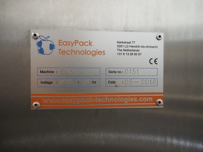 EasyPack Technologies bag filling machine, type: ELS, serial number: 0151, year of construction: 05-2018, 400 V, 50 Hz, plastic mesh belt, belt width: 220 mm, total dimensions: 5200 mm x 2000 mm x 1800 mm.