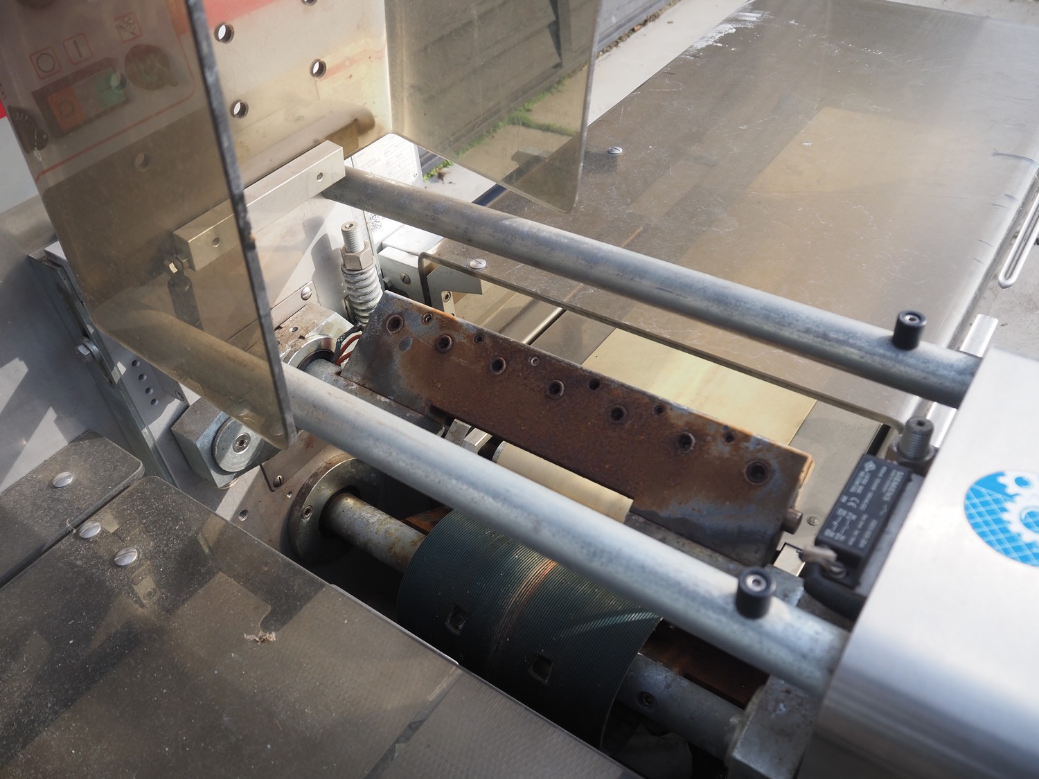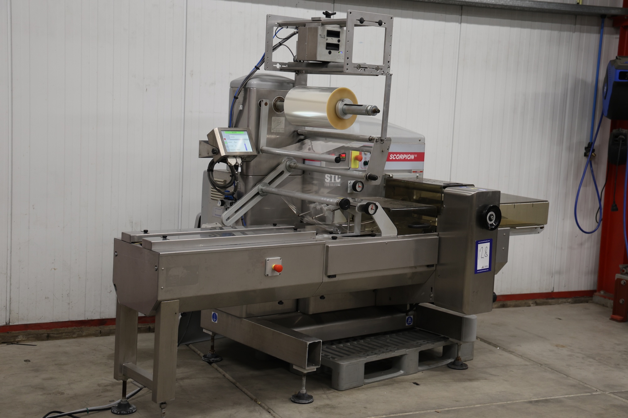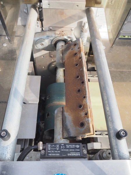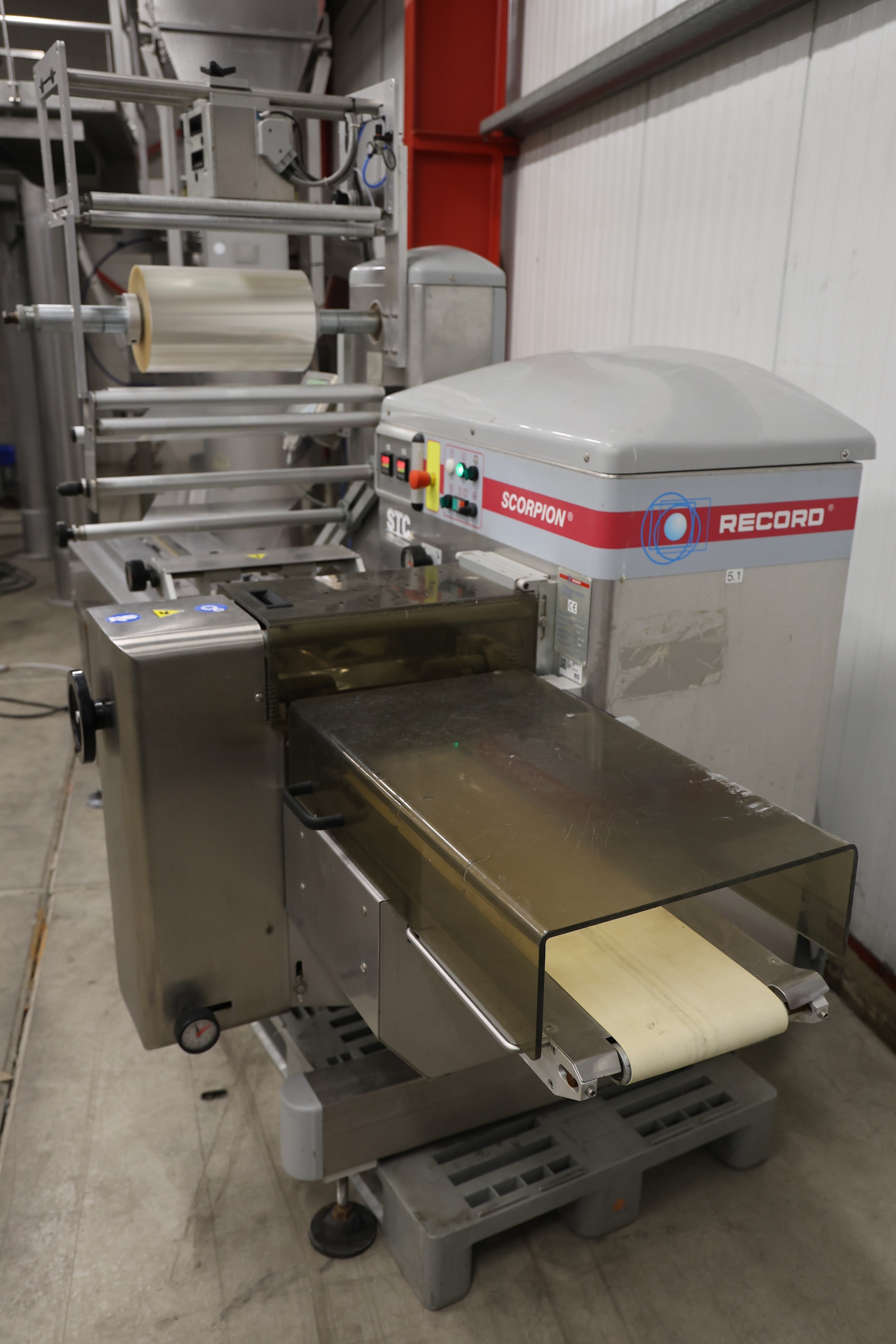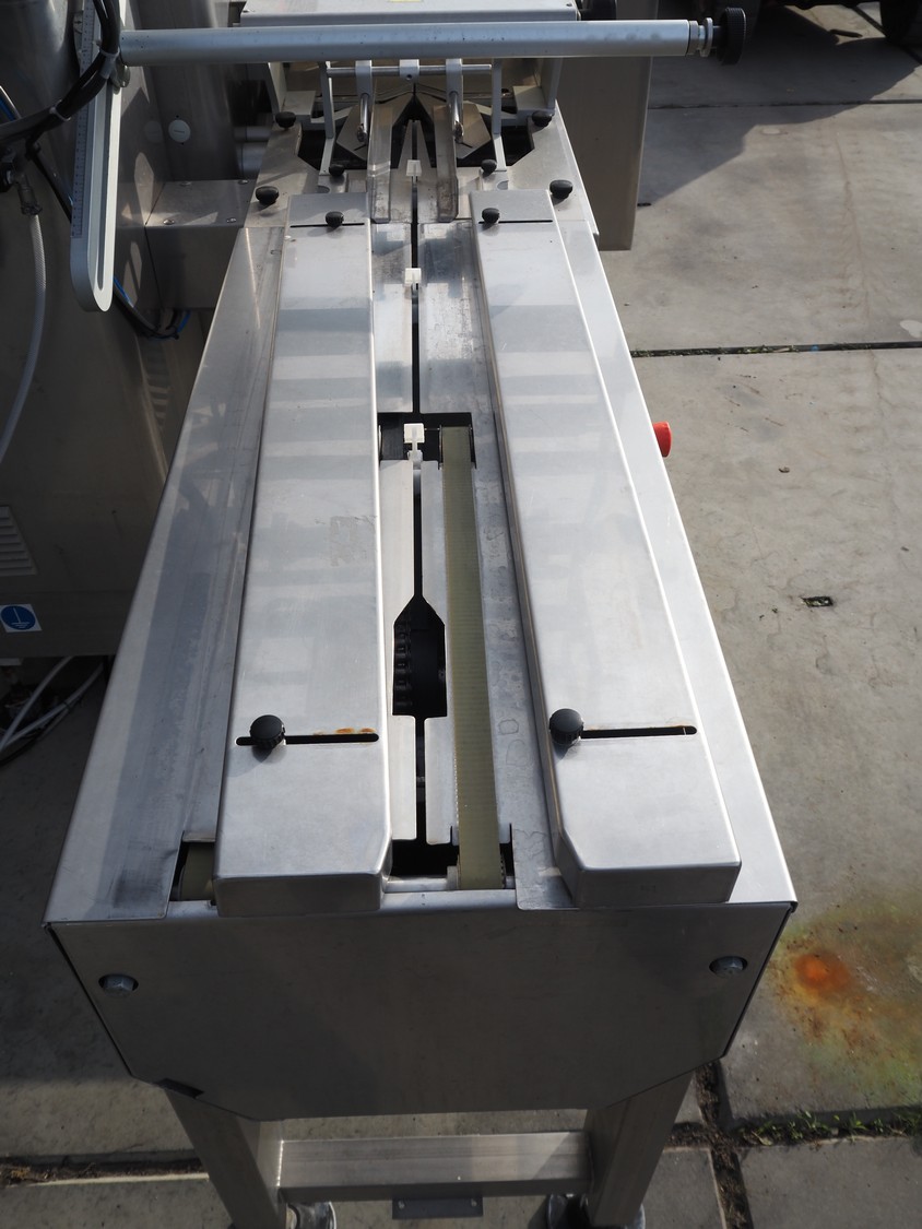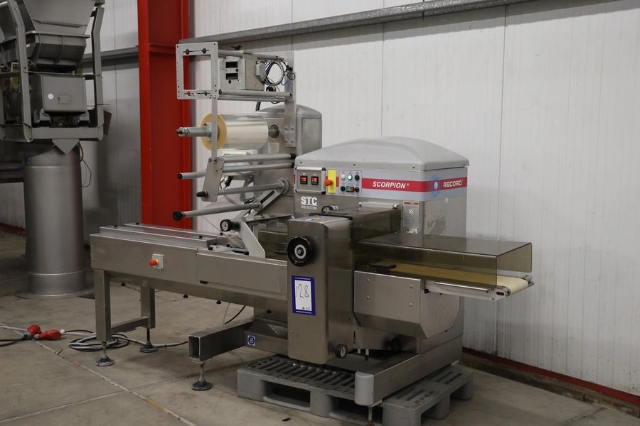 Record flowpacker, model: SCORPION, 380 V, 3 Ph, 50/60 Hz, 4000 W, seal length: 330 mm, plastic outfeed belt, belt width: 210 mm, total dimensions: 2900 mm x 1400 mm x 2050 mm. Cover is broken.