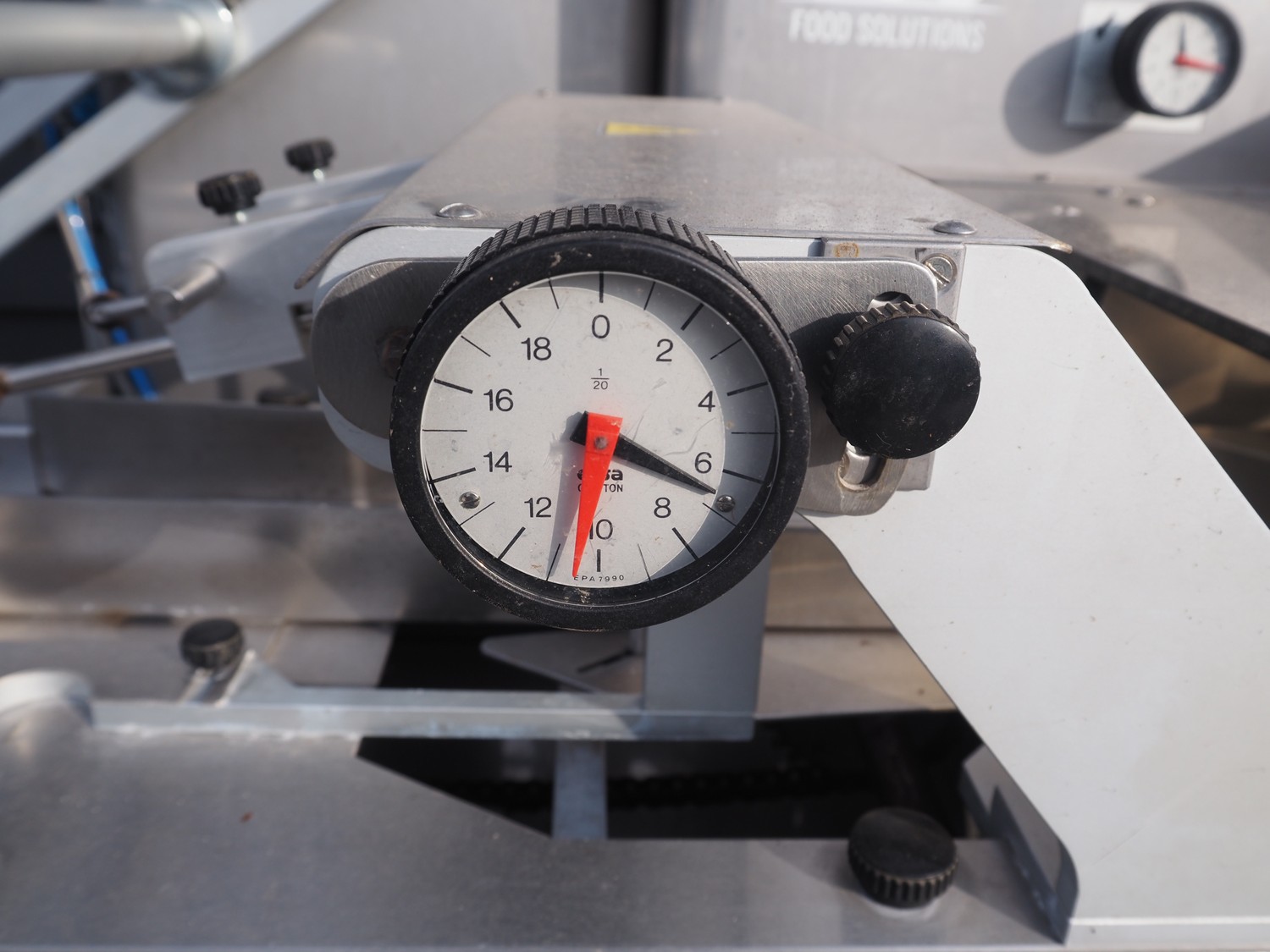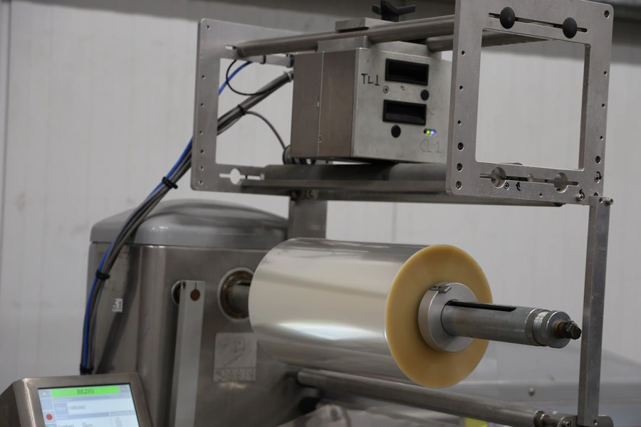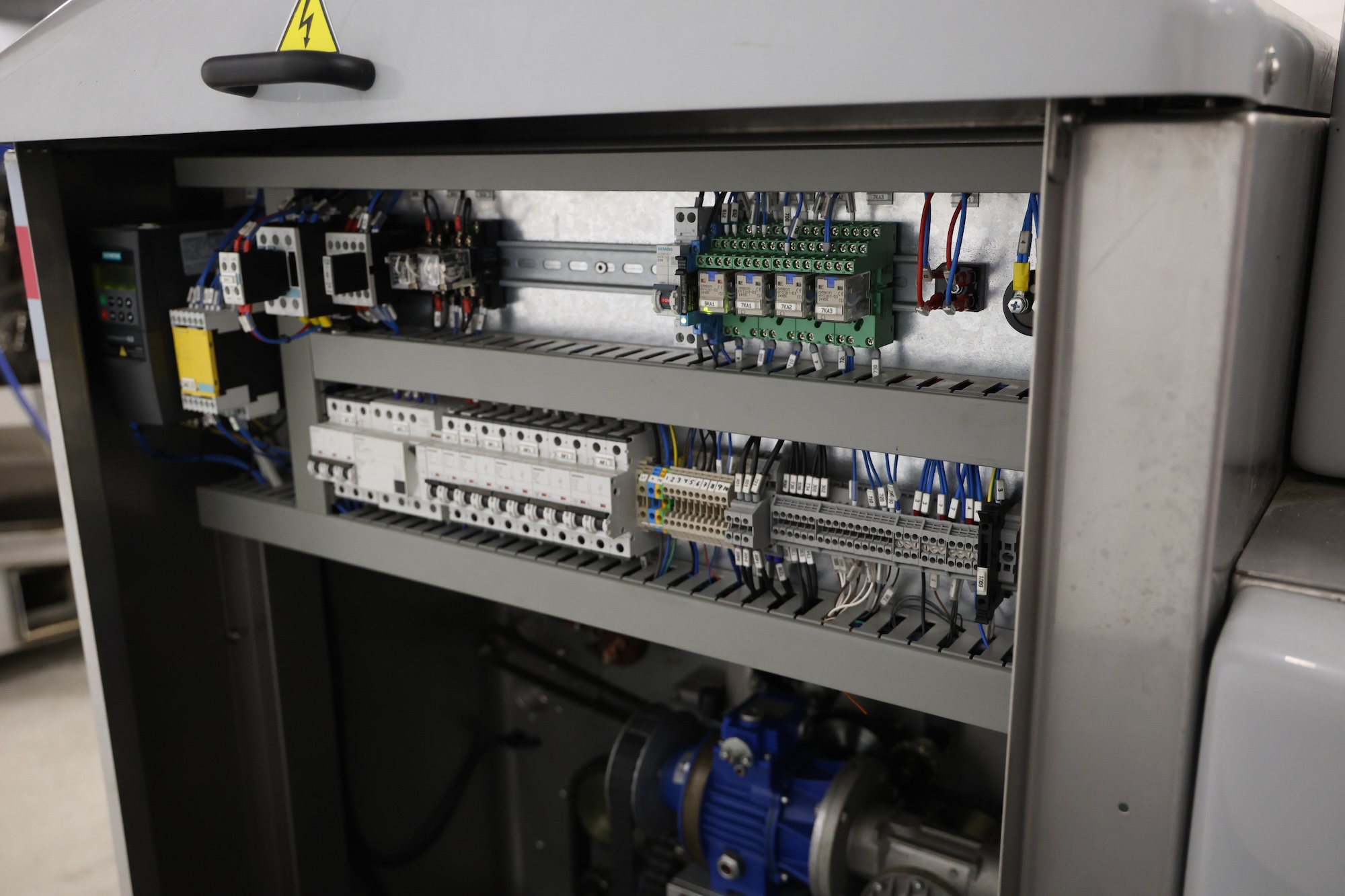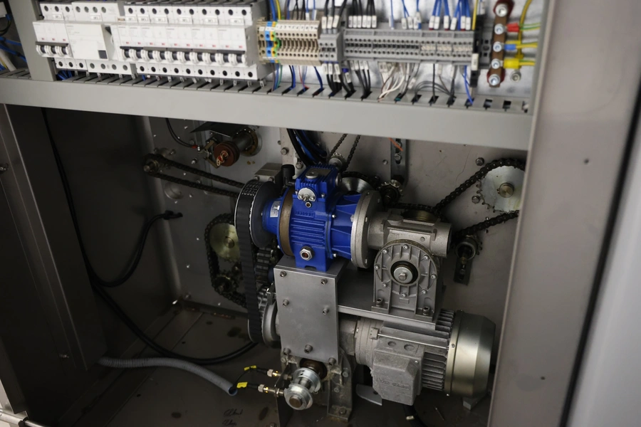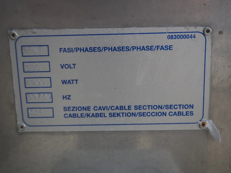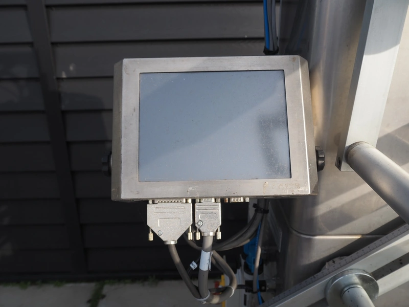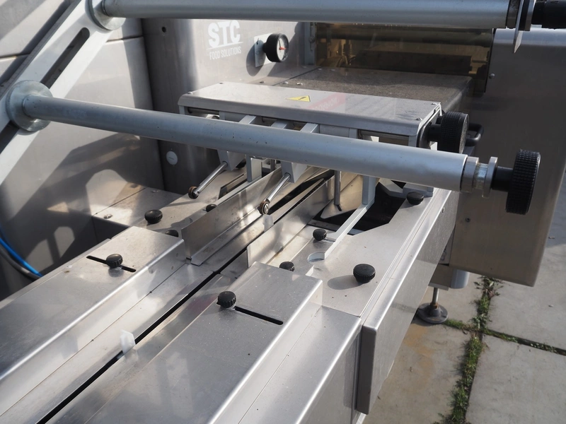 Record flowpacker, model: SCORPION, 380 V, 3 Ph, 50/60 Hz, 4000 W, seal length: 330 mm, plastic outfeed belt, belt width: 210 mm, total dimensions: 2900 mm x 1400 mm x 2050 mm. Cover is broken.
